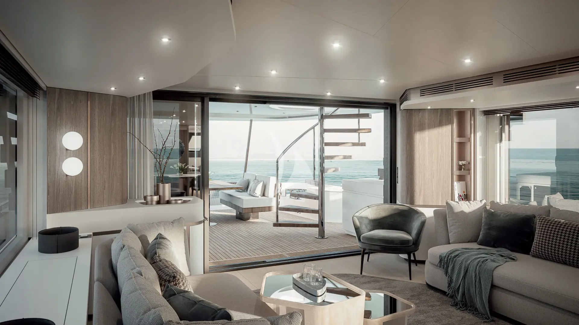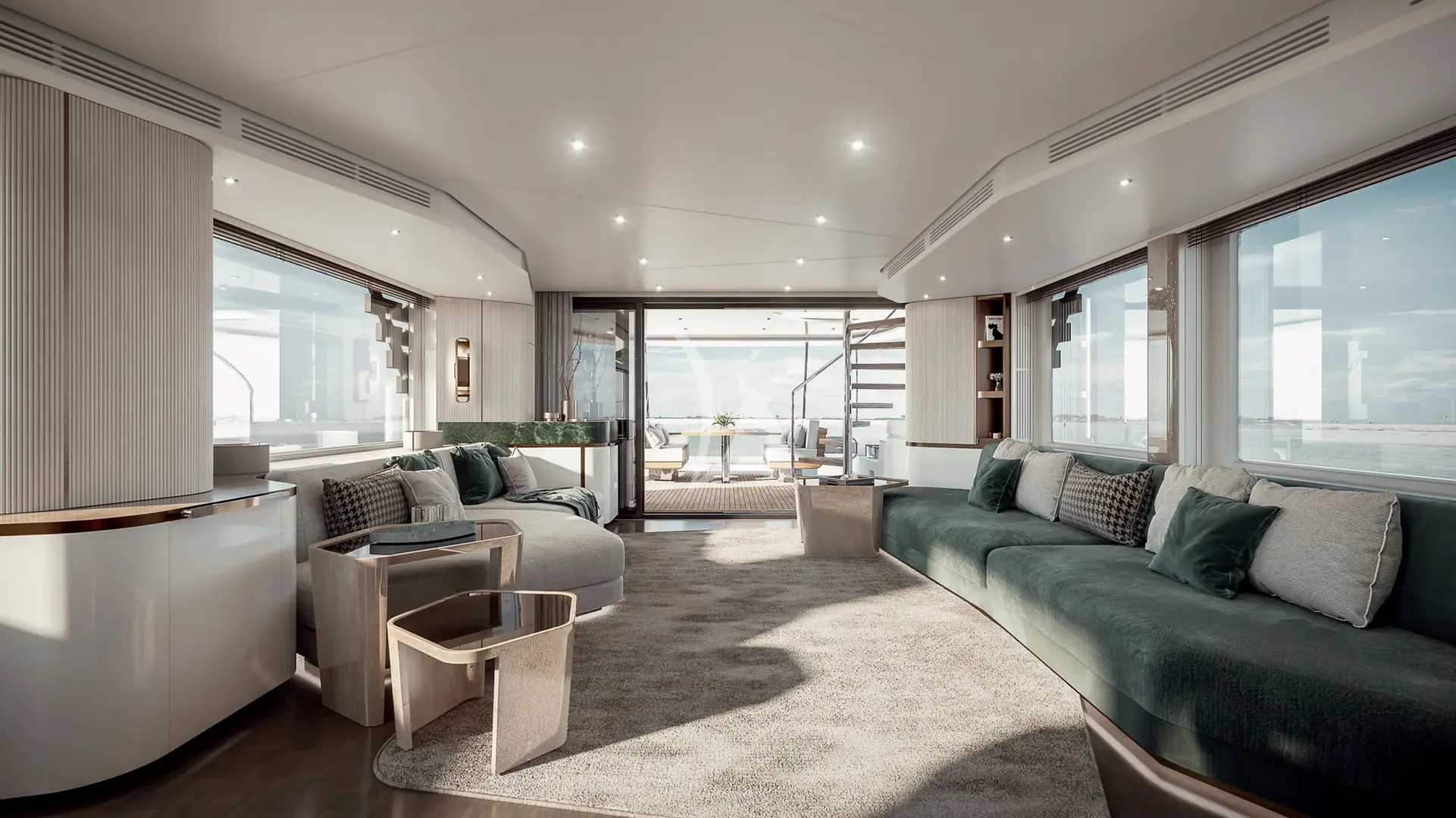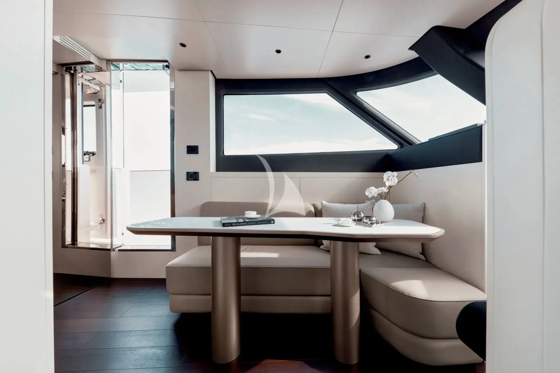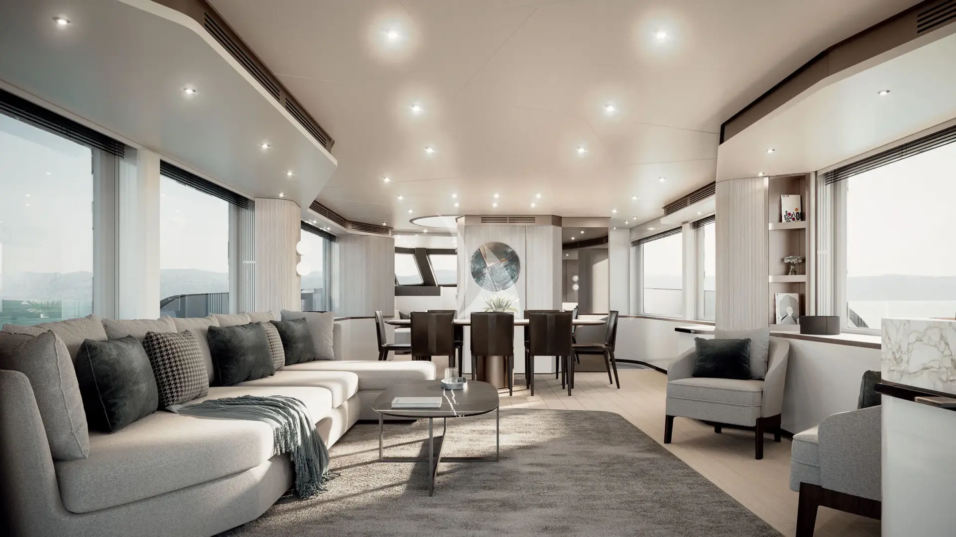 The interior features a light, modern aesthetic with soft marine tones and clean architectural lines. Large panoramic windows flood the main deck with natural light, enhancing the sense of volume and openness throughout the living spaces. Carefully selected materials and finishes strike a balance between sophistication and durability, ensuring comfort and practicality for charter operations.