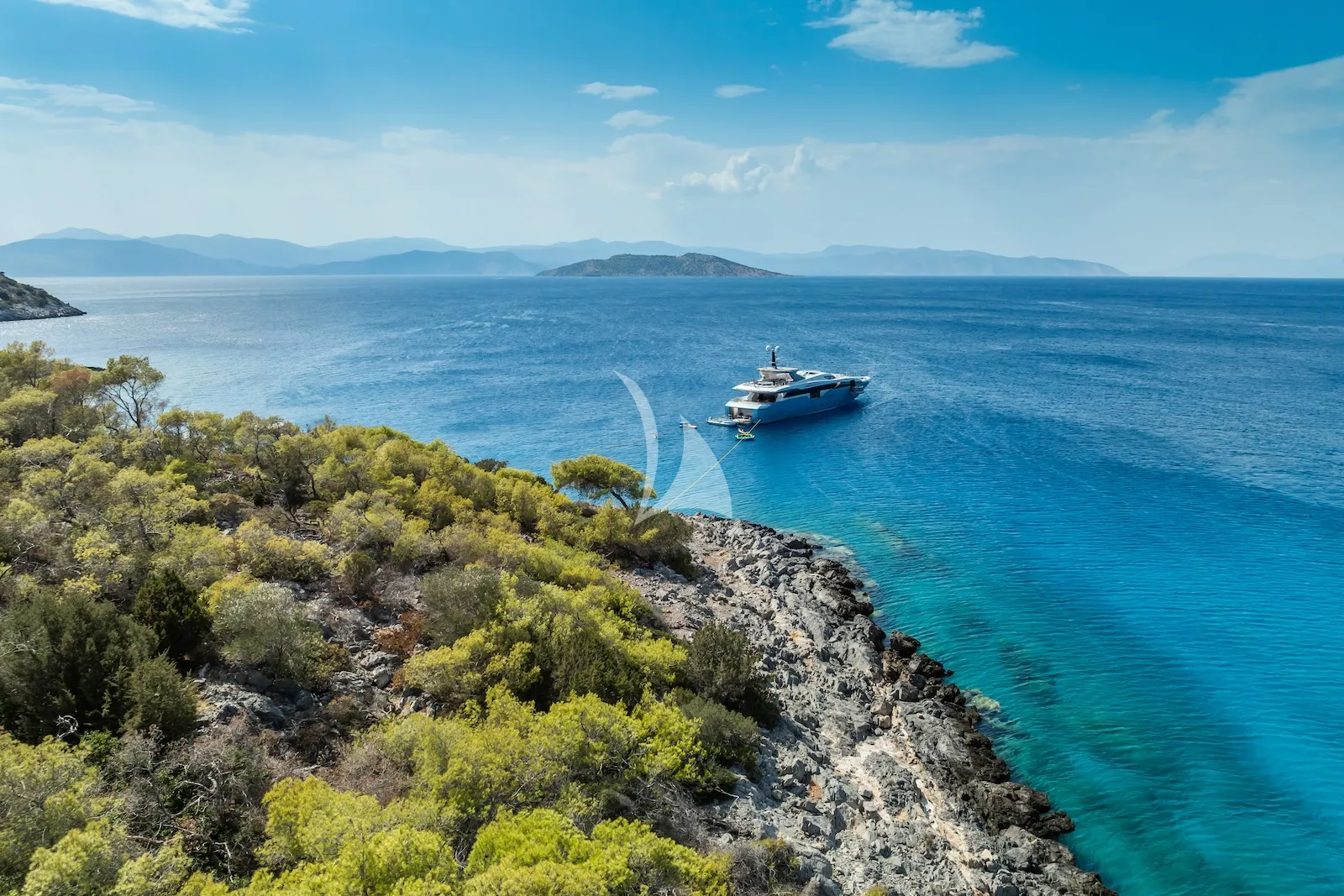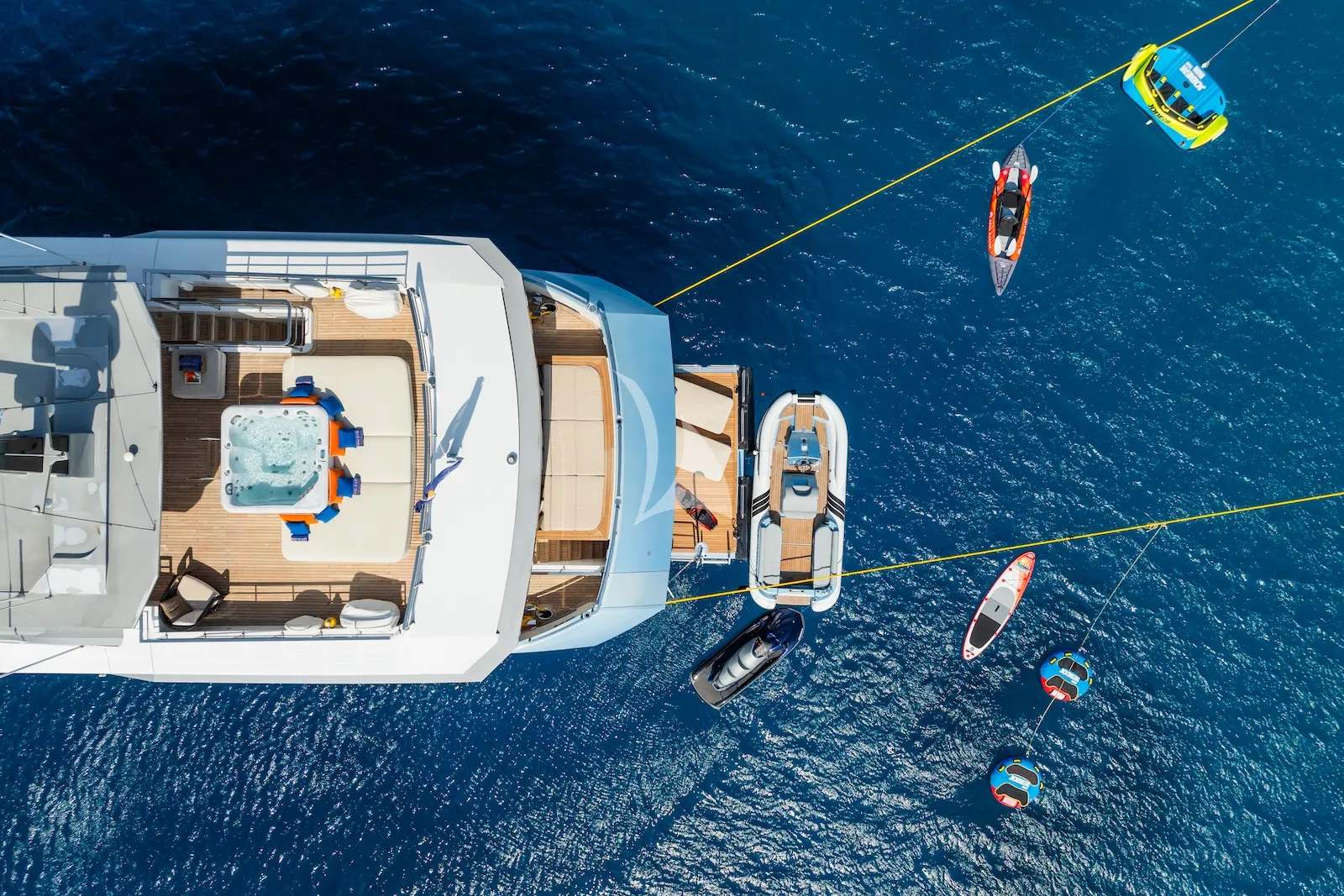 BLUE MOON is also equipped with a wide range of water toys and features an expansive beach club, offering a perfect combination of style, comfort, and performance for an exceptional charter experience.