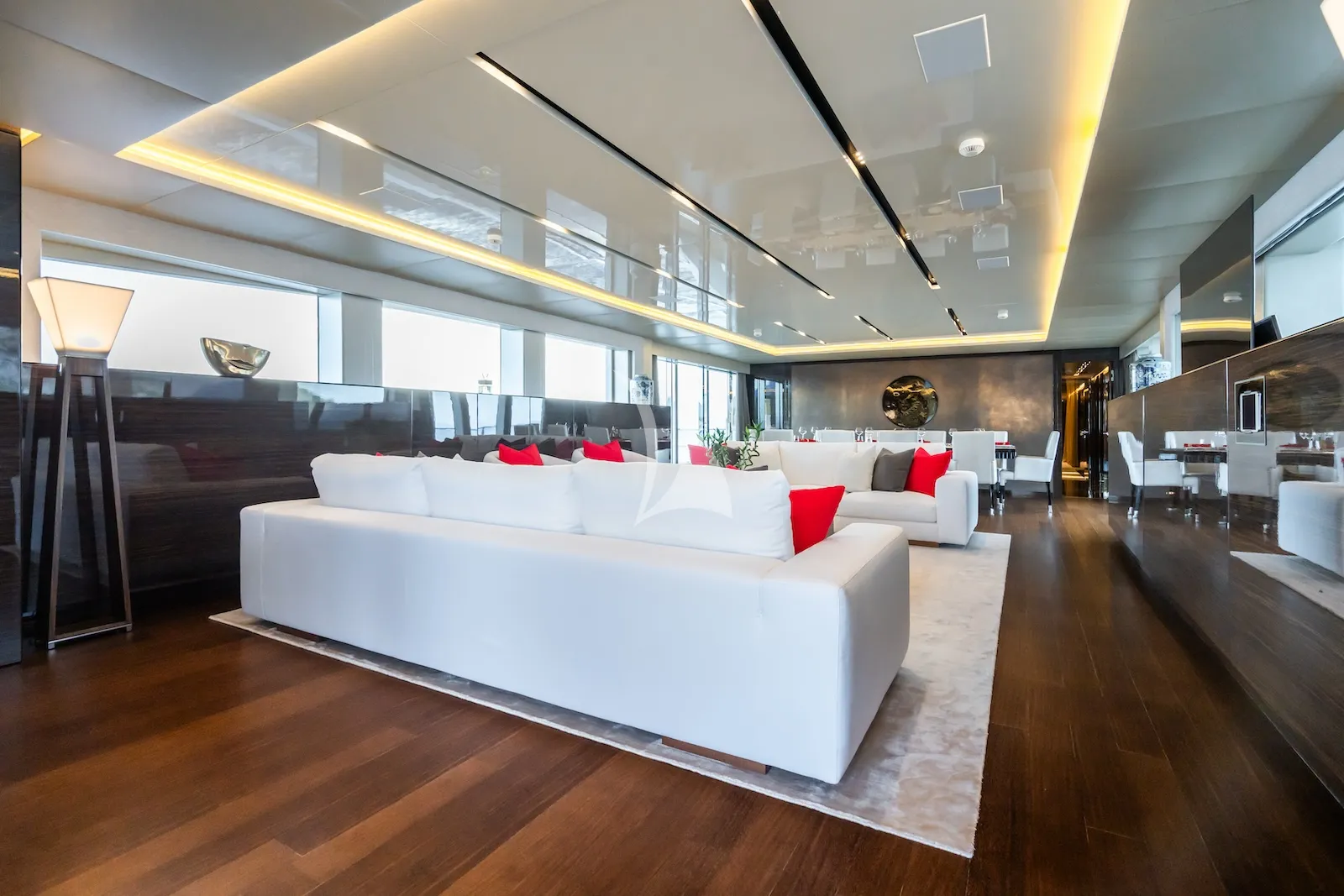 Accommodation includes five luxurious staterooms for up to 10 guests. The master suite, located on the main deck, is particularly spacious with a private balcony, gym, his-and-hers walk-in wardrobes, and a dressing room. The en suite is adorned by high-end finishes including a white onyx and black marble bathtub, his and her sinks and a large shower. Two additional VIP staterooms and two twin rooms, which are all en suite, ensure comfort and privacy for all guests.