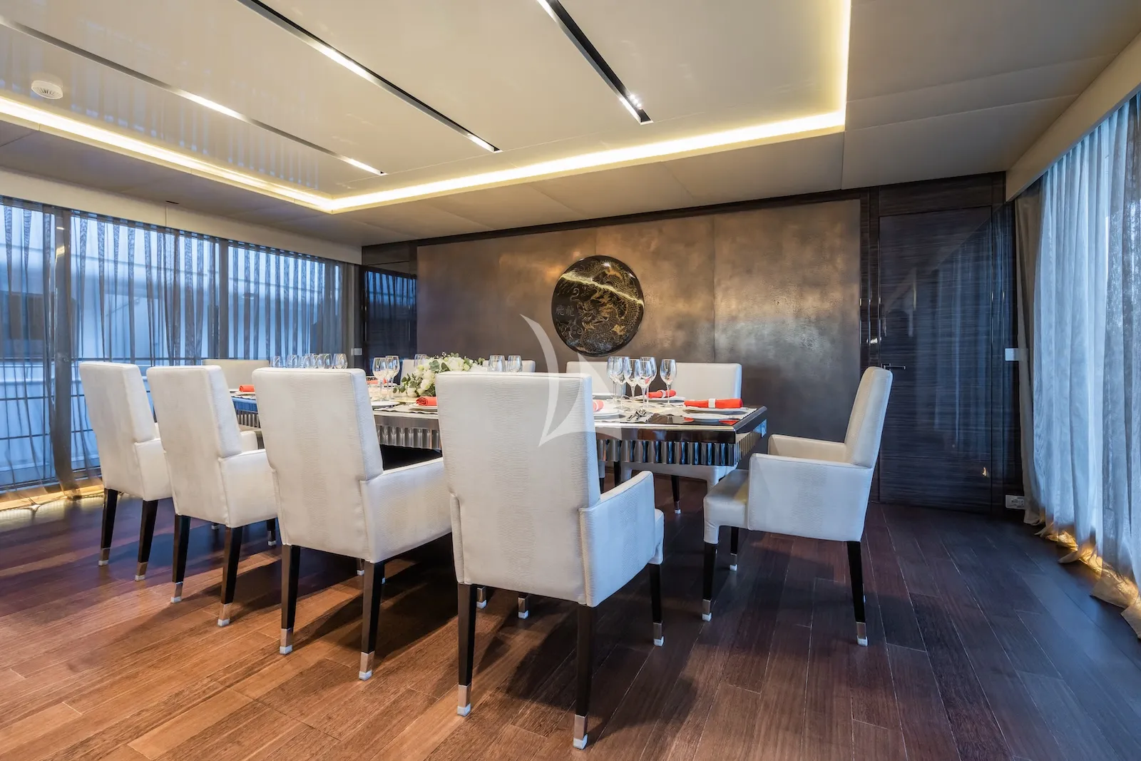 The yacht's expansive flybridge includes a large Jacuzzi, sunbathing area, and a large teak dining table for 10 guests, ideal for outdoor entertainment. The main saloon, with sliding doors leading to a shaded aft lounge, offers a relaxing retreat. Inside, the yacht’s chic design features a elegant dining room with a statement bronze wall design.