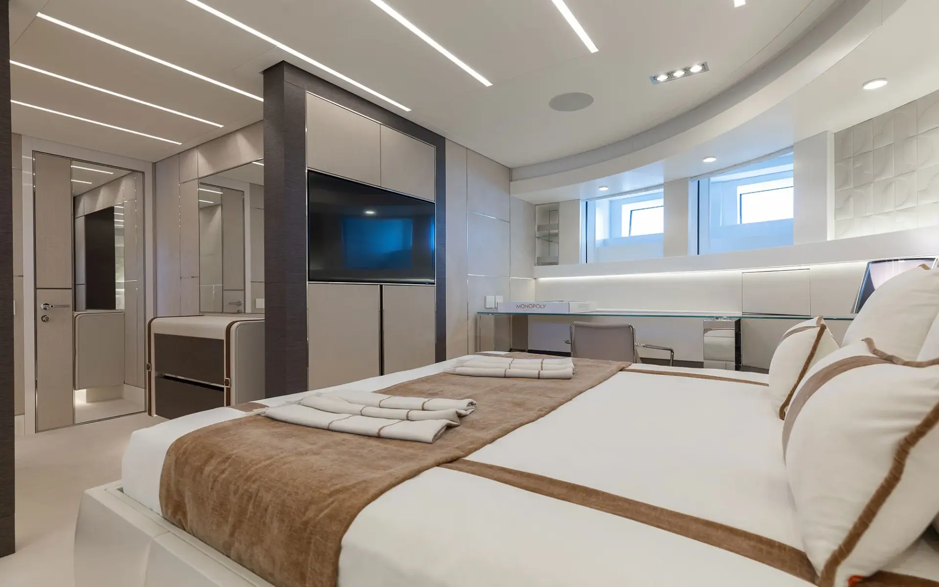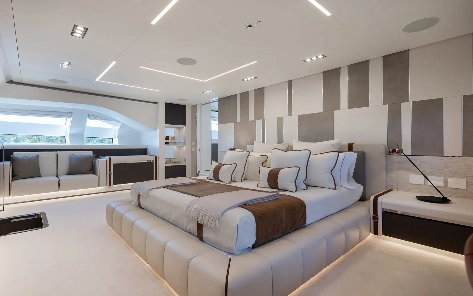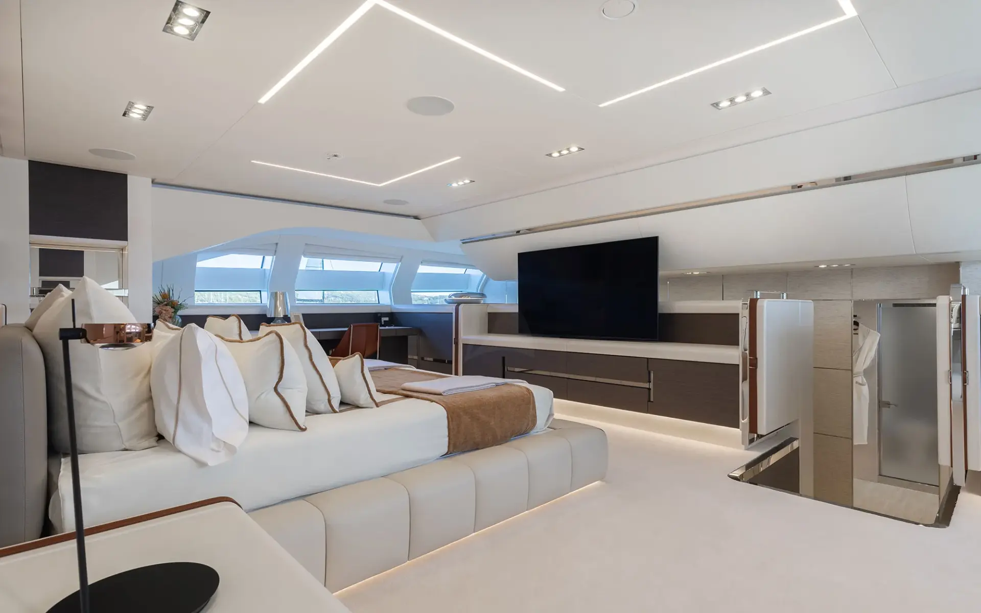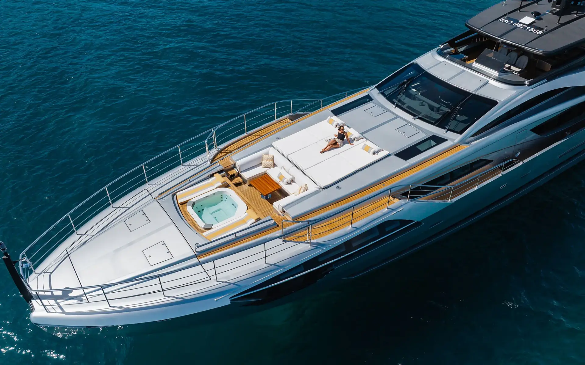 The impressive Pershing offers a sleek, sporty exterior and a modern Italian interior with large windows allowing a seamless blend with the outdoors. CABO can accommodate then guests comfortably across five luxurious staterooms including an on deck full beam Master. Four stylish and plush staterooms, all ensuite, are situated below. The top-tier amenities are endless, from the bow Jacuzzi surrounded by sunpads and optional shade, to the generous fold out beach club filled with toys and entertainment.