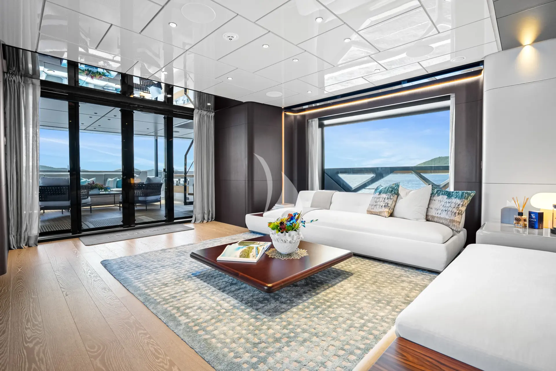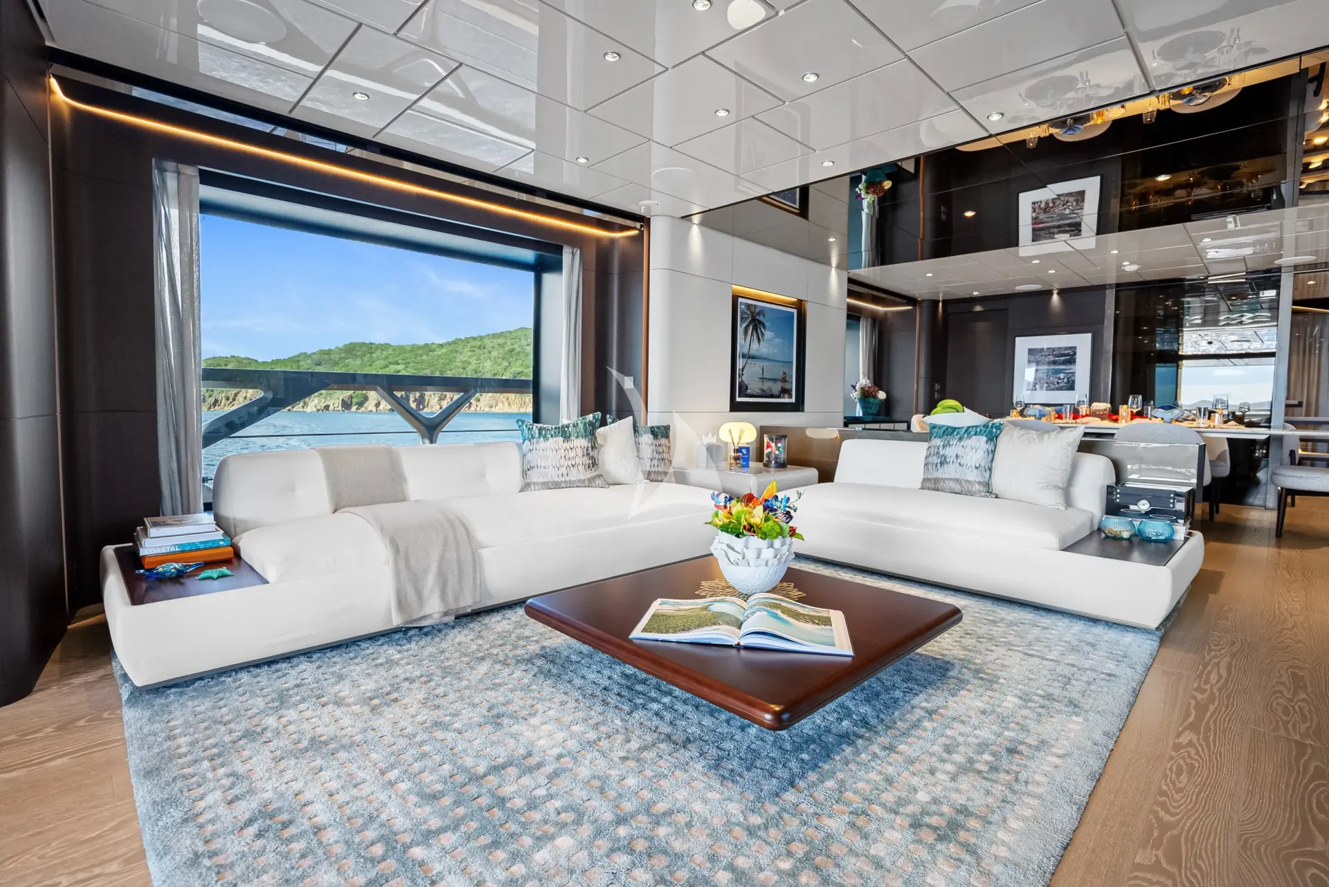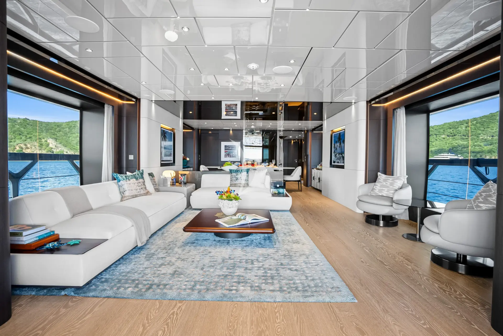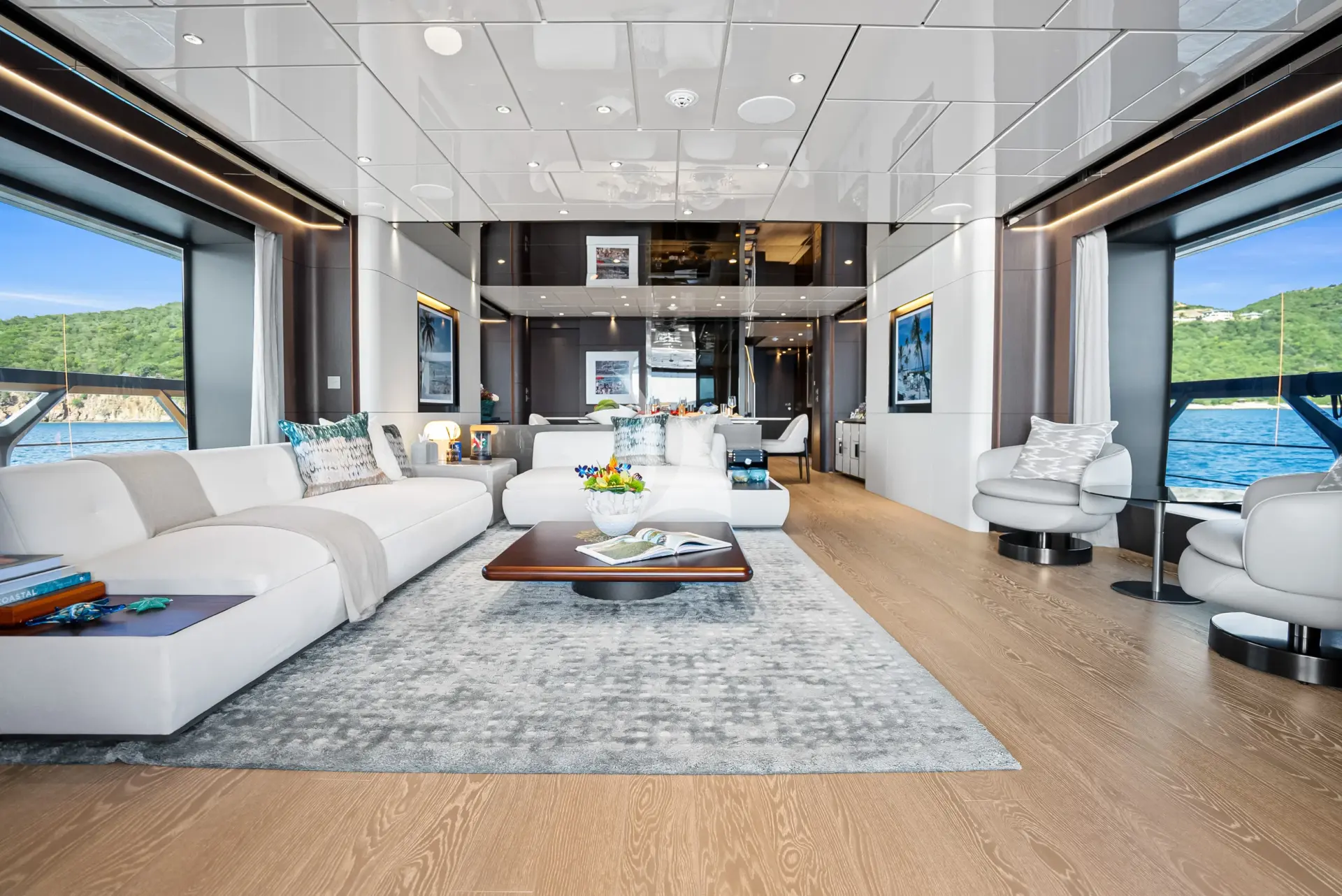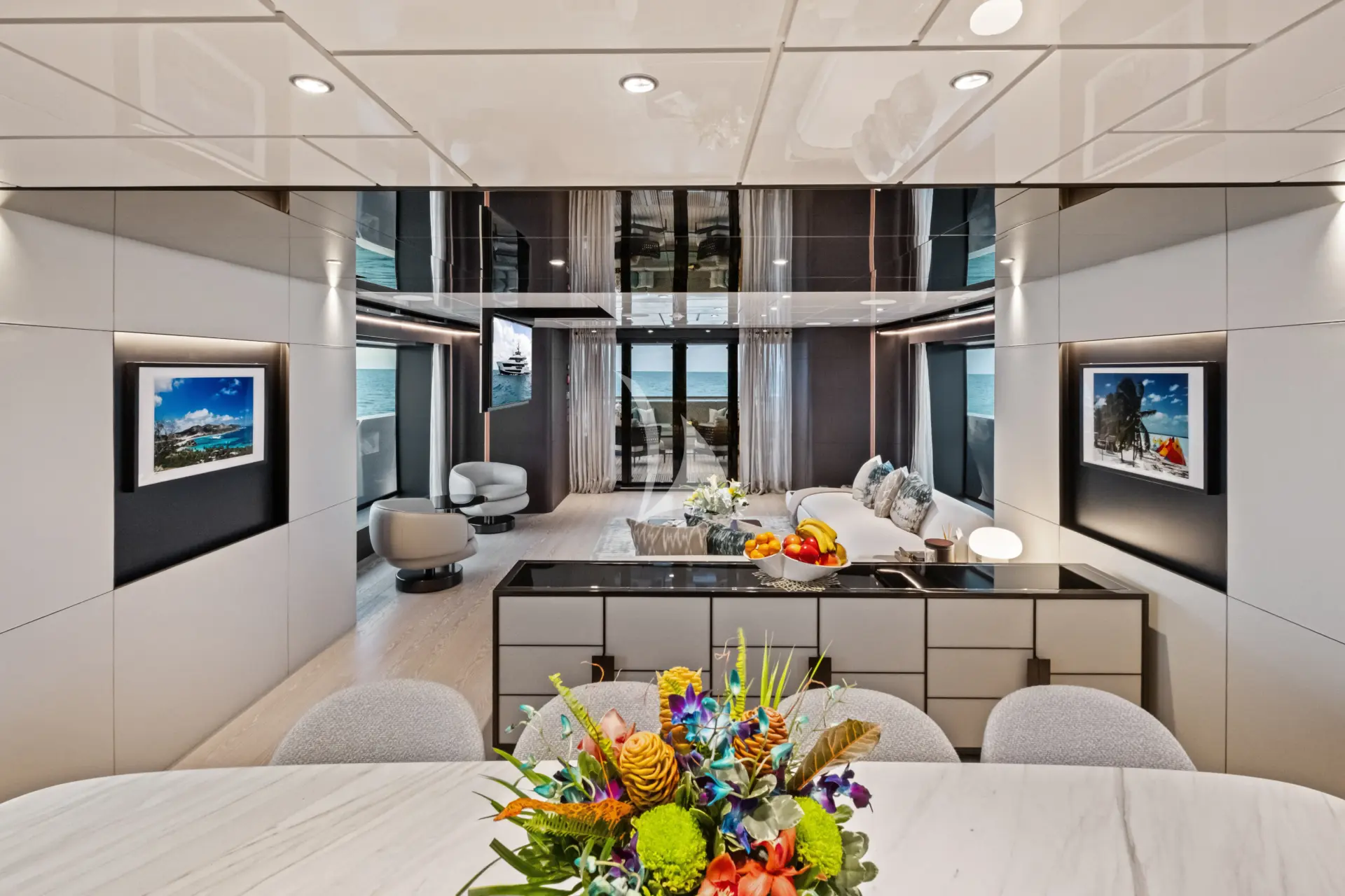 Guests are welcomed aboard via the main deck aft lounge. Through automatic sliding glass doors, the main salon reveals a soft, contemporary design with a mix of sofas, lounge chairs, and a central coffee table, all surrounded by floor-to-ceiling windows. A formal dining area for 10 sits just forward, offering a warm, convivial setting for evening meals or celebratory occasions.