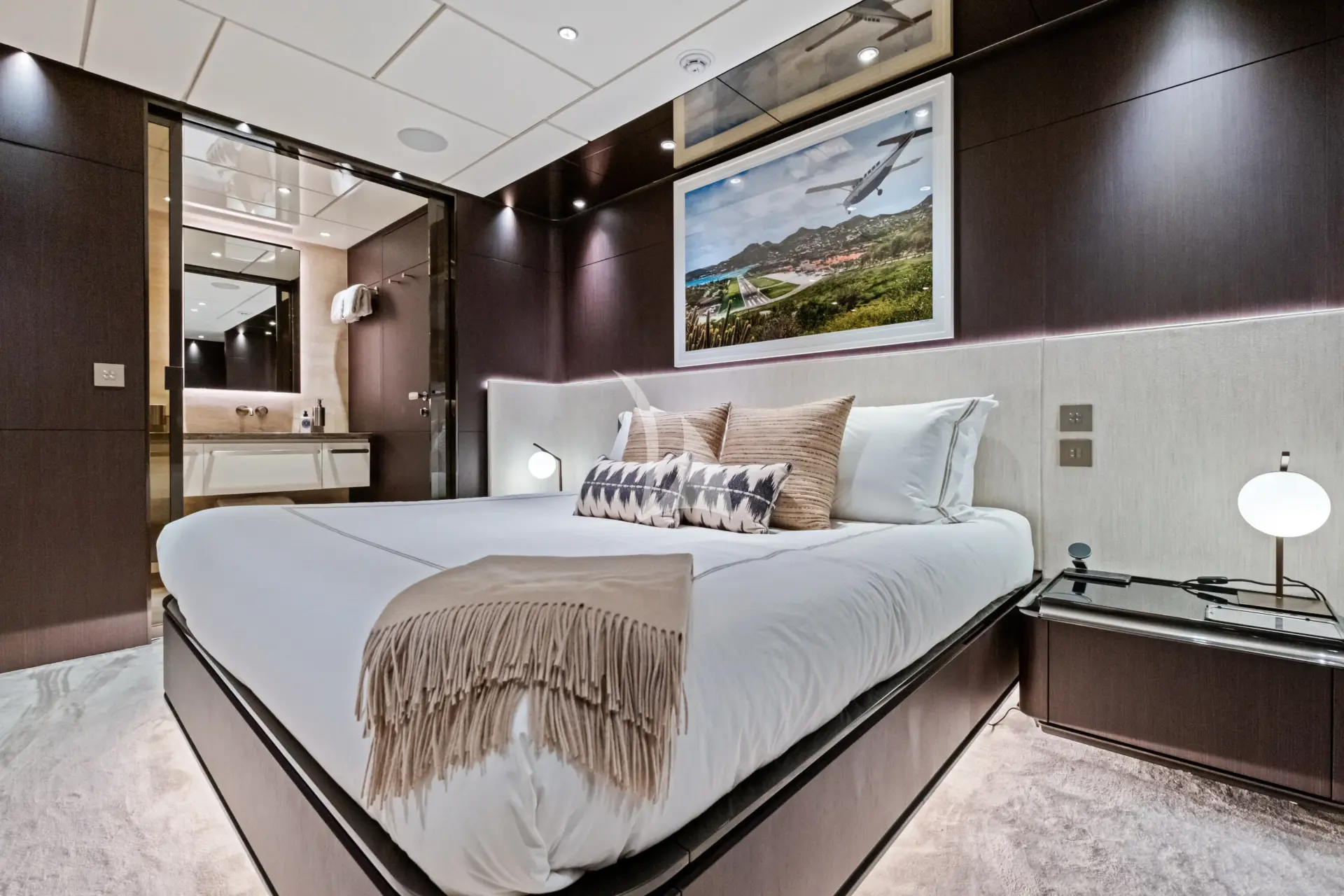 The full-beam master stateroom on the main deck is a sanctuary in its own right, featuring generous closet space, his-and-hers en-suites, and sweeping sea views that flood the space with natural light. On the lower deck, accommodations comprise four staterooms for eight guests, including two VIP king suites aft, a queen cabin to starboard, and a twin cabin with Pullman to port that can convert for flexible configurations. The arrangement is ideally suited for families or mixed groups, while a dedicated crew of seven ensures seamless service throughout.