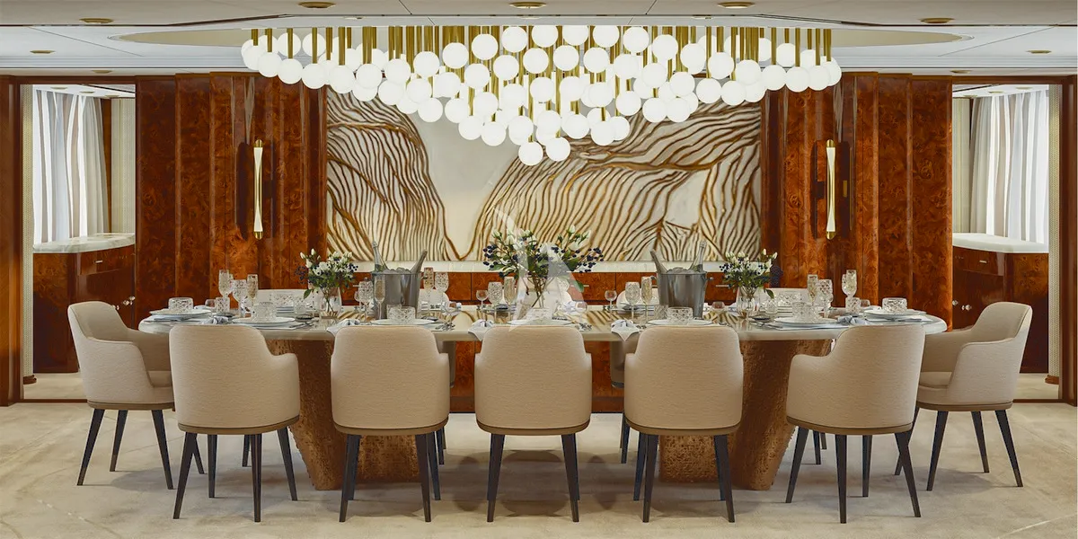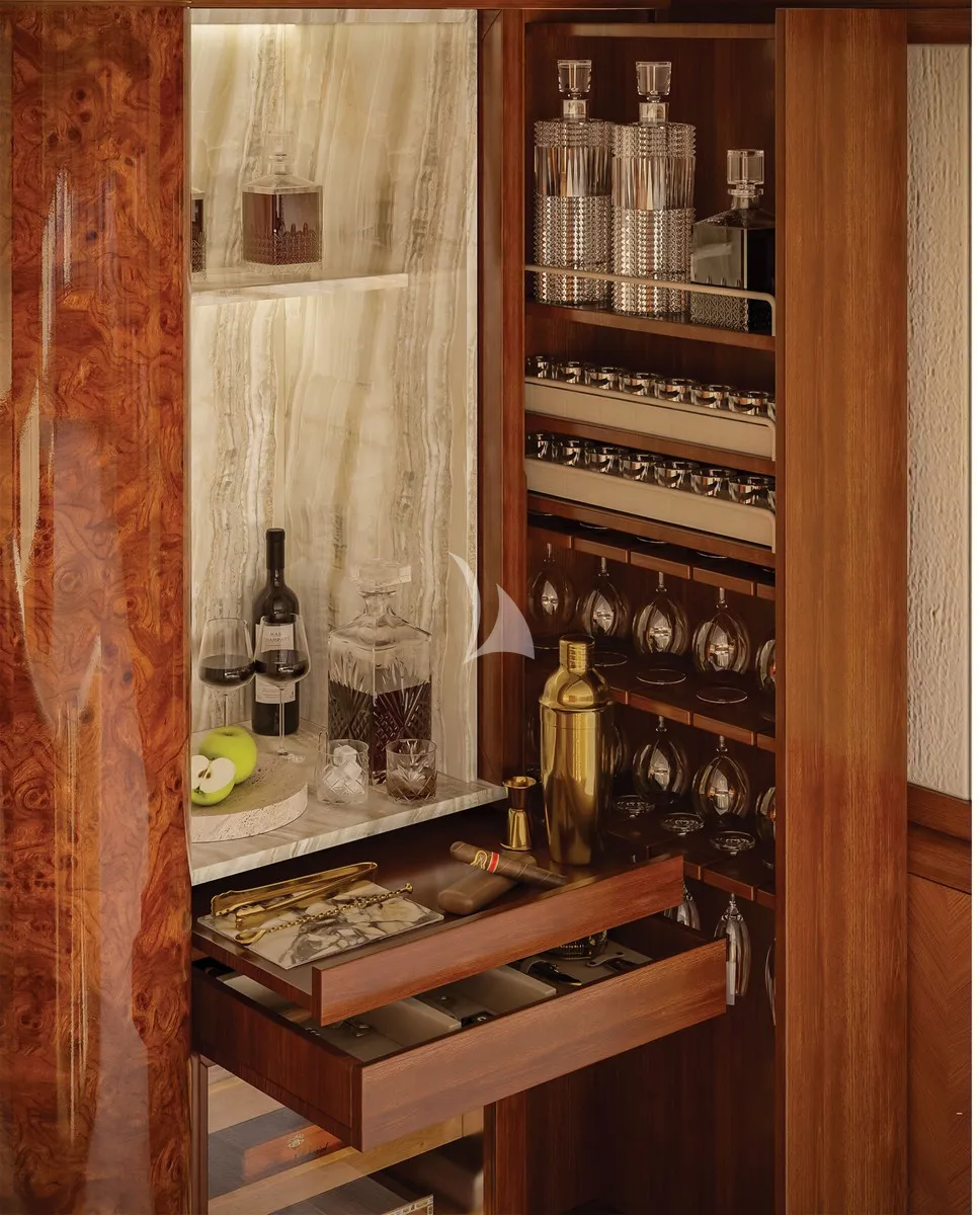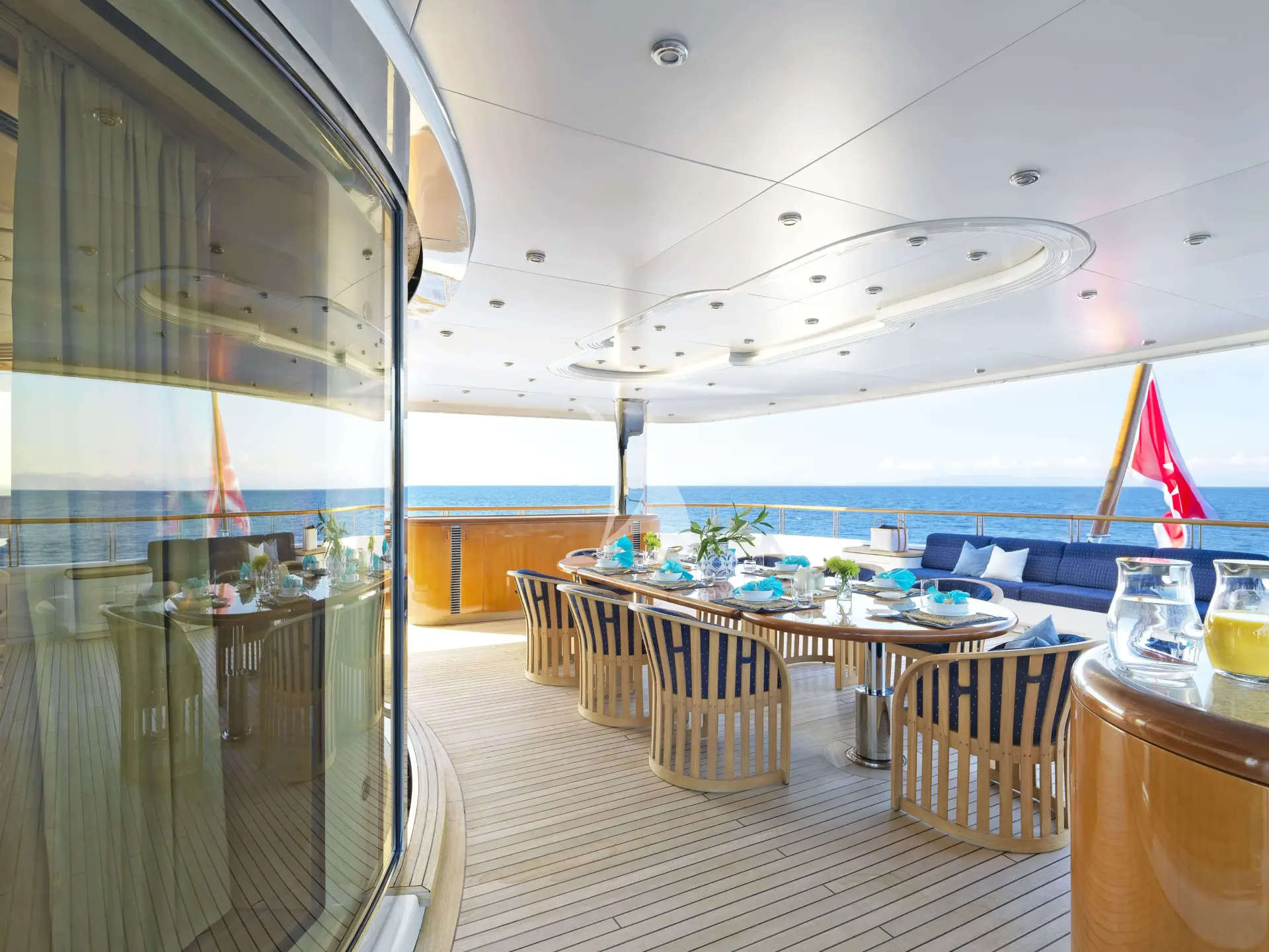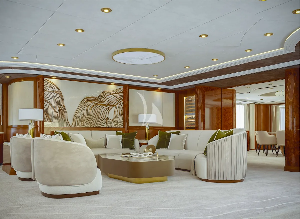 The yacht offers a fabulous range of contemporary spaces on board for relaxation and entertaining. A classically styled saloon and dining room featuring furniture of precious woods with luxury fabrics are located on the main deck, while the upper deck saloon is light and airy, offering amazing sea views.