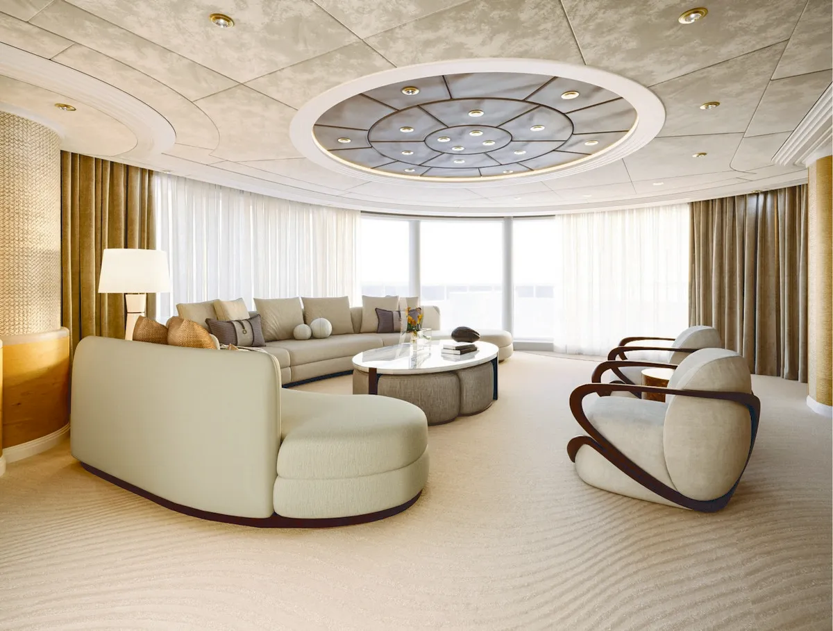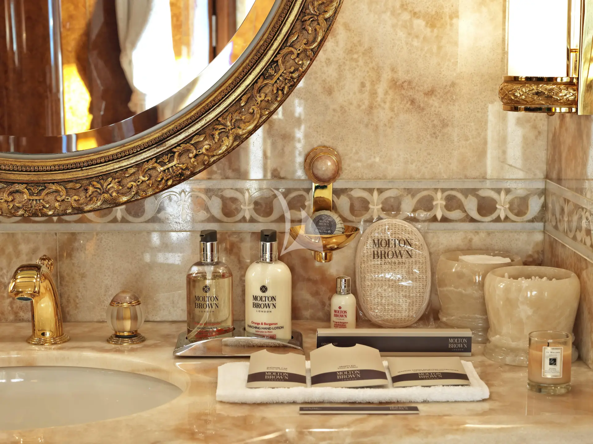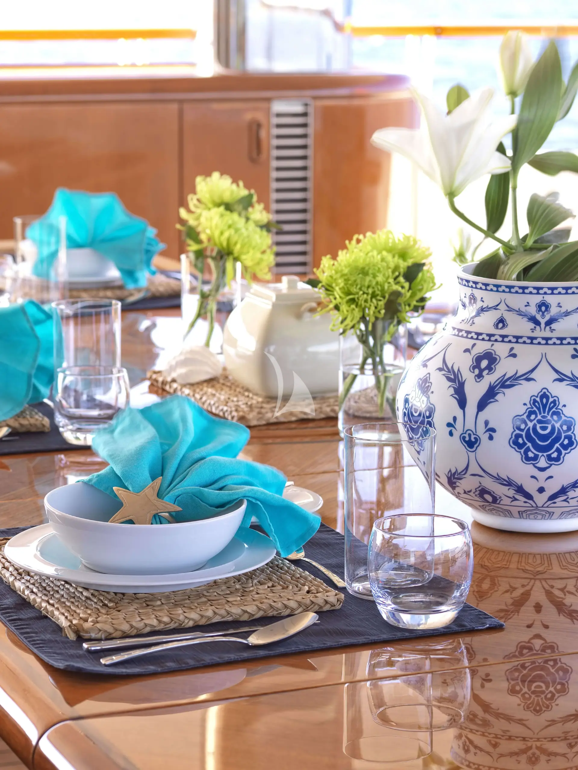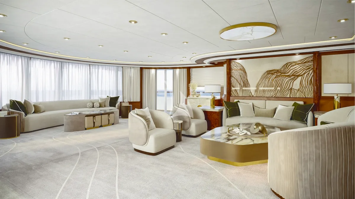 The yacht offers a fabulous range of contemporary spaces on board for relaxation and entertaining. A classically styled saloon and dining room featuring furniture of precious woods with luxury fabrics are located on the main deck, while the upper deck saloon is light and airy, offering amazing sea views.