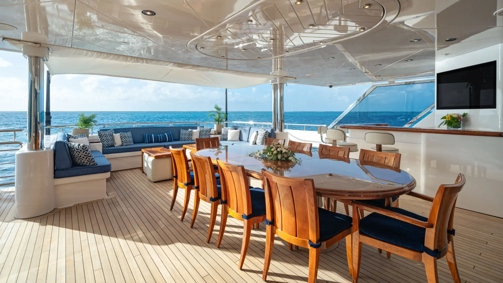 CHASING DAYLIGHT welcomes up to 12 guests in the sumptuous comfort of six staterooms. Each stateroom is beautifully appointed, creating an oasis to rest up for the next day ahead. The superyacht’s king-bed master stateroom is located on the main deck to offer added privacy. On the bridge deck, the motor yacht features a king VIP with a private balcony, which is the ideal place for morning coffee or to read a book. The yacht’s additional staterooms on the lower level include two king-bed staterooms, a convertible twin/king stateroom and a full-bed stateroom with a Pullman.