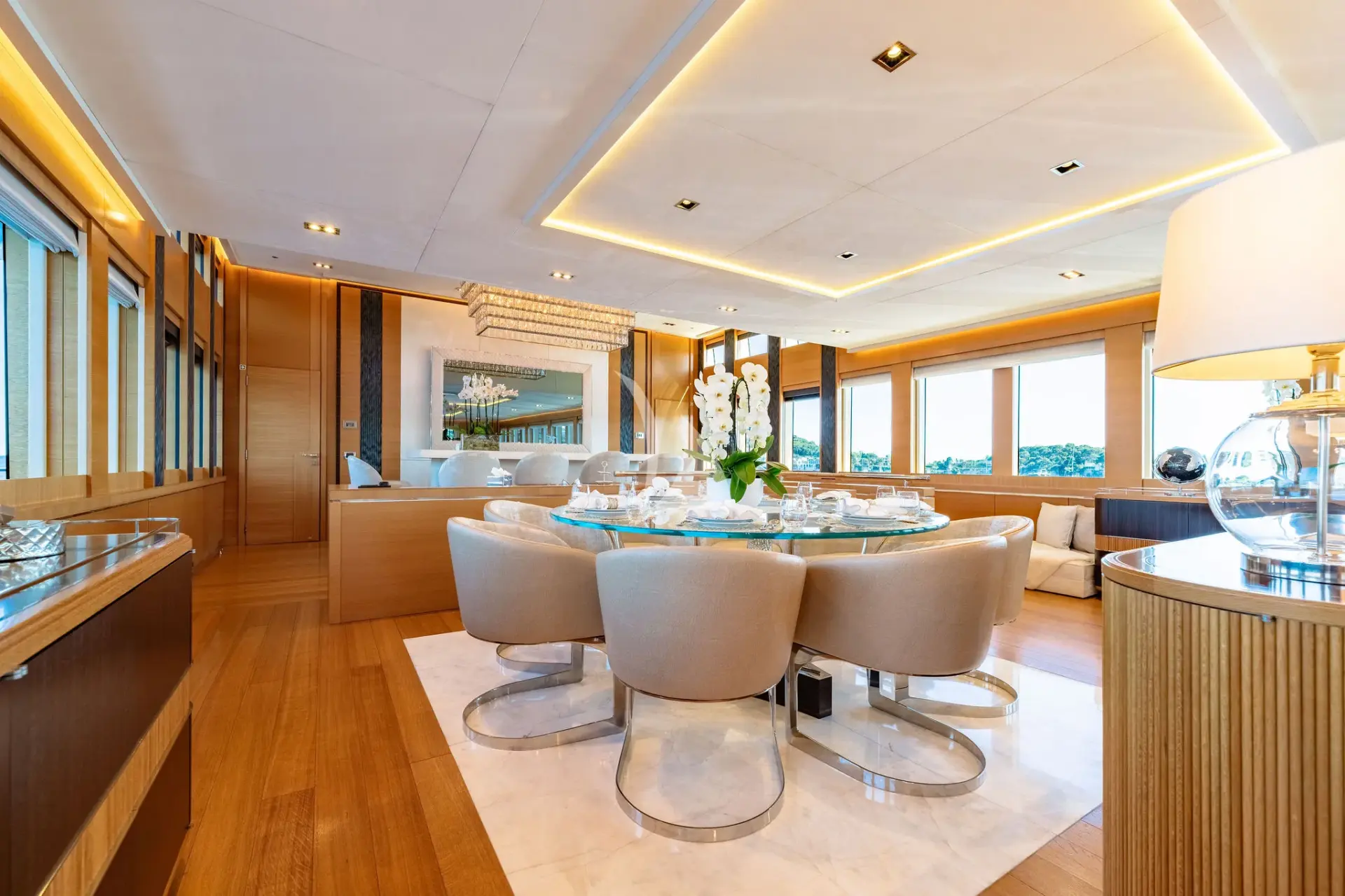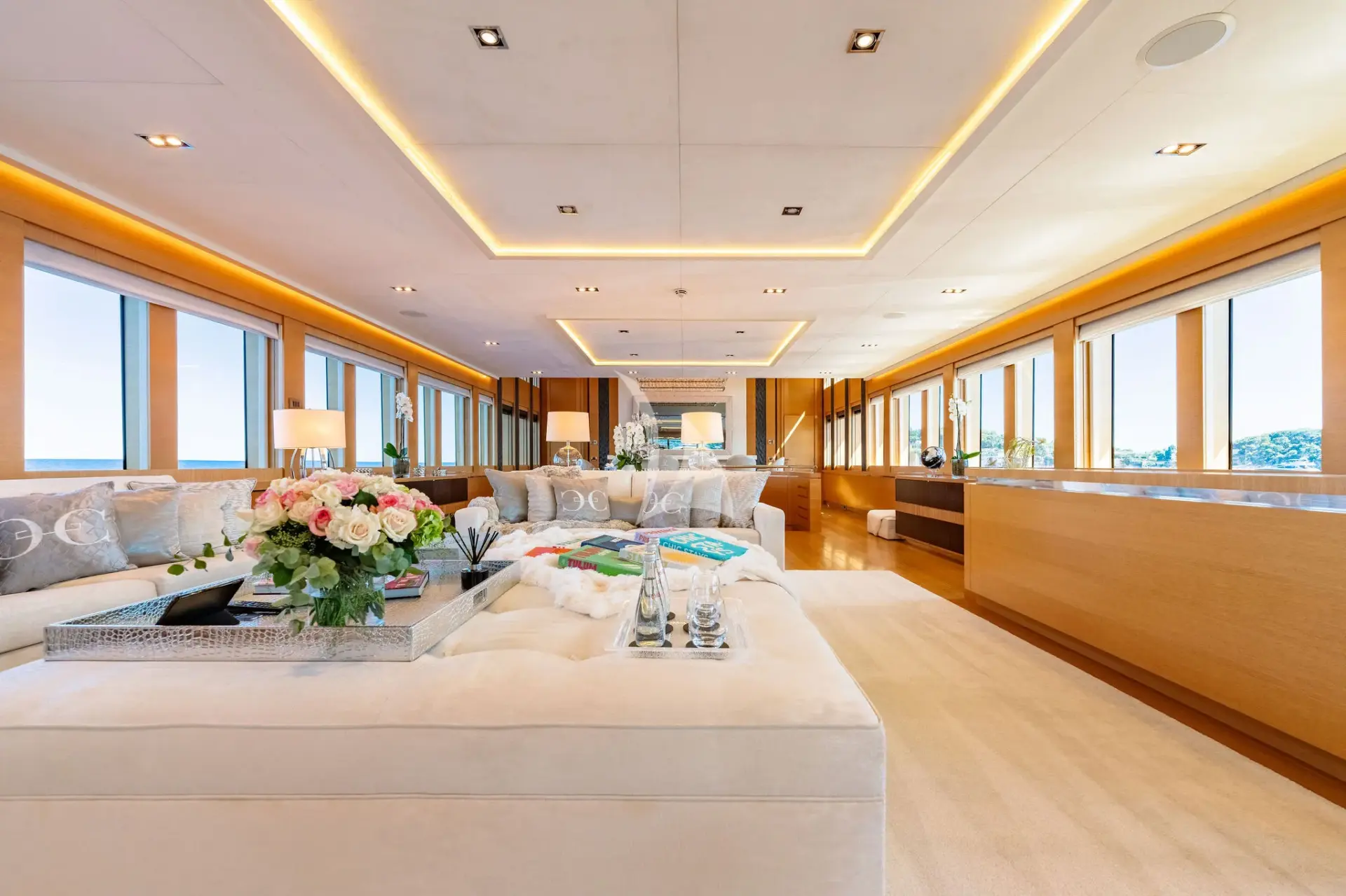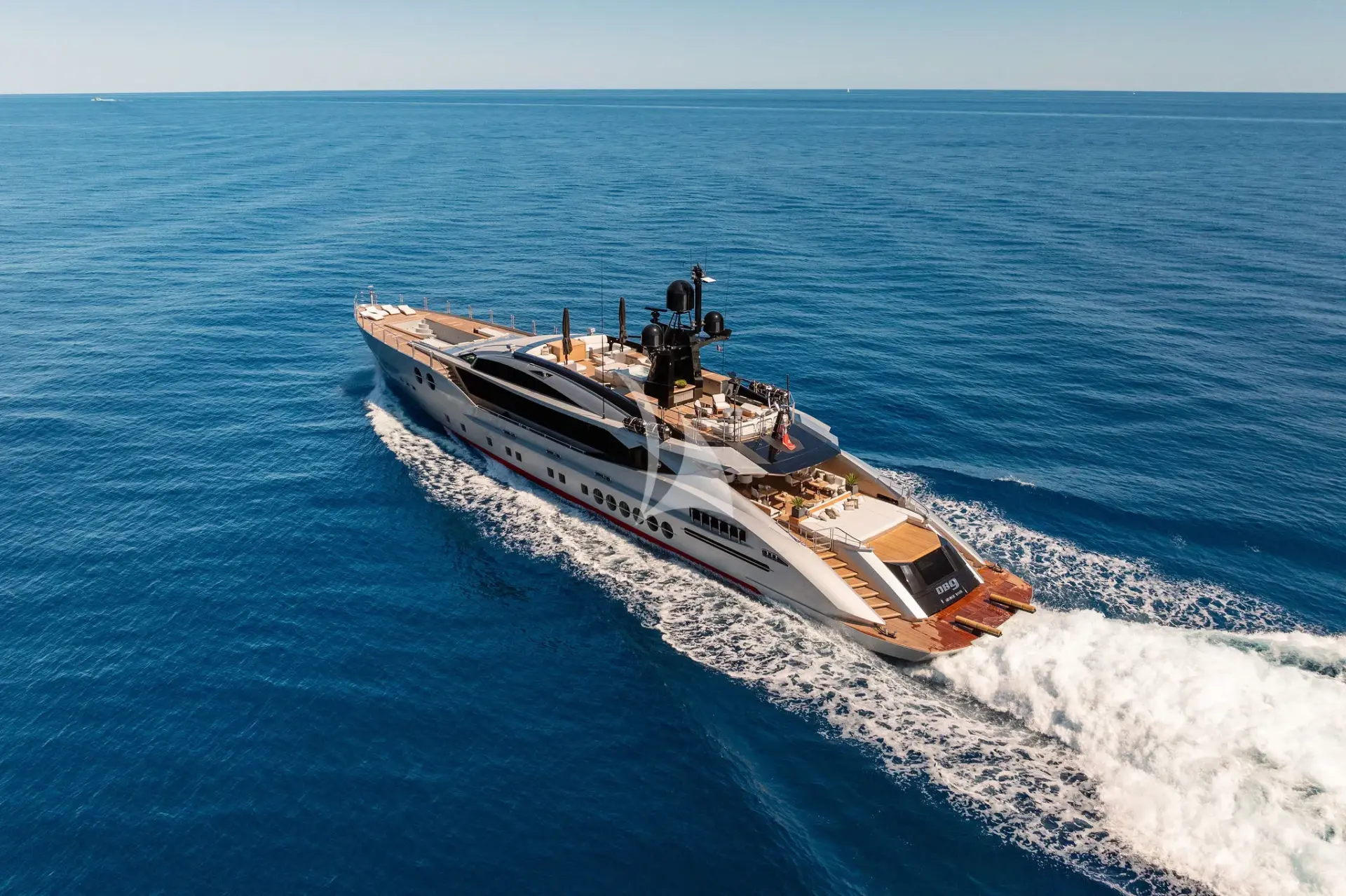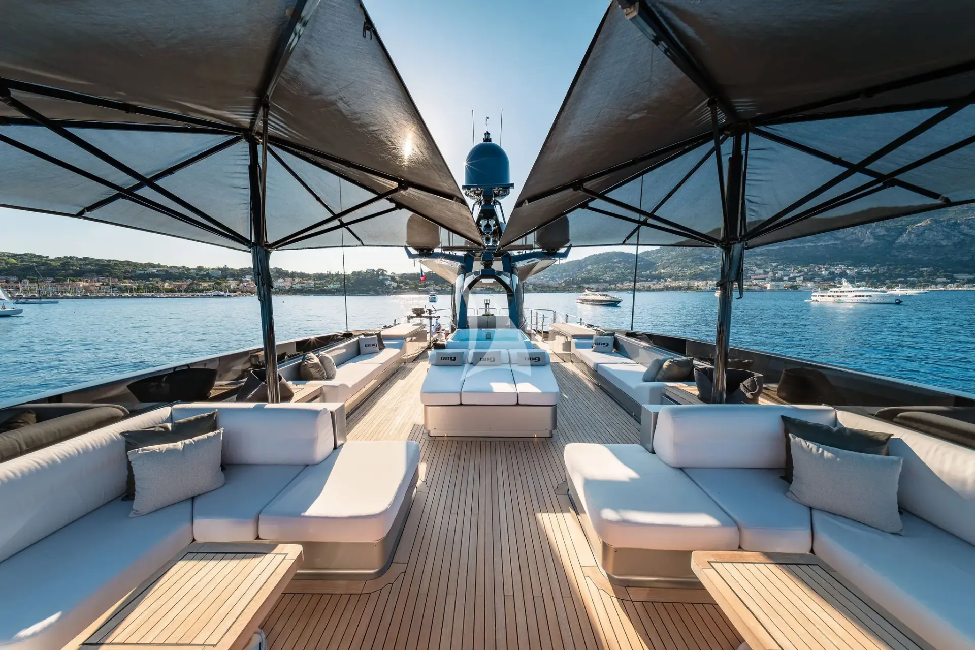 Her standout features include a sleek contemporary interior, an expansive open sundeck with an open-air cinema, an infinity Jacuzzi on the aft deck, a second Jacuzzi on the flybridge, and an impressive 25-foot (8-meter) pool on the foredeck. Built for speed as well as elegance, DB9 cruises comfortably at 22 knots and reaches a thrilling top speed of 30 knots, ensuring swift and stylish passages between destinations.