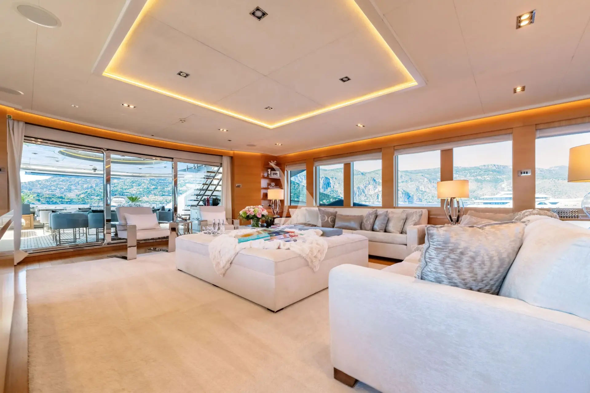 Accommodation is superb, featuring a spacious full-beam owner’s stateroom, two queen VIP staterooms, and two twin staterooms, each with its own en-suite bathroom. The sundeck is a true highlight, furnished with stylish black lounge seating and oversized parasols, creating the perfect space to relax and entertain. Guests can unwind in the Jacuzzi, enjoy a leisurely lunch with panoramic Mediterranean views, or settle in for a movie under the stars at the open-air cinema.