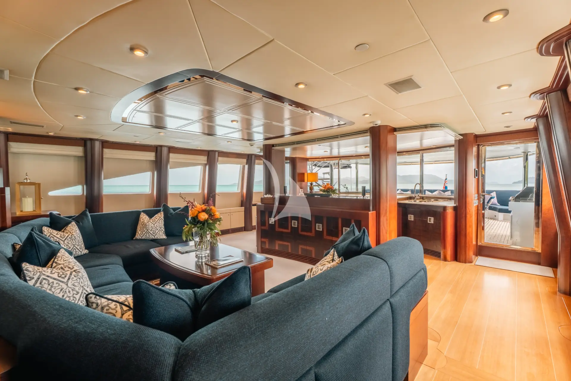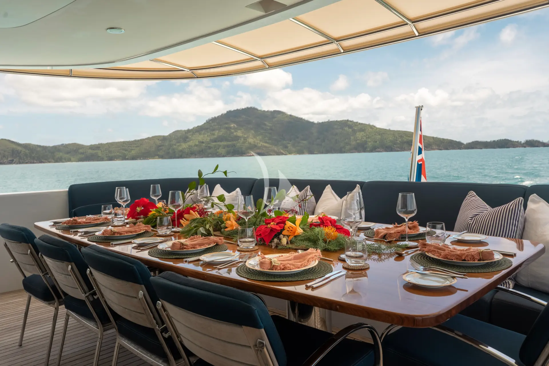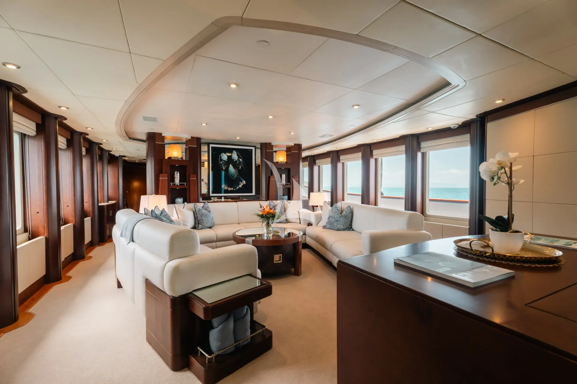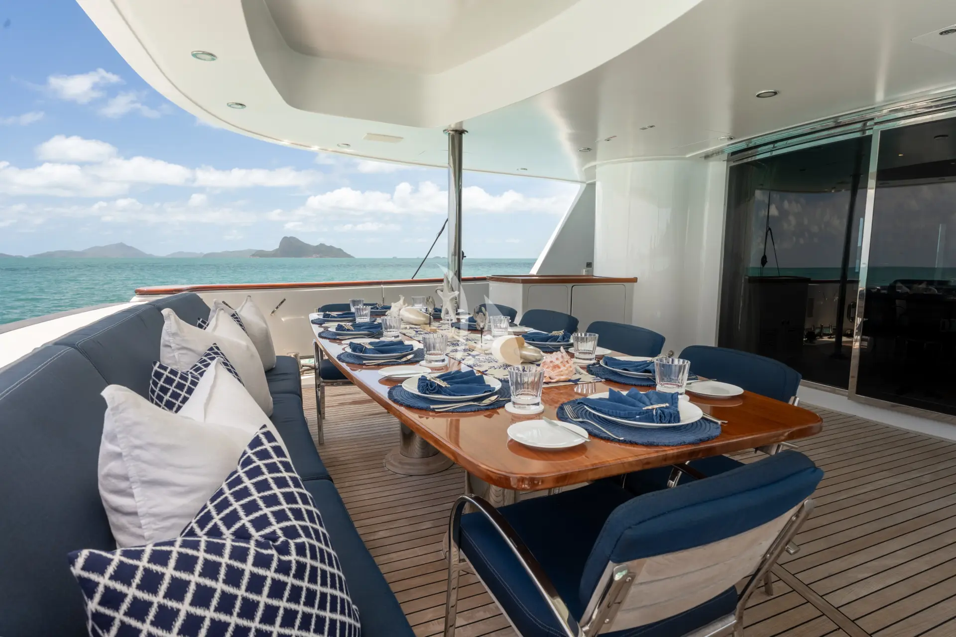 With unparalleled space and stability, this popular charter superyacht is ideal for alfresco entertaining, offering ample exterior living areas. On the main deck, is a spacious aft deck complete with comfortable seating and a dining table. Further aft, the transom lowers to create a magnificent teak platform. The upper deck offers a central wet bar with barstools, shade and dining table. Her top deck offers stunning views while cruising around the stunning destinations, and also features an outdoor jacuzzi spa and seating area.