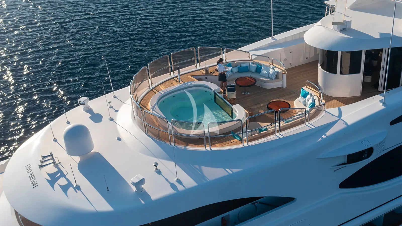 The yacht’s expansive sun deck is a focal point for leisure and socializing, featuring an inviting Jacuzzi, a fully stocked cocktail bar, and an array of oversized sun loungers. Whether relaxing under the Mediterranean sun or enjoying cocktails at golden hour, this area creates a refined yet relaxed vibe akin to a private beach club. An elevator connects all guest decks, allowing for effortless movement throughout the yacht and easy access to every space, from the sky deck to the waterline.