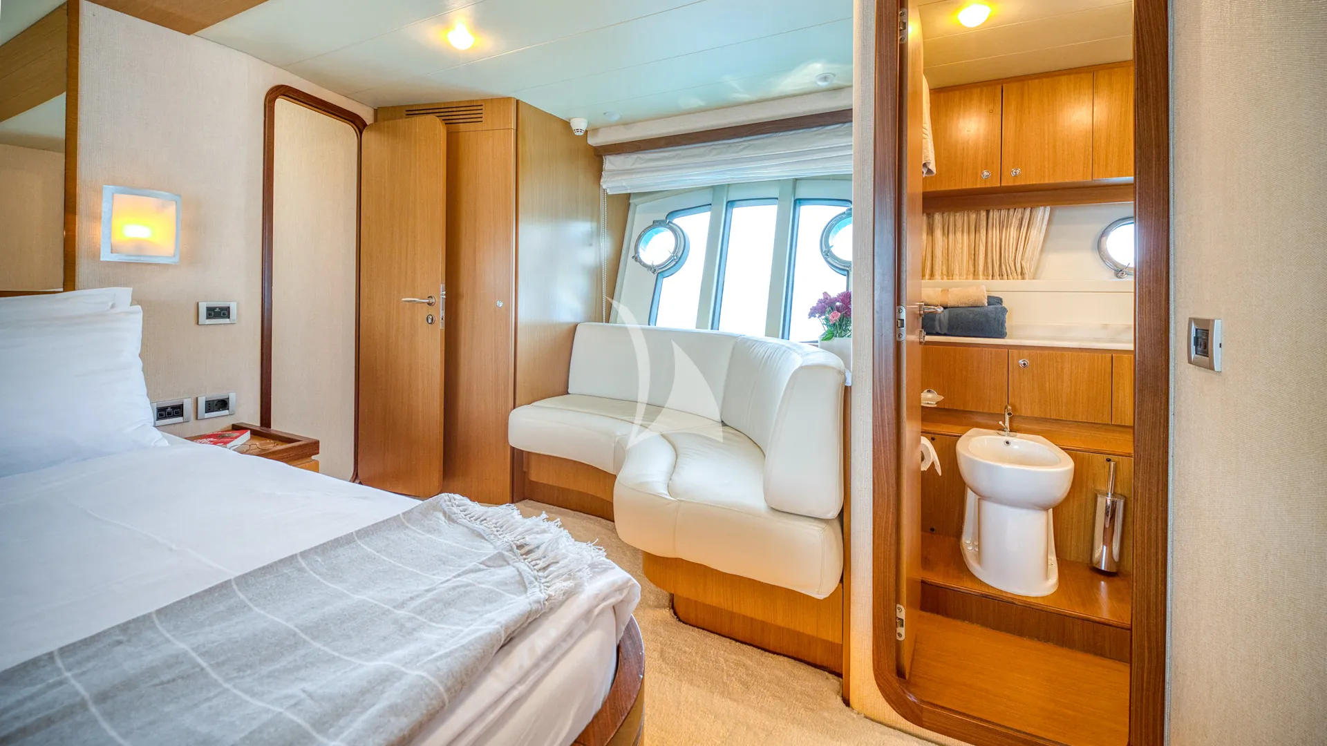 Designed for relaxed living, Dominique features inviting indoor and outdoor spaces, including three dining areas, a spacious flybridge with wet bar and sunpads, shaded aft deck, foredeck for sunbathing, and a wide swim platform for water activities. She accommodates eight guests in four air-conditioned cabins: a full-beam Master, a forward VIP, and two twin cabins—perfect for families or groups of friends. Two professional crew members ensure a seamless, stress-free charter.