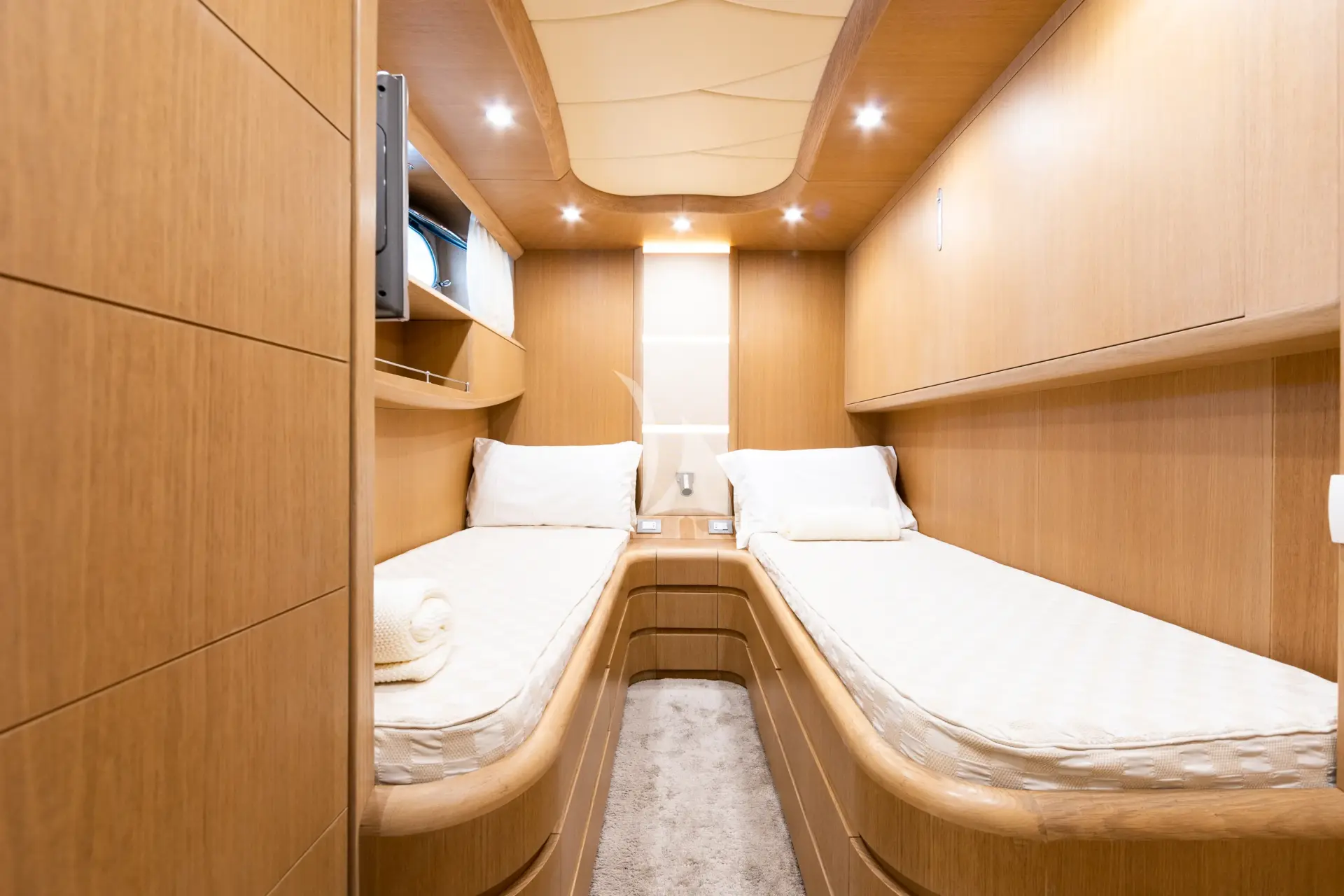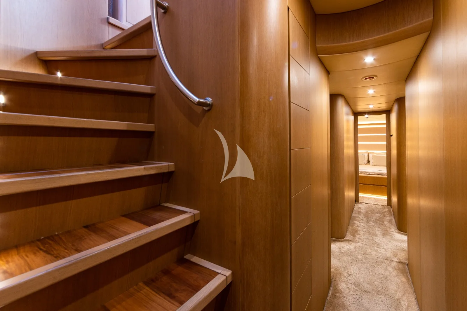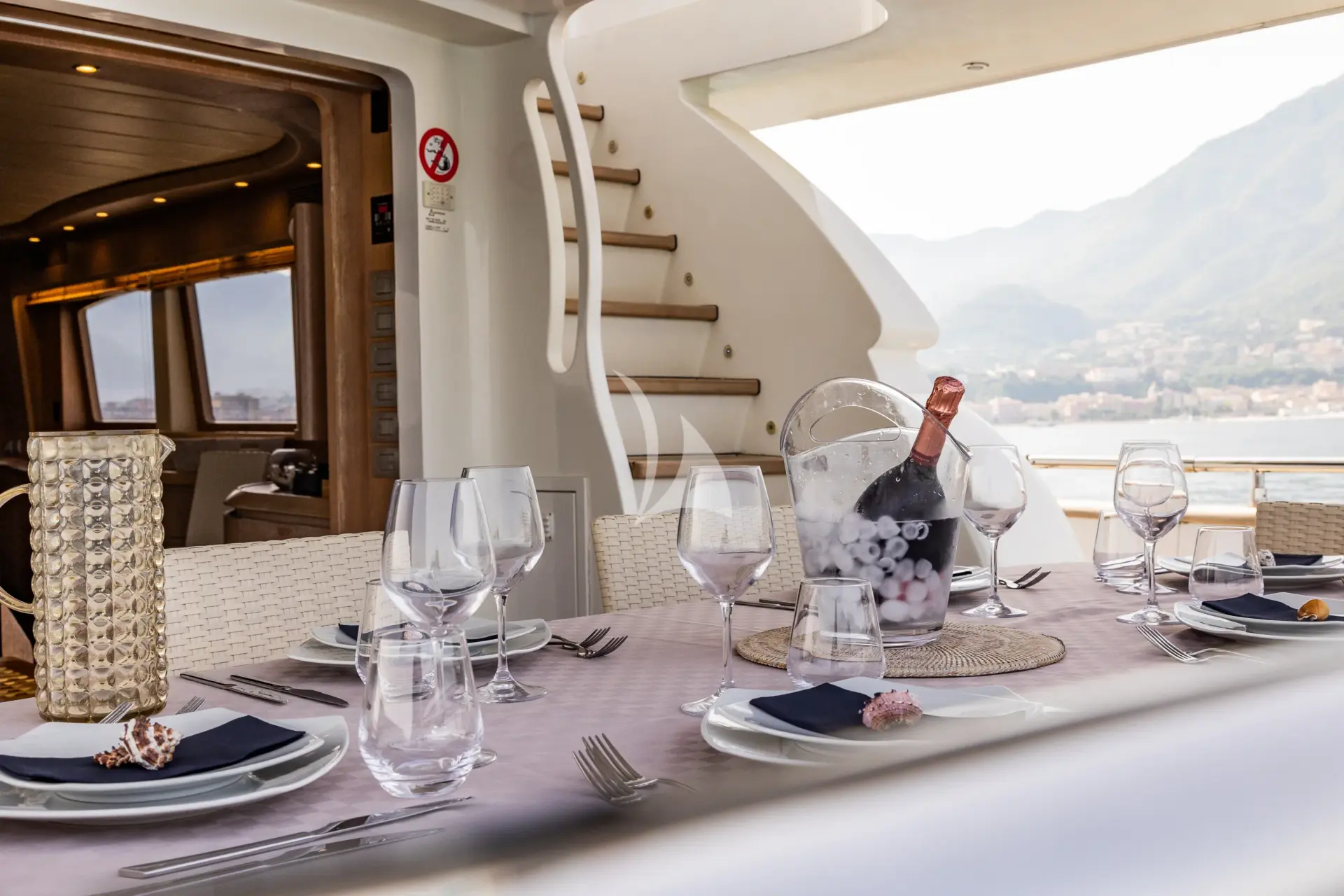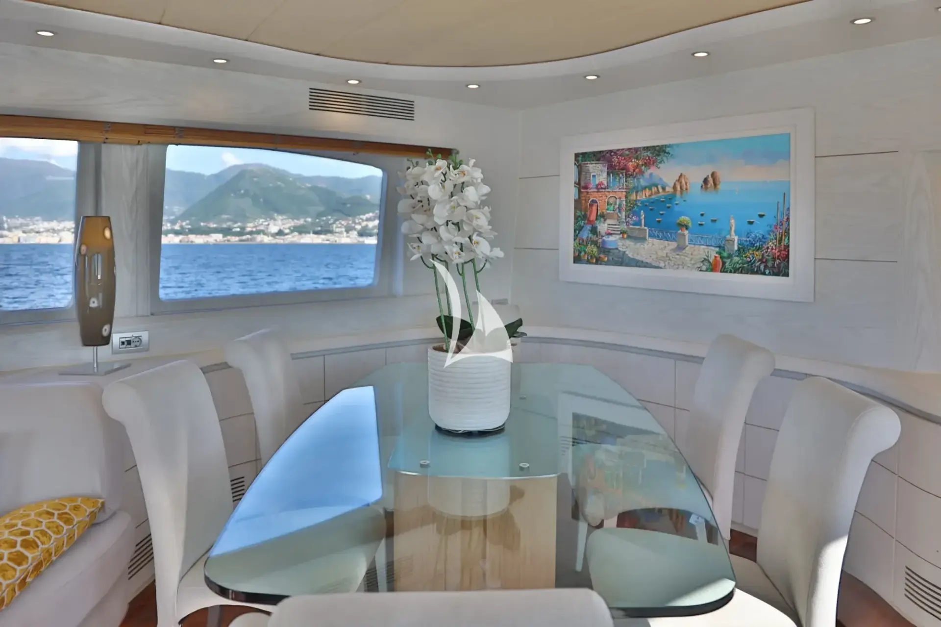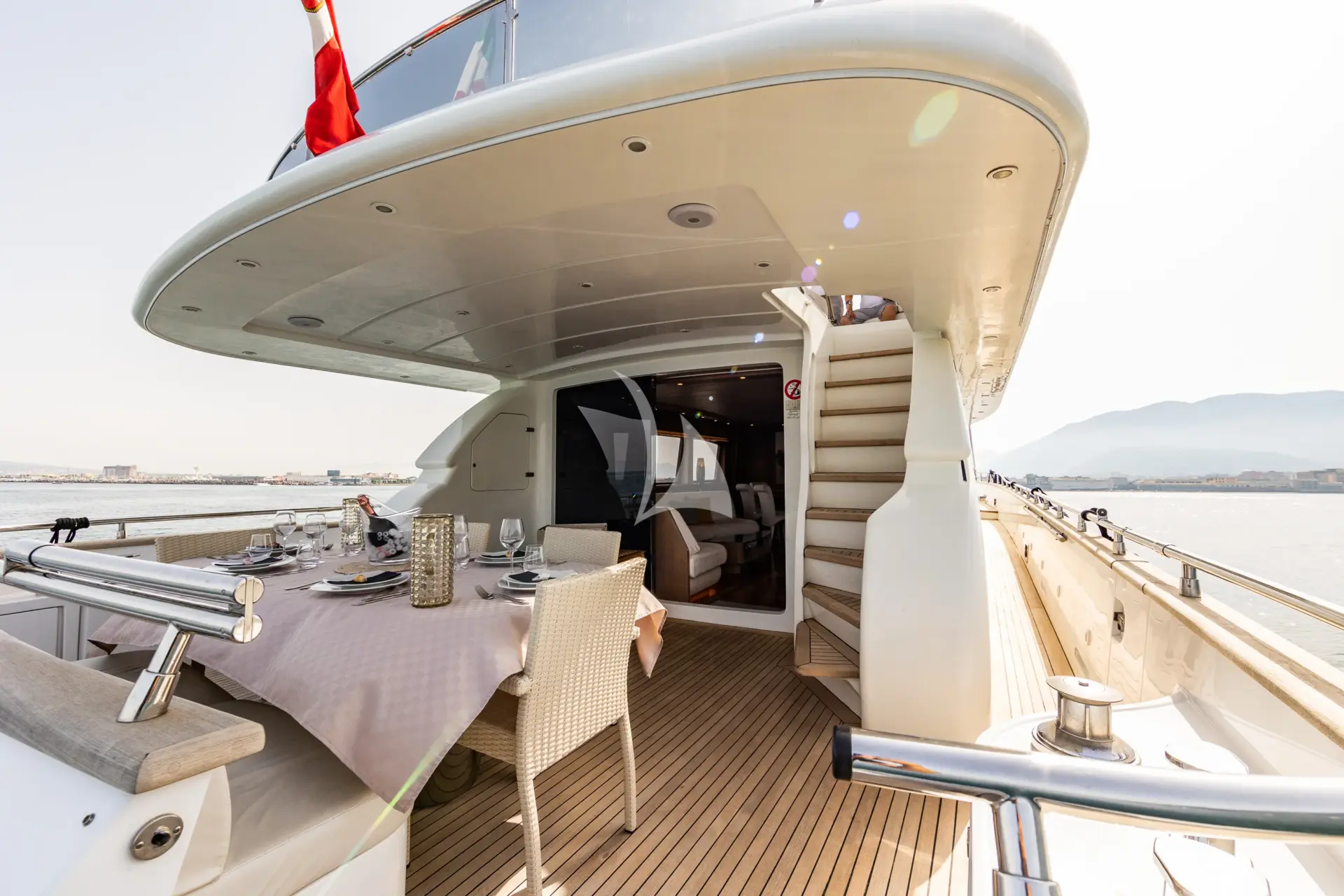 DUBAI can accommodate up to 9 guests in 4 en-suite cabins. The Master stateroom is full beam of the yacht amidships, offering a queen size center-lined bed, sofa, walk-in wardrobe and en-suite. The VIP cabin is of the yacht forward with a double bed. The first Twin cabin features 2 side-by-side single beds and can be convertible into double cabin. The second Twin cabin features 2 side-by-side single beds and 1 Pullman bed. All 4 cabins have a light and clean ambiance, the neutral décor and spacious feel are inviting and serene. For indoor entertainment, all 4 cabins offer Sat TV/DVD/CD electronics. Tenders & Toys onboard yacht DUBAI include a tender Zodiac, 1 Seabob F5S, 2 SUP, inflatable Bananone onboard, snorkeling equipment. E-mail + Internet connection. Audio Visual Equipment and Deck Facilities include LCD screens linked to SAT with DVD, CD and Radio in each cabin, 42” TV SAT with DVD/VHS player and Bose Surround in the saloon. The salon features a new parquet wood floor, crisp white soft furnishings and state-of-the-art entertainment with Bose surround sound and a 42’’ flat screen TV. Forward of the salon, in an open plan, is the stylish clear glass formal dining table. Large panoramic windows supply ample natural light, while Venetian blinds offer optimum privacy. M/Y DUBAI has plenty of outdoor space to enjoy. The aft deck is adjacent to the salon and boasts an alfresco dining option and partial shade. Guests can walk easily around the yacht's main deck, thanks to the 360° teak decks. Above the main deck, the flybridge is perfect for entertaining, offering a further alfresco dining option, a sun pad, additional seating and a removable Bimini cover. For water enthusiasts, DUBAI has an extended swim platform ensuring effortless access. In 2026, DUBAI was upgraded with a Seakeeper gyrostabilizer, providing enhanced comfort and reduced roll both at anchor and underway.