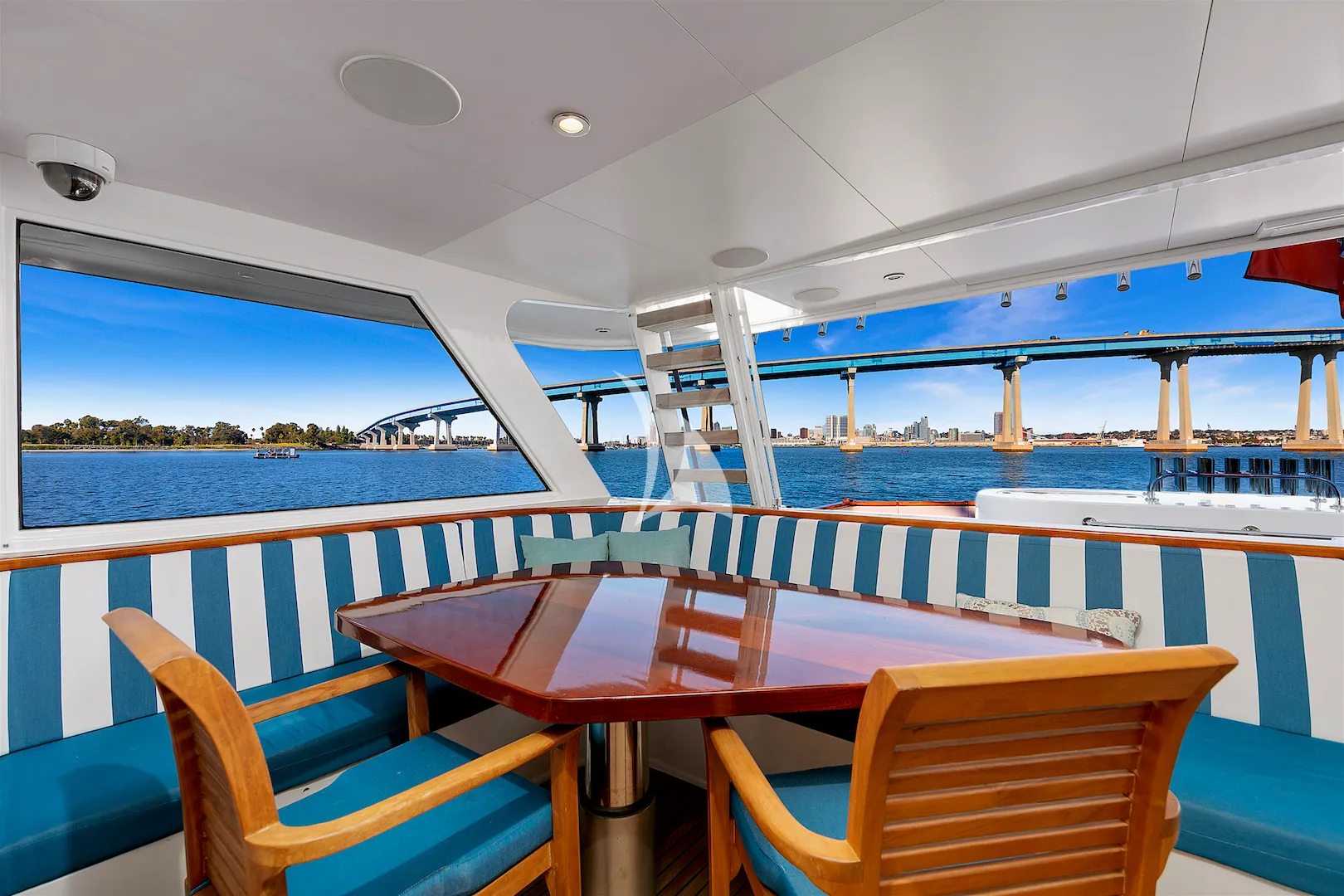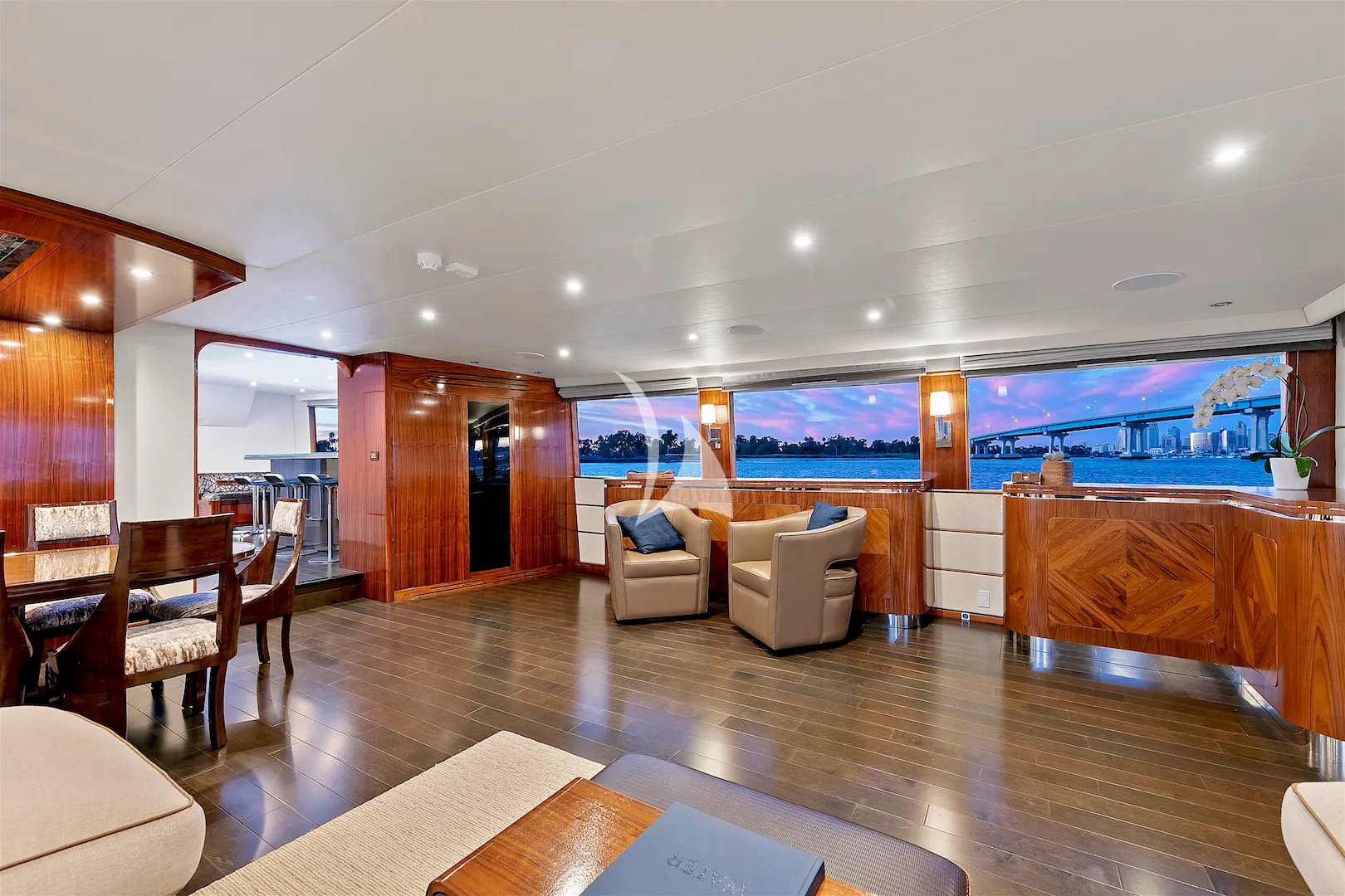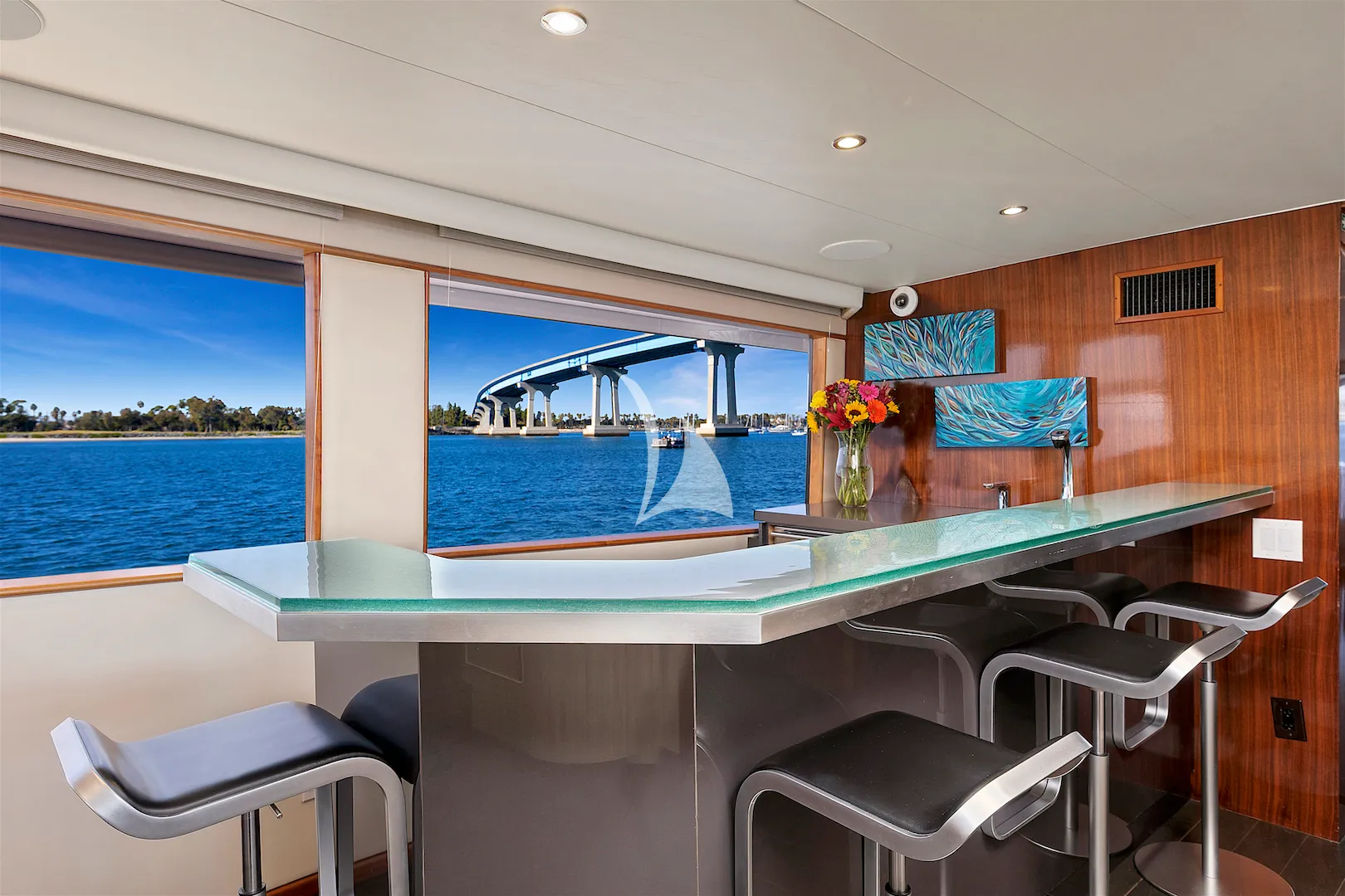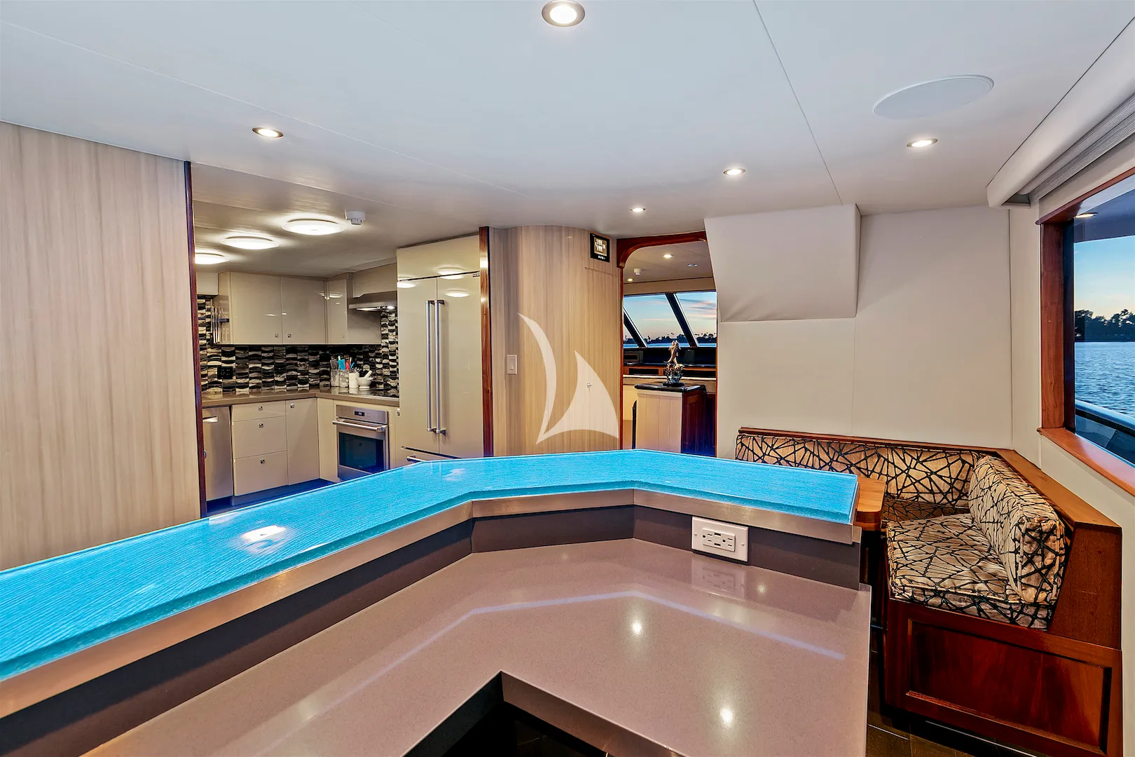 Hardwood flooring, updated furnishings, and a soft, neutral palette define the shared spaces. A bar and service area connect with the open-plan galley, allowing for a natural flow during meals and informal gatherings. Generous windows keep the space bright throughout the day, offering uninterrupted views while underway or at rest.