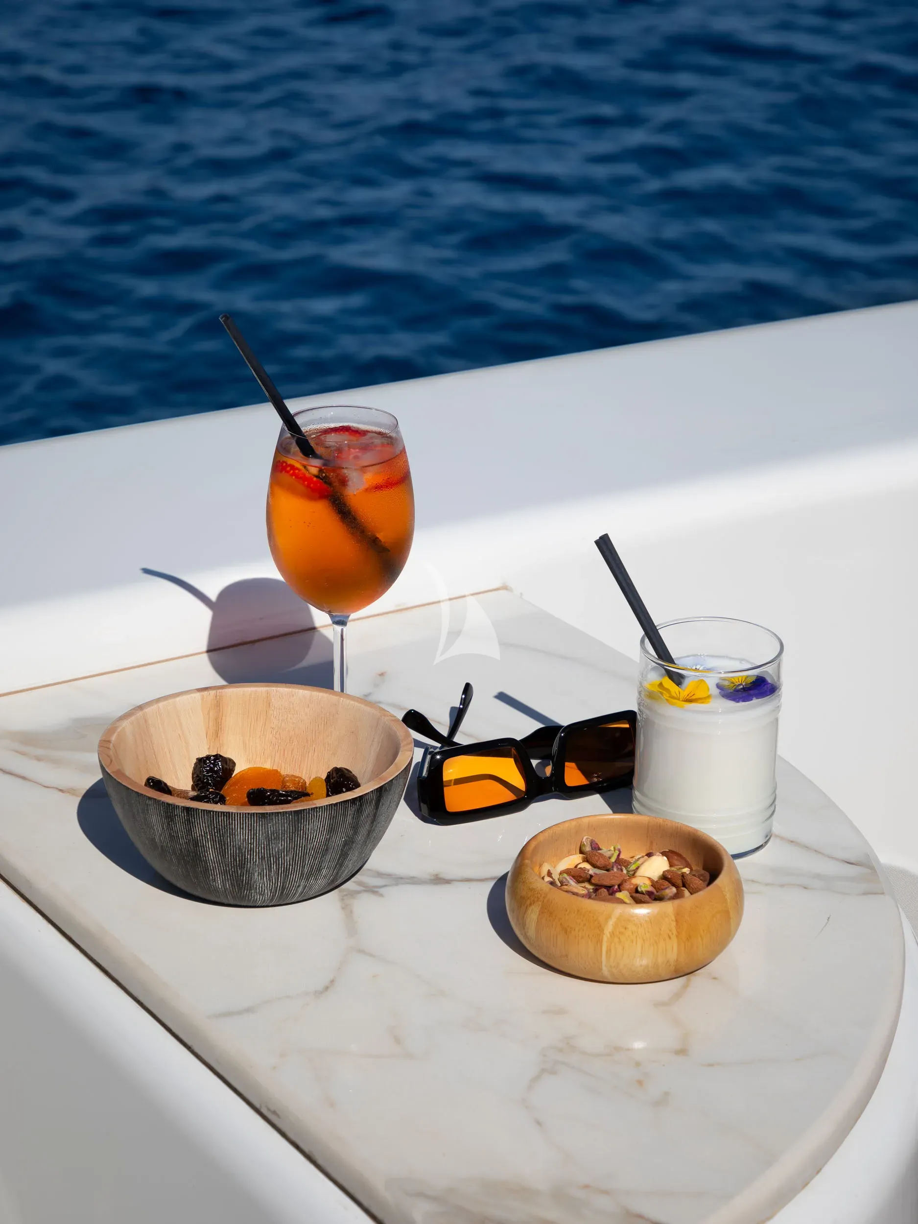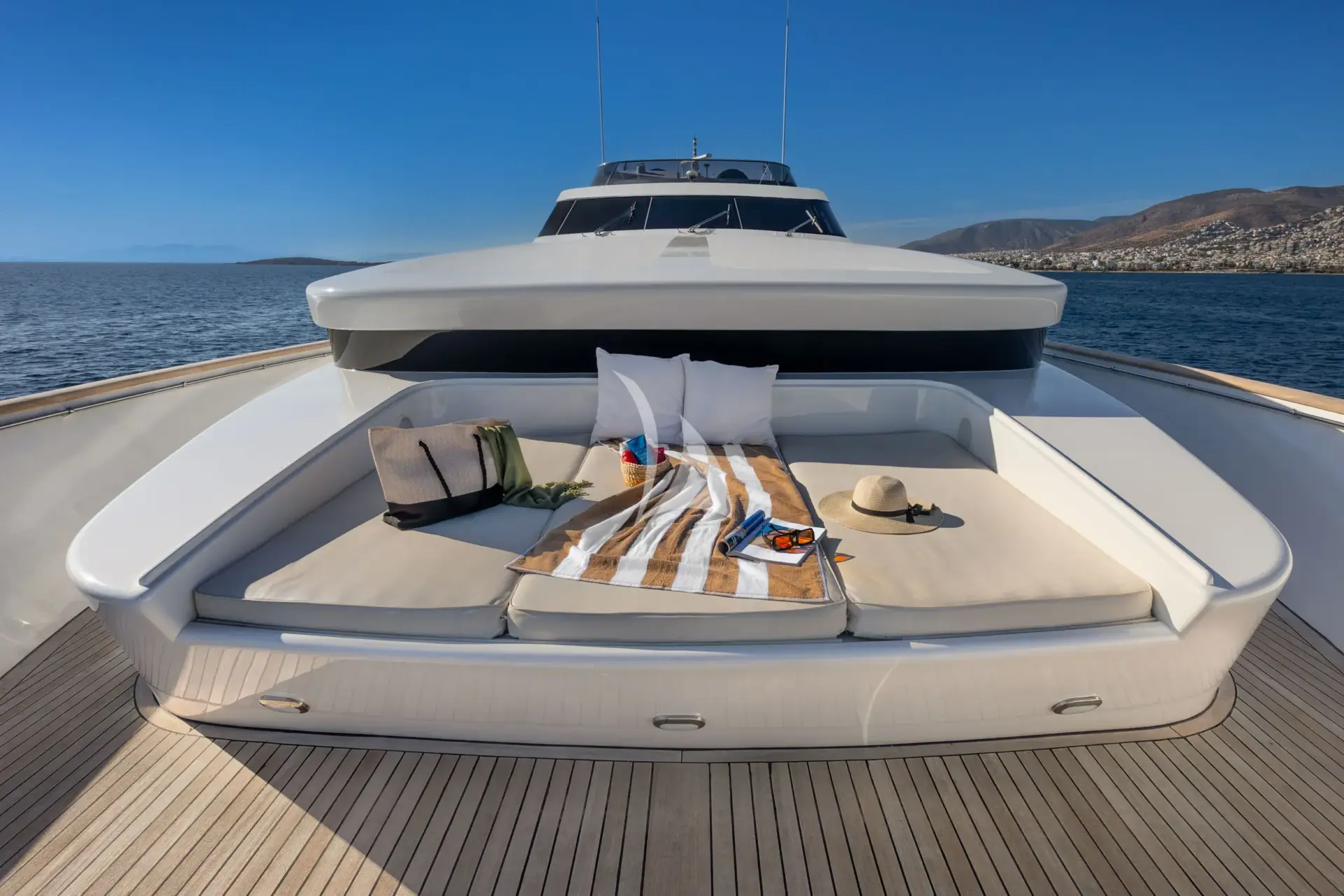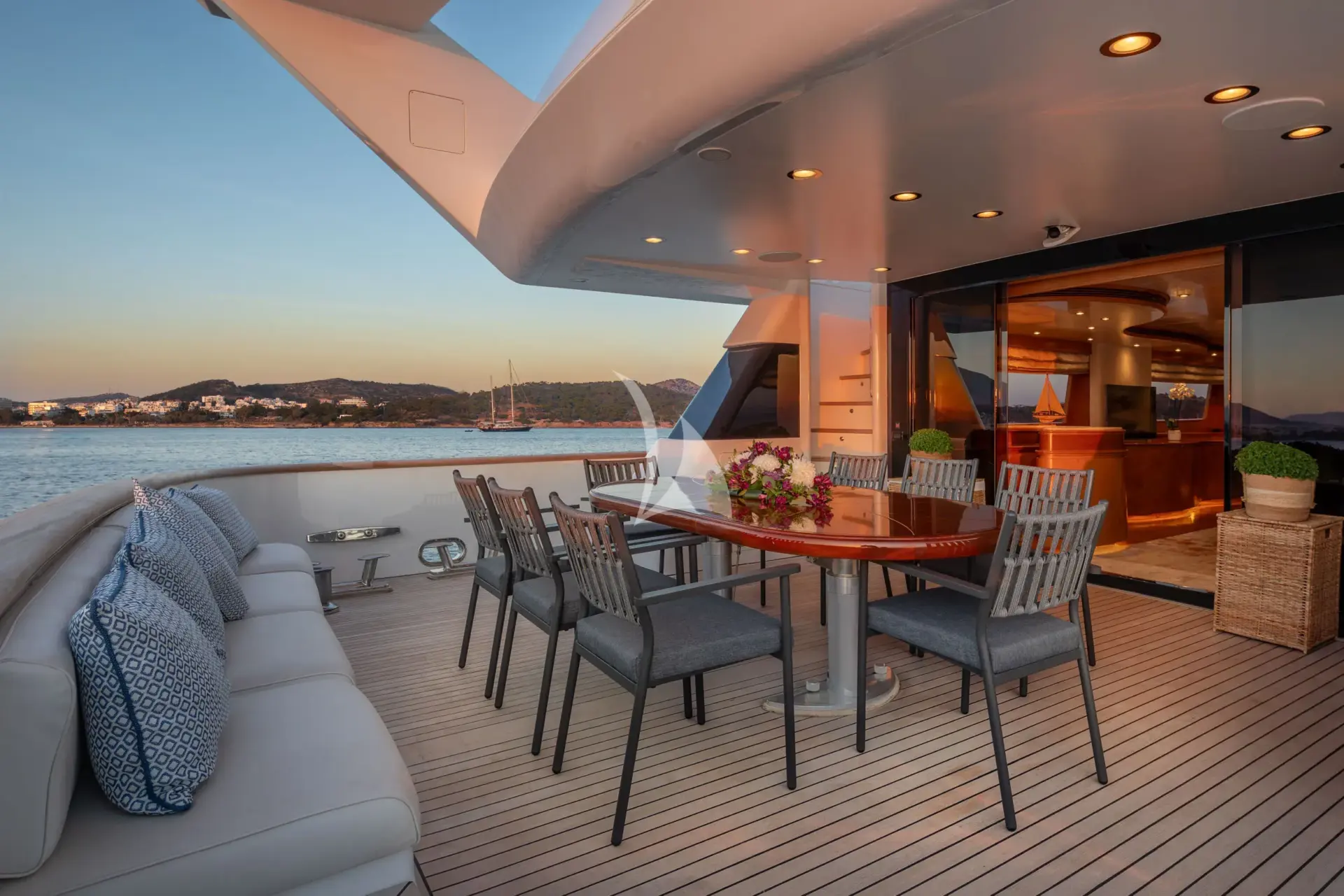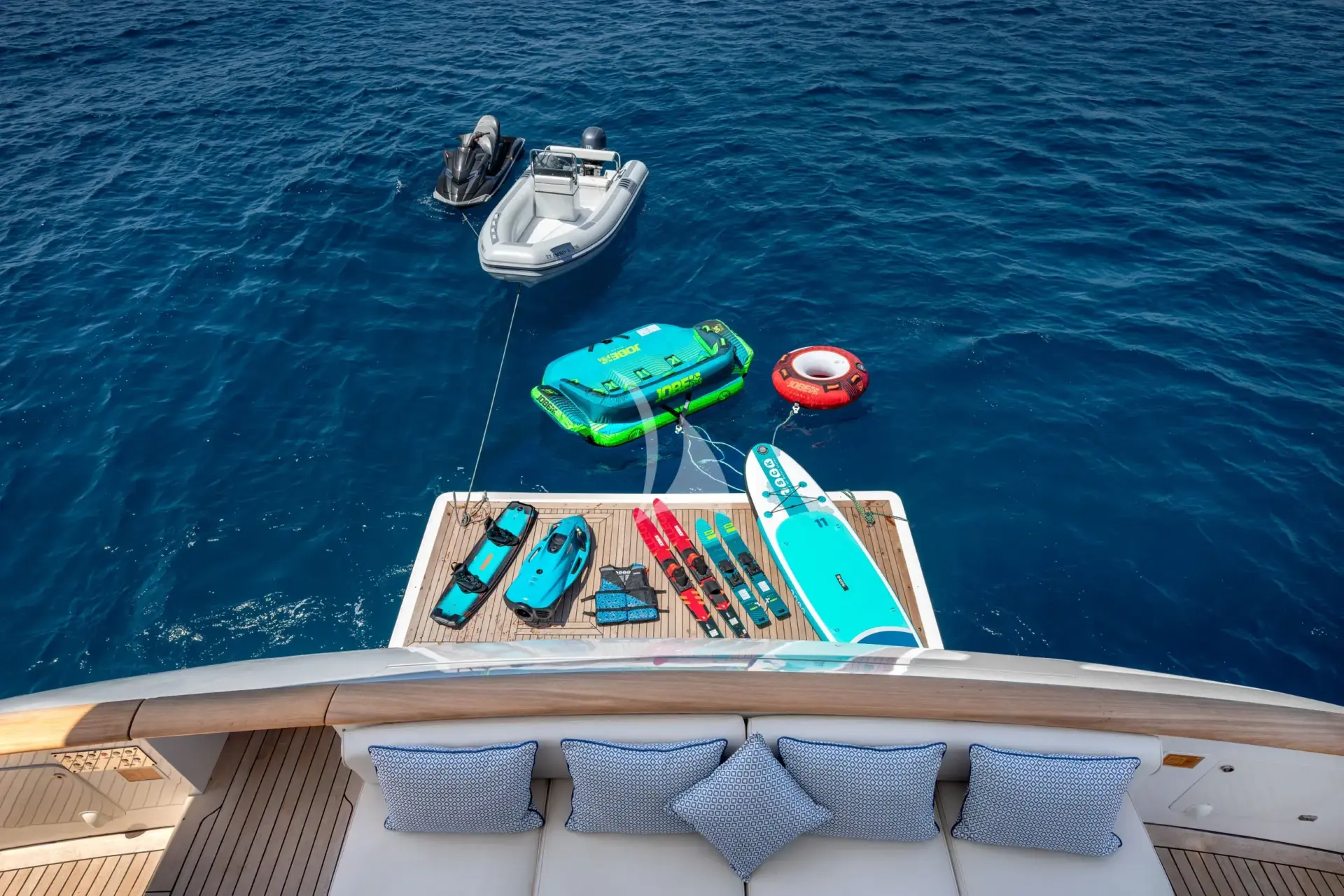 The exterior deck spaces are designed for ultimate relaxation and enjoyment. Guests can lounge in the sun, dine al fresco, or simply unwind on the expansive aft deck while taking in the breathtaking views. The large aft deck is the perfect spot to watch friends and family delight in the variety of water toys available. The sundeck features a lounge area, dining table, and a prime location for enjoying sundowners.