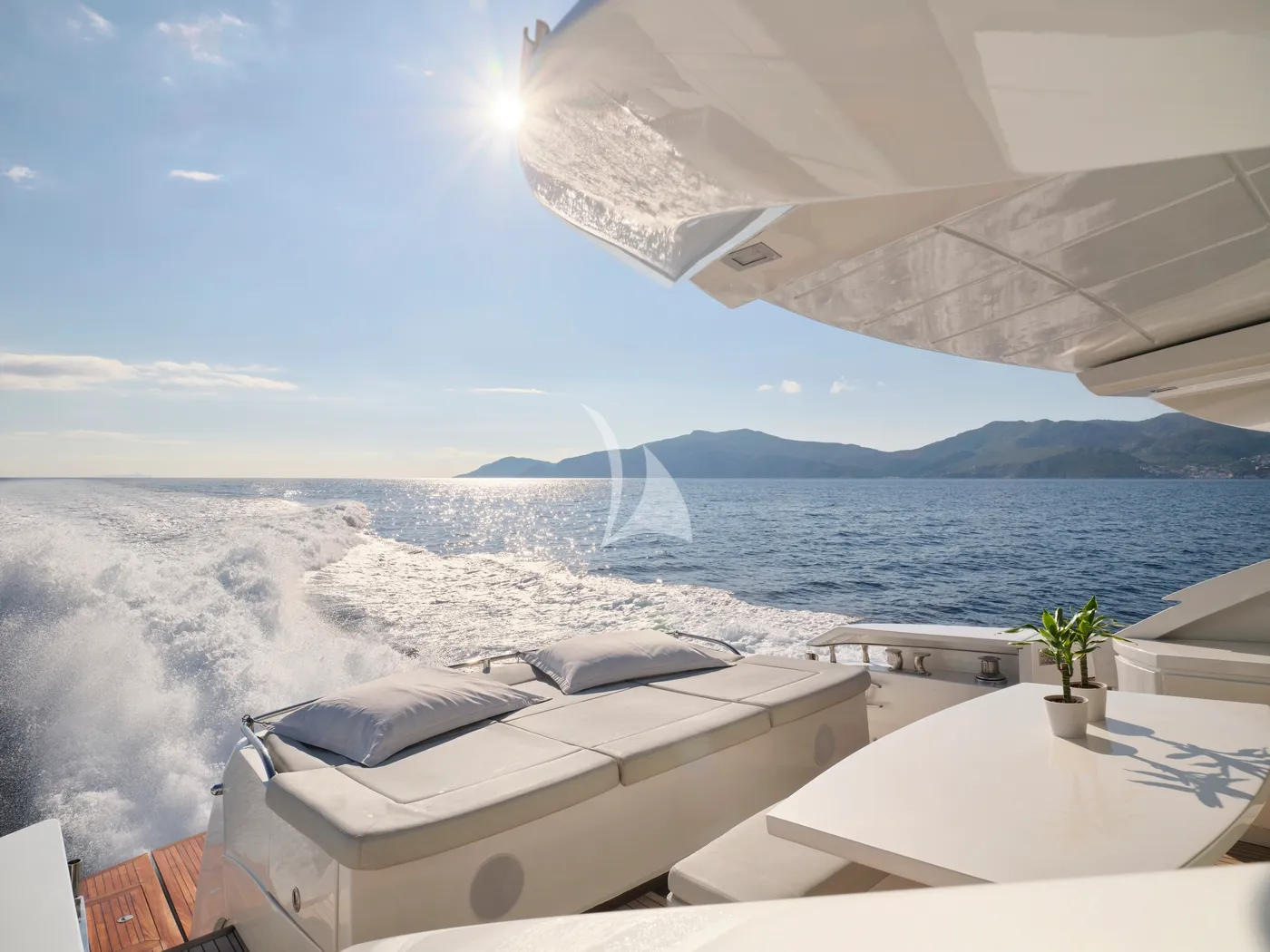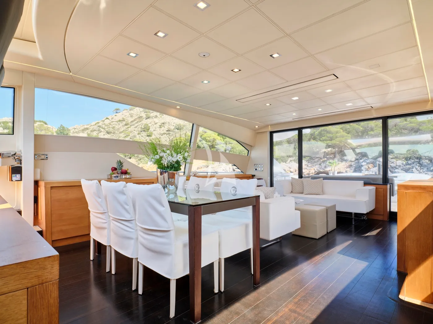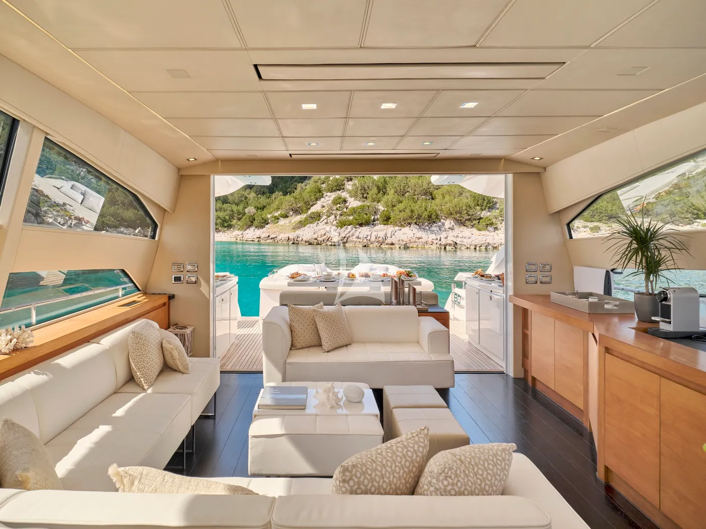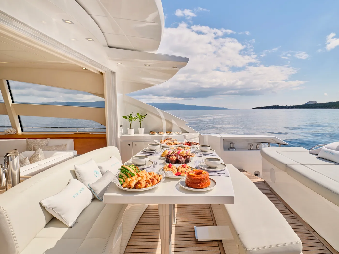 Outdoor living is at the heart of FOR EVER’s design. Expansive sun-soaked lounging areas, a shaded bow with bimini, and an extendable cockpit roof offer effortless transitions between sun and shade. Retractable salon doors open fully to the cockpit, creating an open, fluid space ideal for elegant entertaining or relaxed moments at sea.