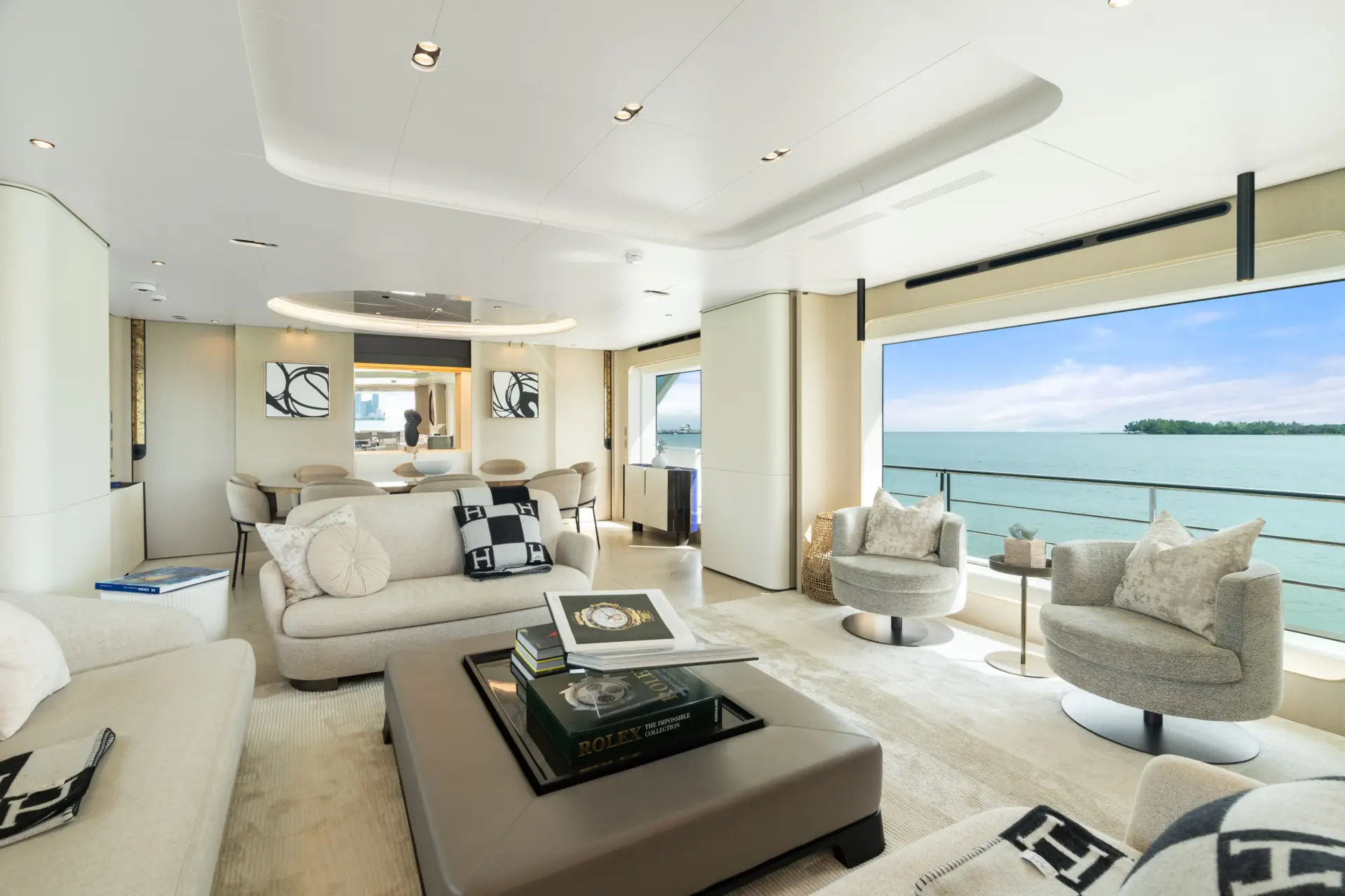 Accommodating up to 11 guests across five opulent staterooms, FREEDOME boasts a full-beam master suite on the main deck, flooded with natural light from expansive windows. Four additional en-suite cabins on the lower deck offer each guest an intimate retreat of privacy and luxury. The main salon and formal dining area, adorned with floor-to-ceiling windows, allow guests to enjoy breathtaking ocean vistas, while the interiors, masterfully designed by Achille Salvagni, blend contemporary elegance with sumptuous furnishings to create a warm, sophisticated atmosphere.