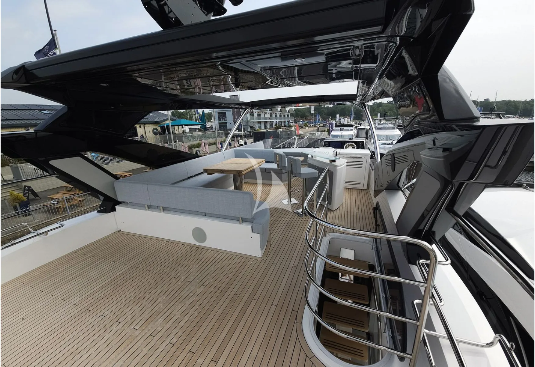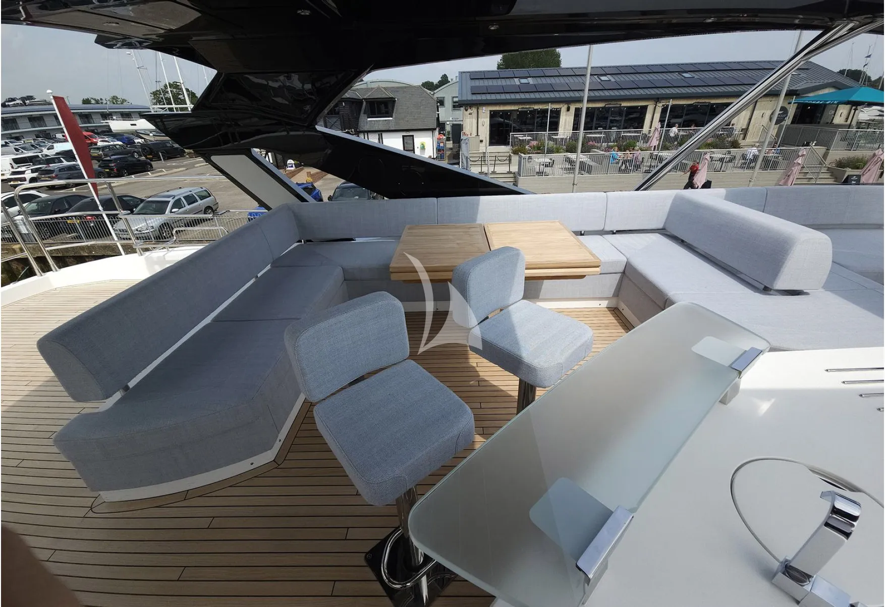 The experience continues on the foredeck, where large sunbeds, flexible seating arrangements, and integrated refrigeration create a versatile social area, equally suited to sunbathing or quiet moments at anchor. Above, the expansive flybridge offers exceptional space and flexibility, enhanced by a sleek composite hardtop with an electric retractable canopy and aft awning, allowing guests to enjoy sun or shade throughout the day.