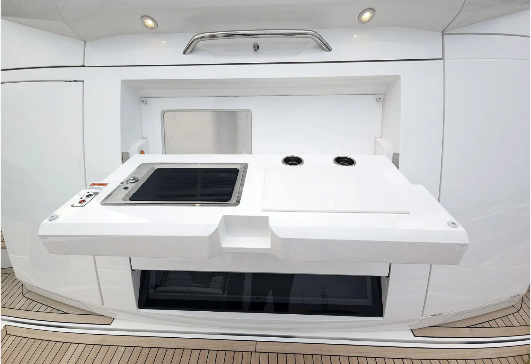 Outdoor living is a defining feature of the yacht. The cockpit can be configured with additional lounge seating, while the stern hosts a stylish mini beach club complete with a barbecue grill, fold-down seating, and a rain shower—an ideal setting for relaxed lunches, sunset aperitifs, or post-swim comfort. The extended bathing platform provides easy access to the sea and ample space for water toys, tenders, and swimming activities.