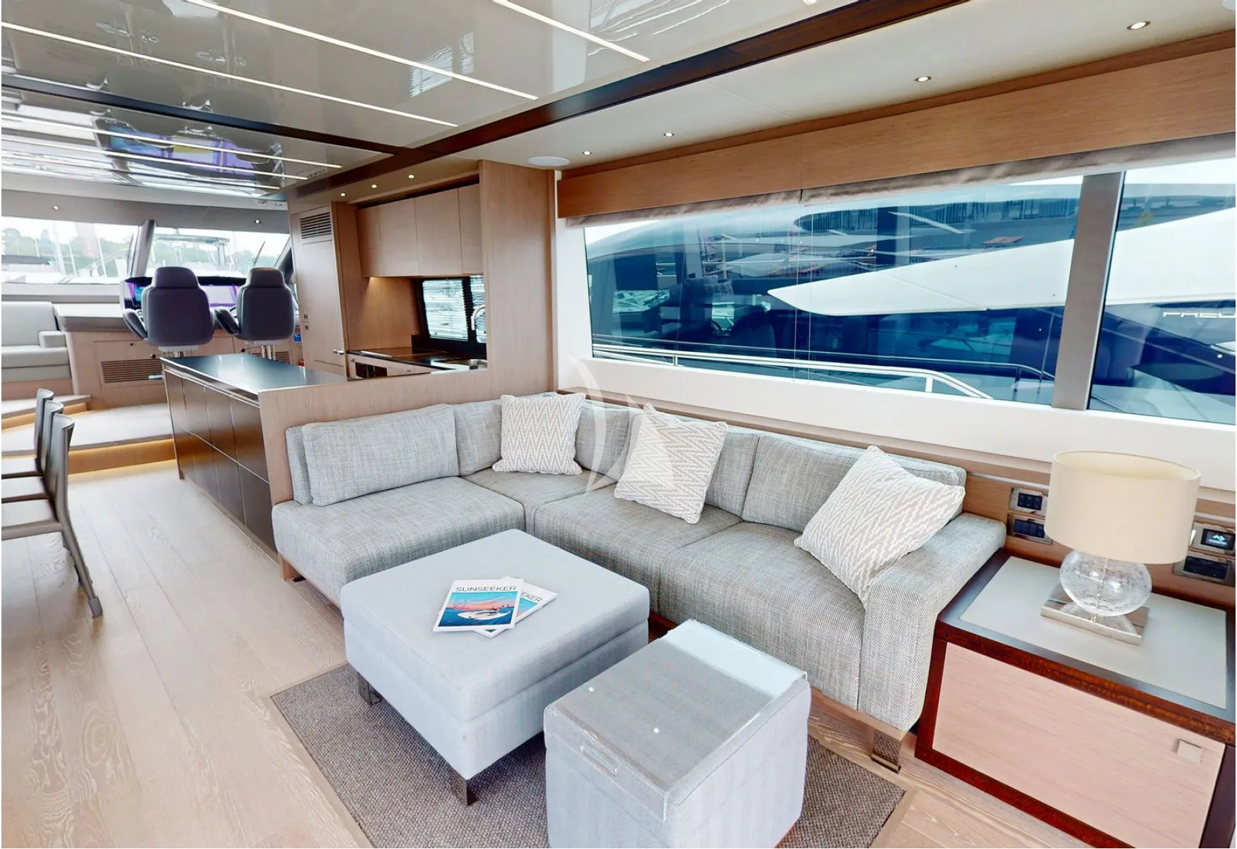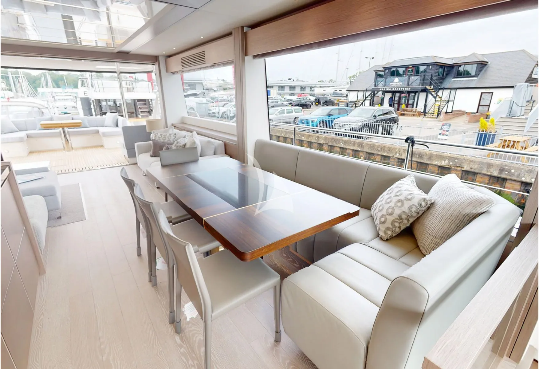 Its sleek profile cuts an impressive silhouette on the horizon, while expansive glazing floods the interior with natural light, creating a strong visual connection with the surrounding seascape. Once on board, the main deck opens into a beautifully designed open-plan living area, offering an almost 360-degree view and an inviting sense of space—perfect for socialising, relaxing, and entertaining.