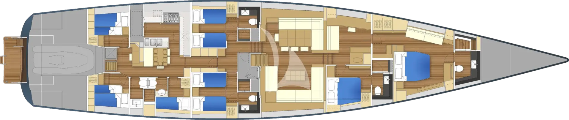 The crew accommodations are discreetly positioned aft to ensure privacy and seamless service. They include three cabins for five crew members, the nav. station, and the galley.