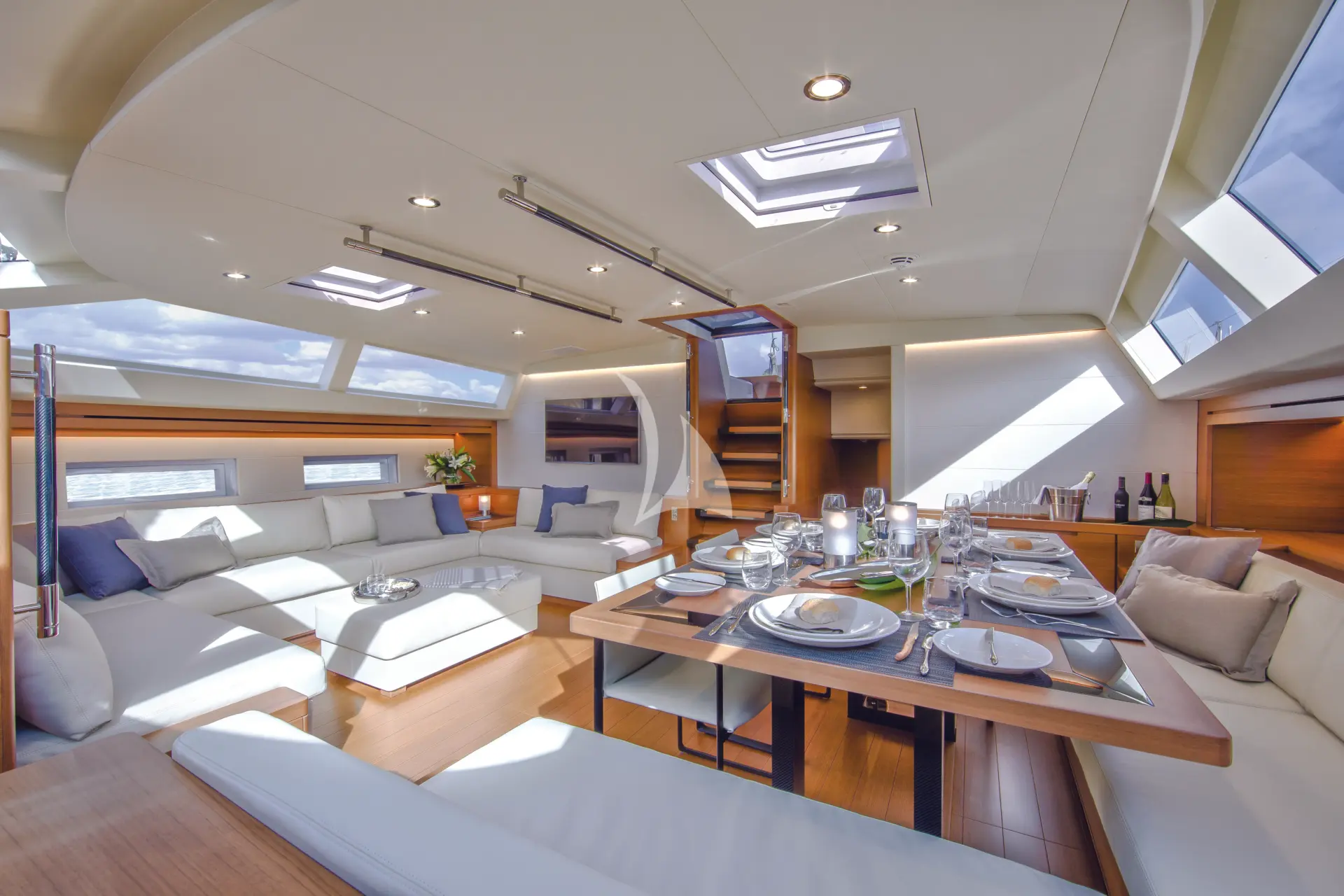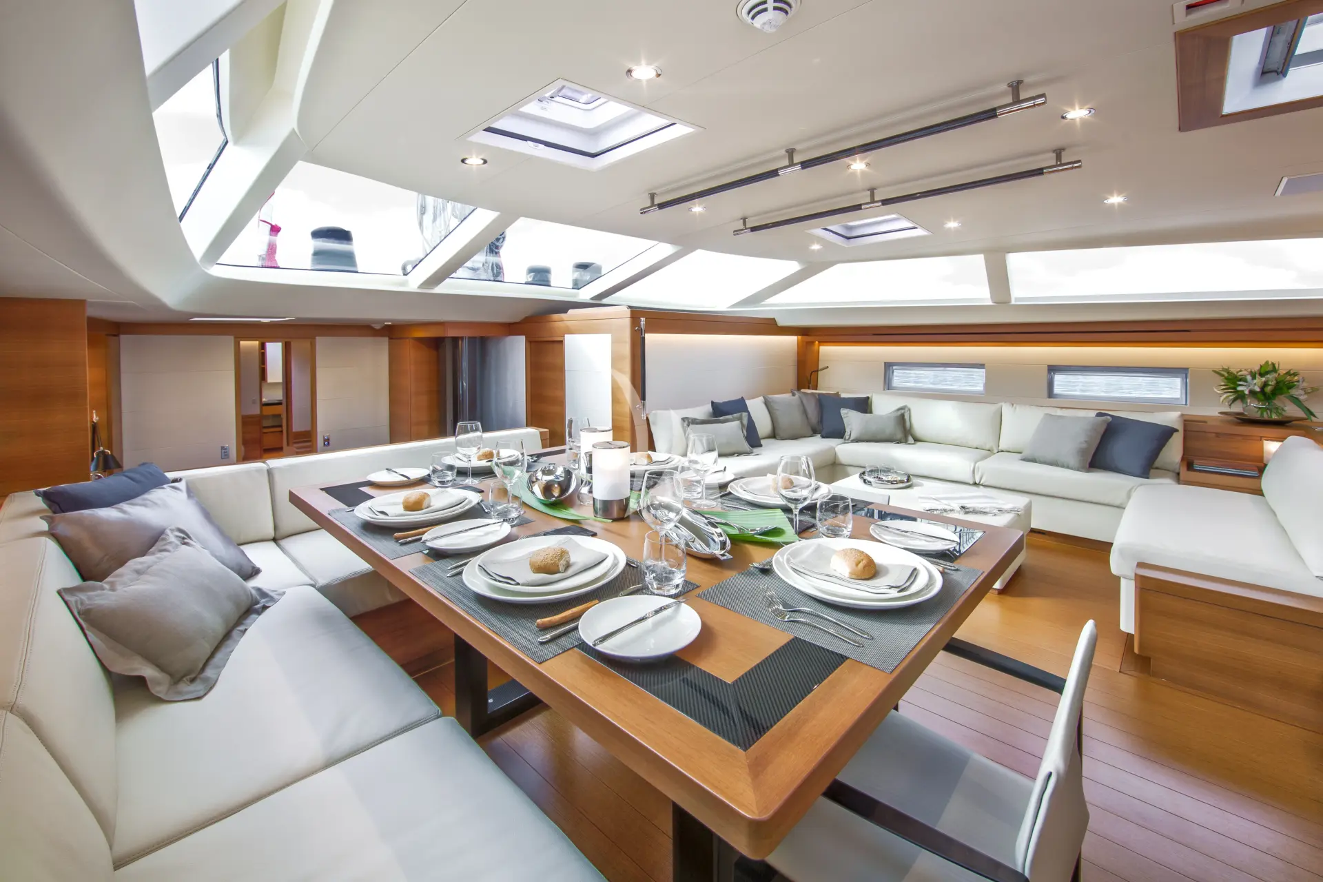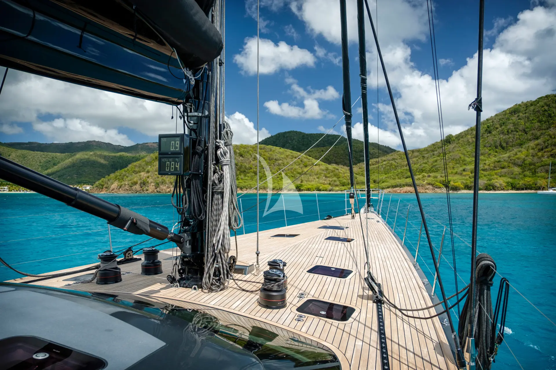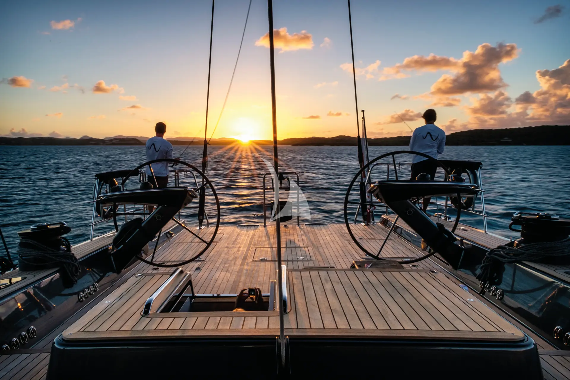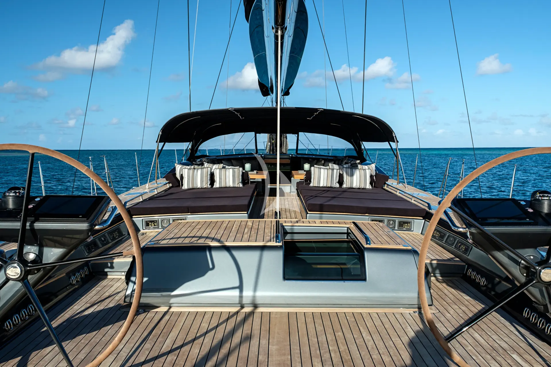 The cockpit is designed as a true social hub, ideal for five-star charter experiences. Guests can relax around the two versatile extendable dining tables, each featuring integrated cooling boxes. Additionally, two deck fridges built into the coamings ensure refreshments are always close at hand. A generous sunbathing area, thoughtfully separated from the maneuvering cockpit, provides a safe and serene space to unwind, even while under sail.
