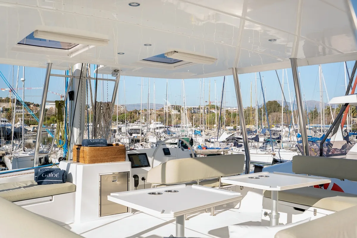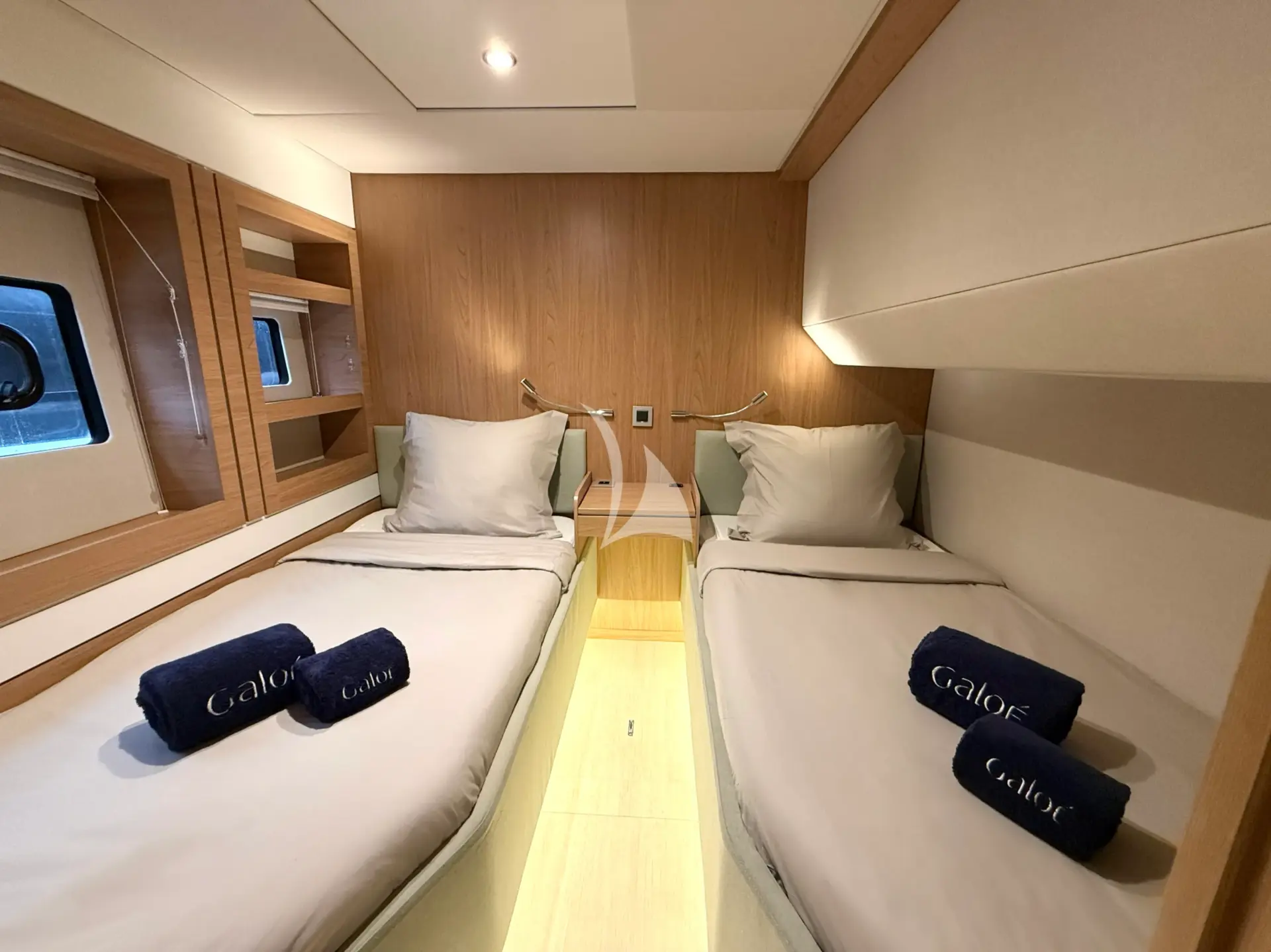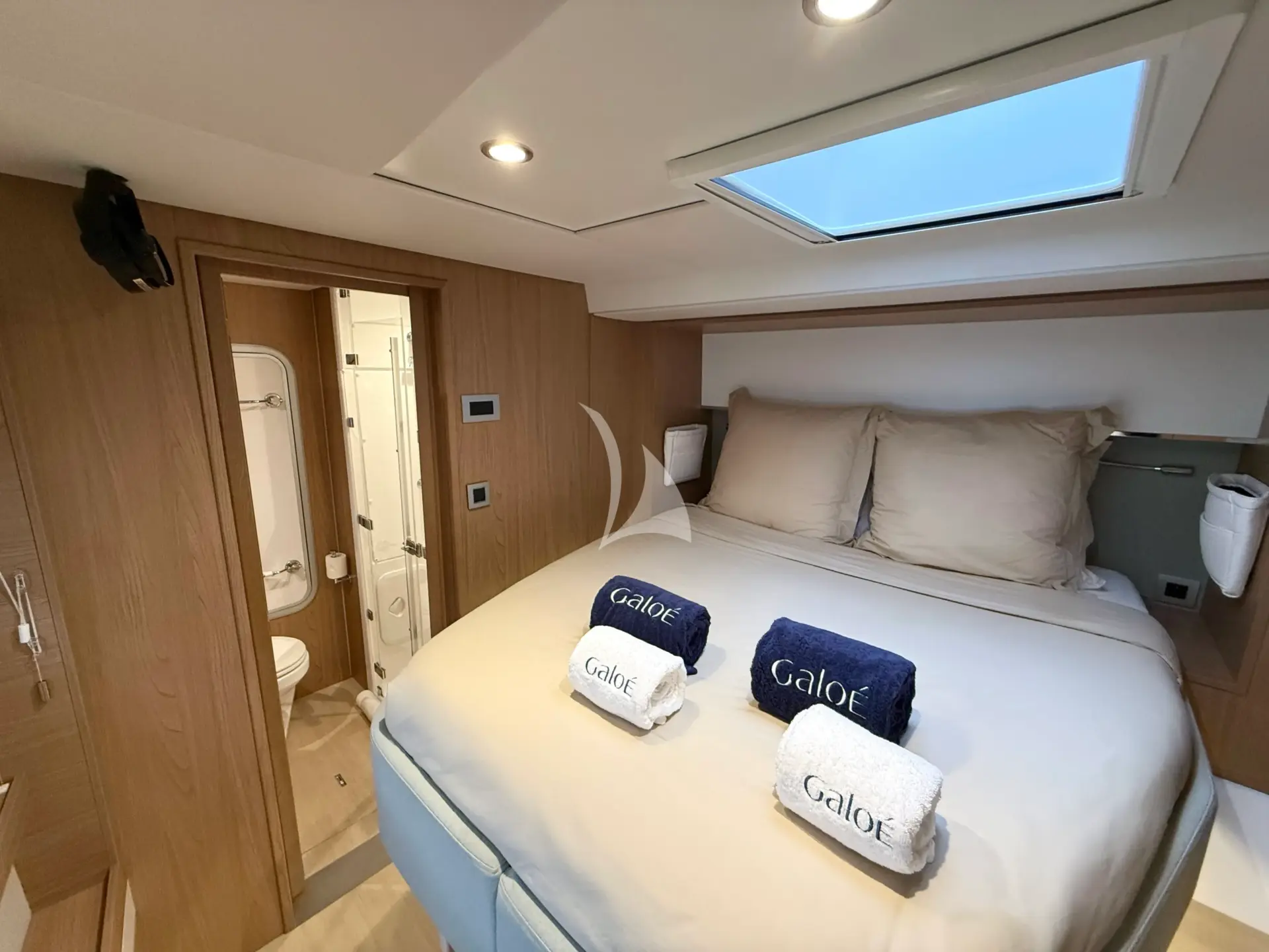 GALOE is a 53ft (16m) sailing yacht built by Bali Catamarans in 2023. She accommodates up to 10 guests in 5 cabins comprising 4 double and 1 twin, with a professional crew of 2 ensuring an exceptional charter experience. Available for charter in France, Italy. Notable features include over 128m2 of living space, 360 degrees view flybridge, solid fore deck suitable for diverse activities, while staying dry in navigation, automated aft tilting door integrating indoors / outdoors, and american fridge (615l).