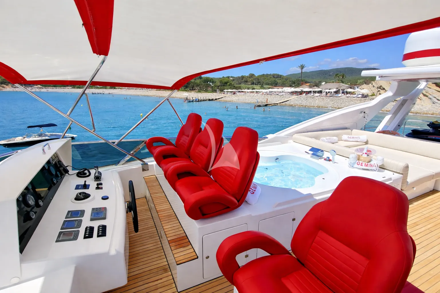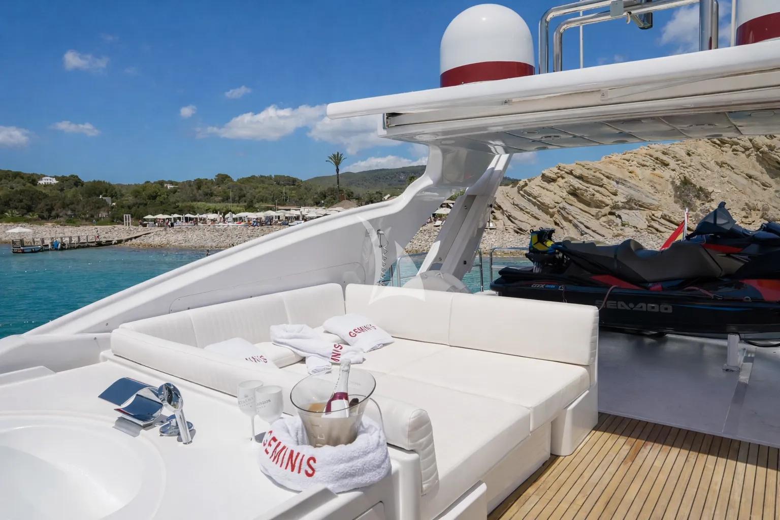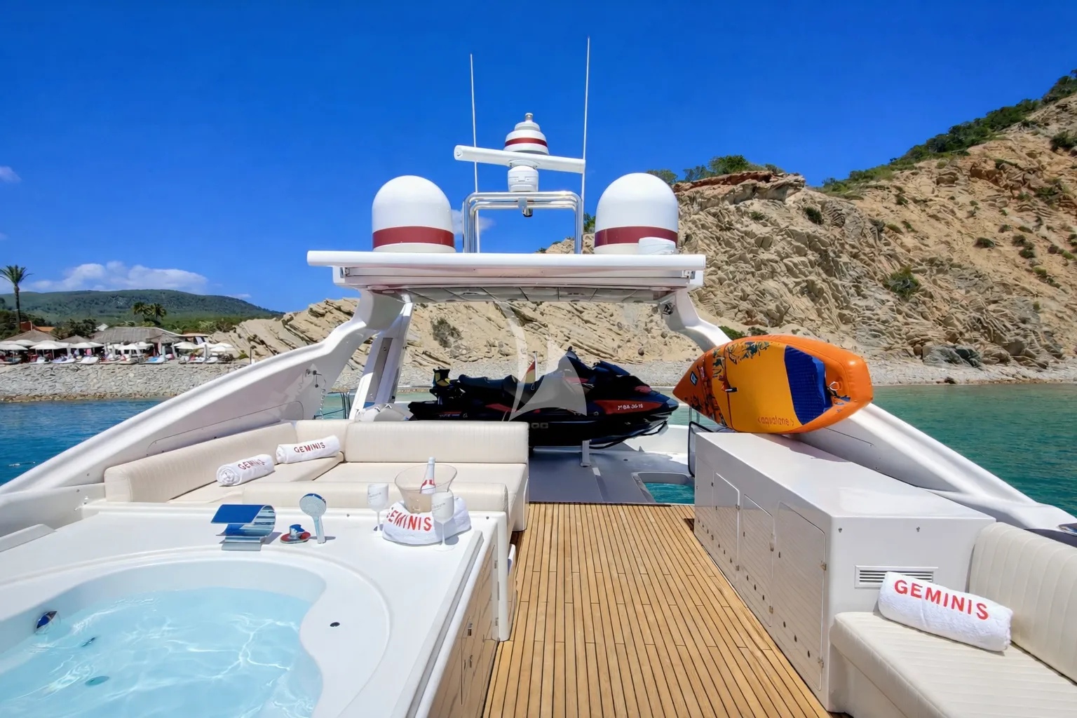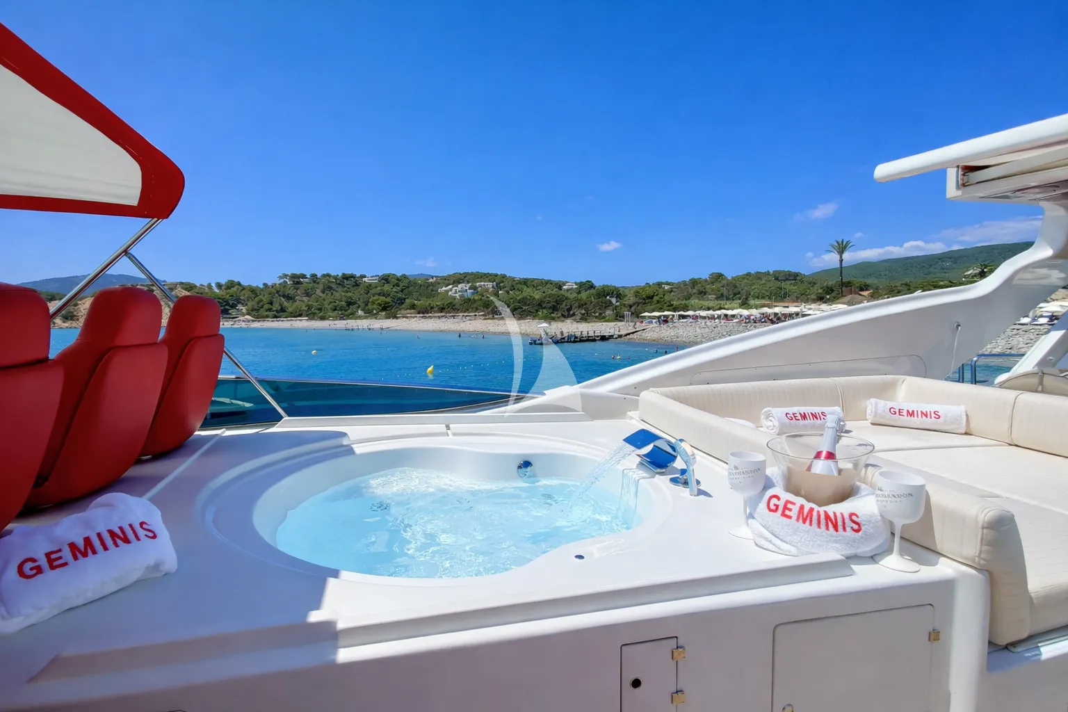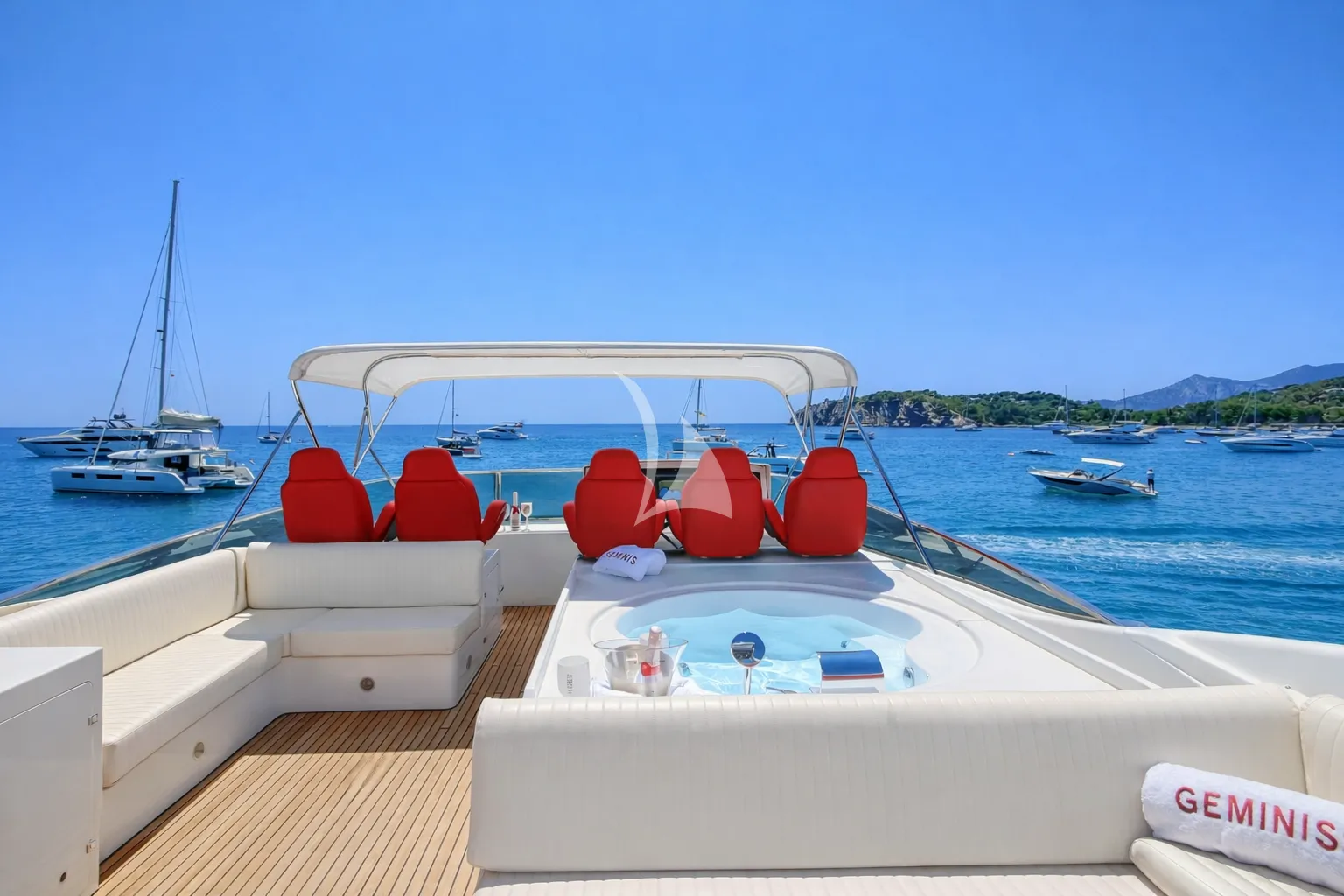 GEMINIS has plenty of exterior decks space to enjoy the warm Mediterranean climates. The aft deck is shaded and boasts an alfresco dining option and built in upholstered seating. Water enthusiasts will be able to make effortless use of the great selection of water toys (Jet Ski, SEABOB, Inflatables) from the extended swim platform. Charter yacht GEMINI is a sun worshipers paradise offering ample sunning. The foredeck has a double sunpad which is easily accessed from the wide side decks. Above, the flybridge offers plenty of further sunning on 2 sunpads, seating and deck space. Probably most importantly for many there is also a flybridge jacuzzi on the deck
