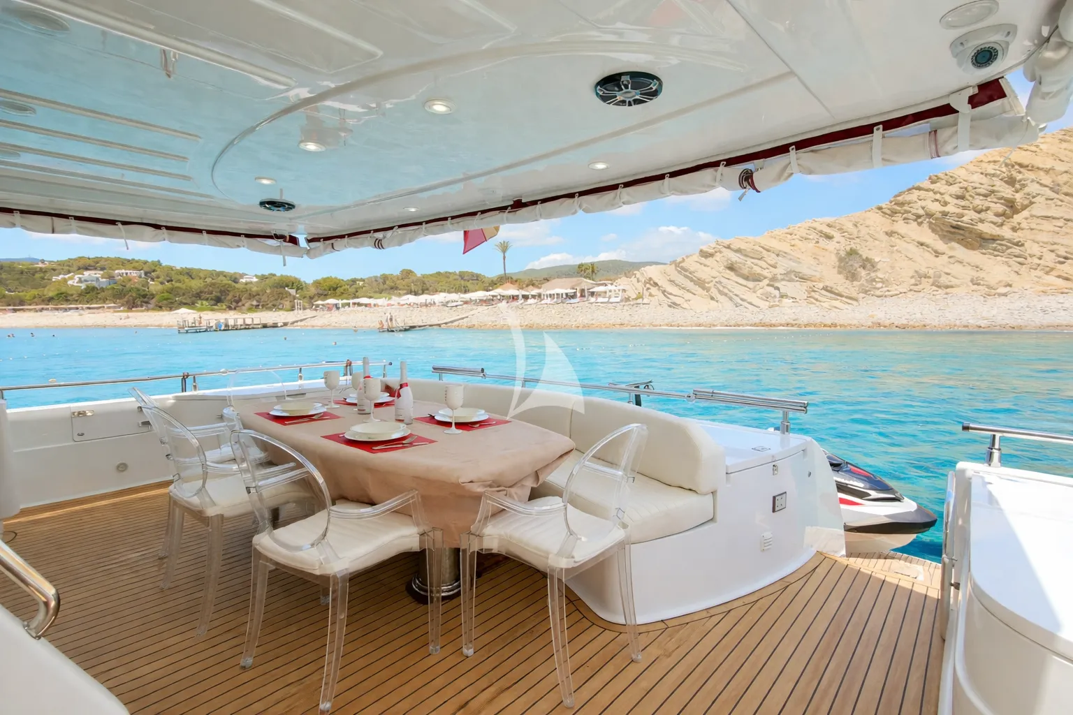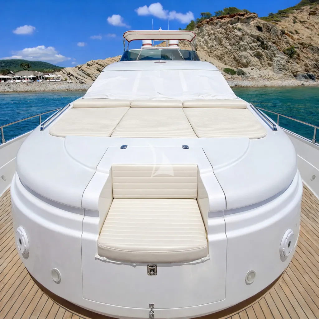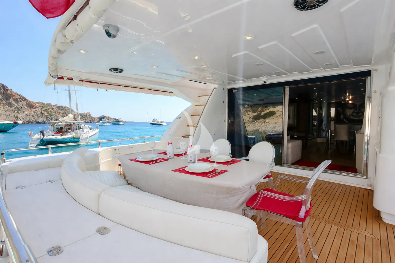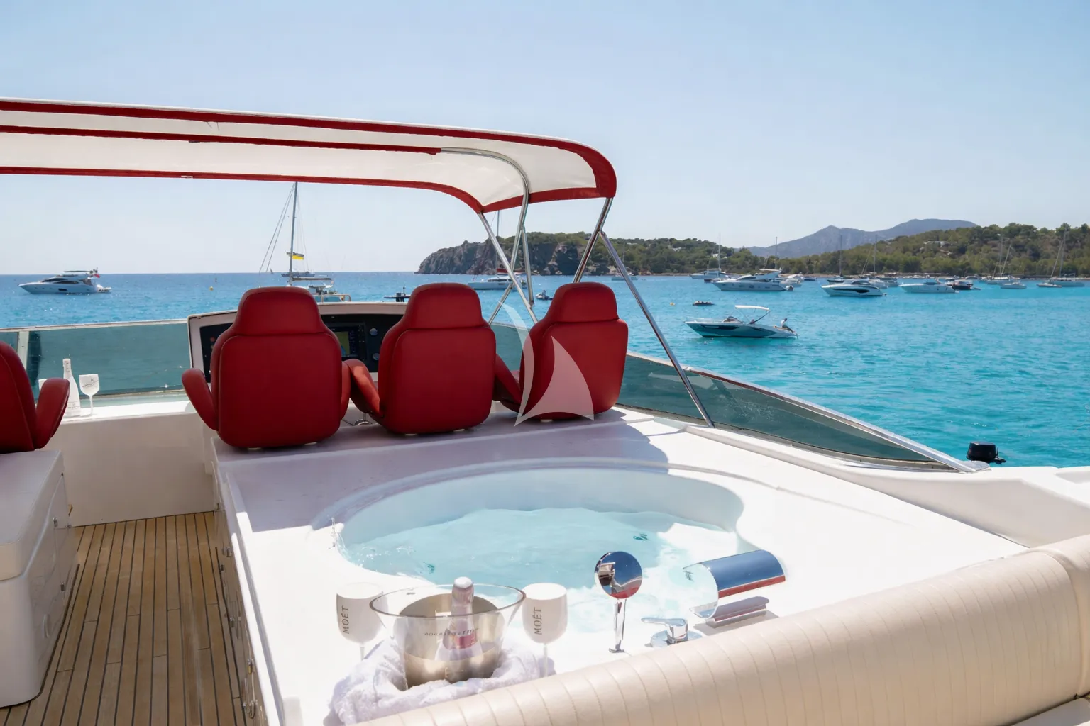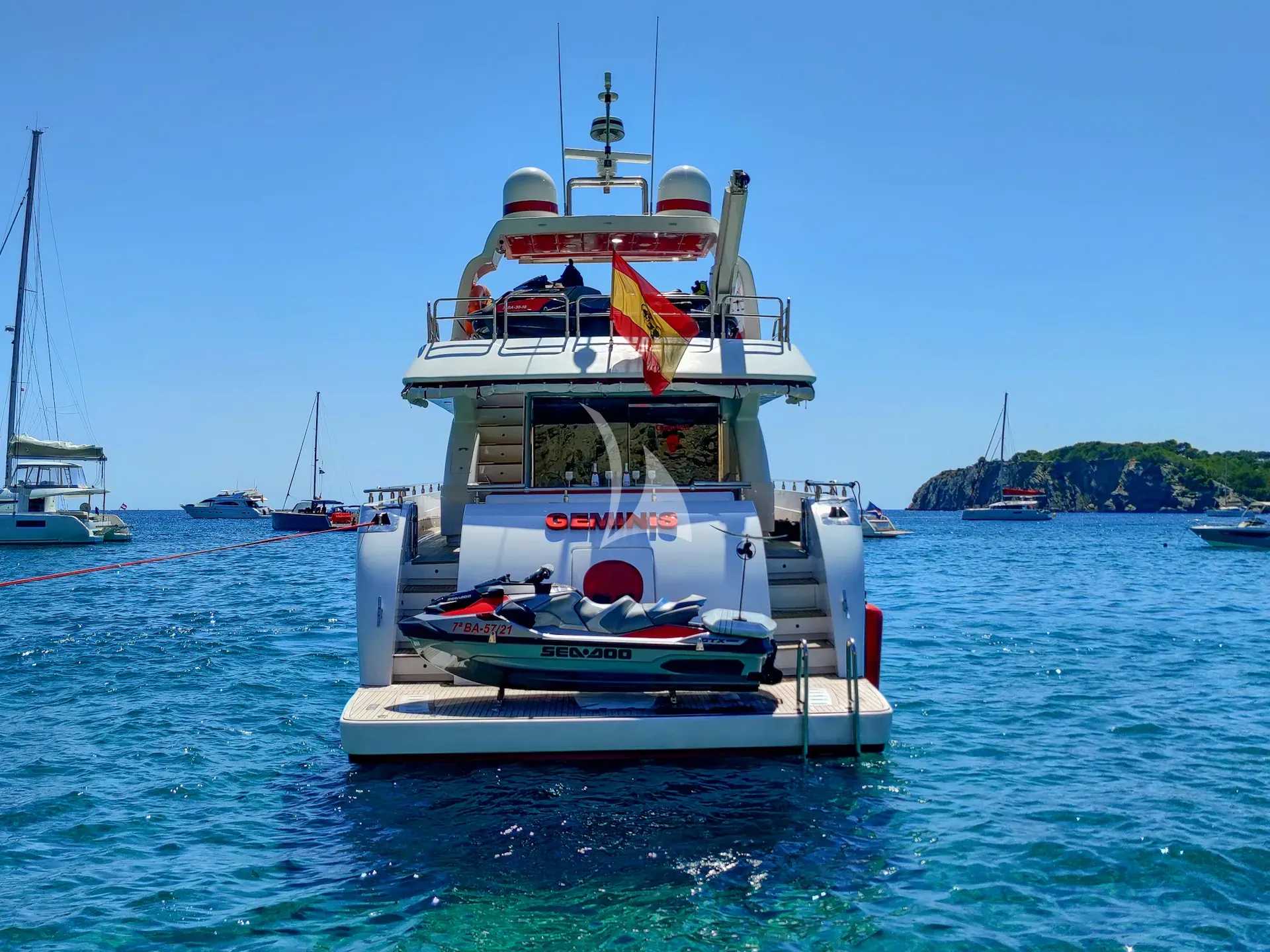 GEMINIS has plenty of exterior decks space to enjoy the warm Mediterranean climates. The aft deck is shaded and boasts an alfresco dining option and built in upholstered seating. Water enthusiasts will be able to make effortless use of the great selection of water toys (Jet Ski, SEABOB, Inflatables) from the extended swim platform. Charter yacht GEMINI is a sun worshipers paradise offering ample sunning. The foredeck has a double sunpad which is easily accessed from the wide side decks. Above, the flybridge offers plenty of further sunning on 2 sunpads, seating and deck space. Probably most importantly for many there is also a flybridge jacuzzi on the deck