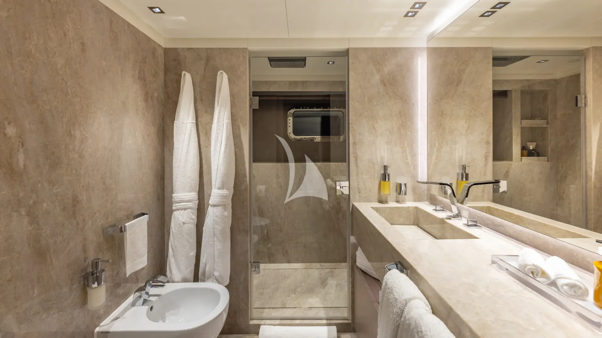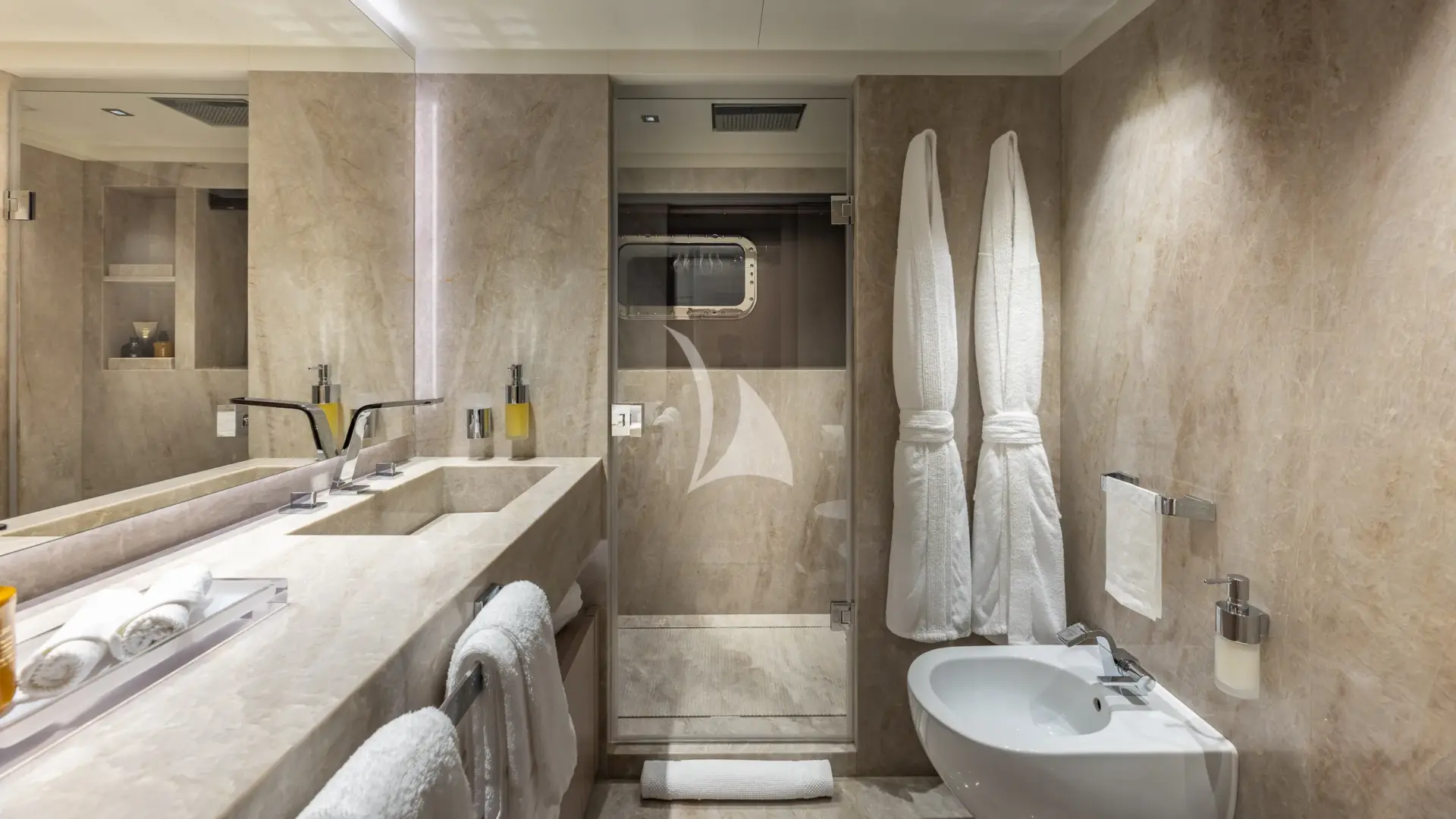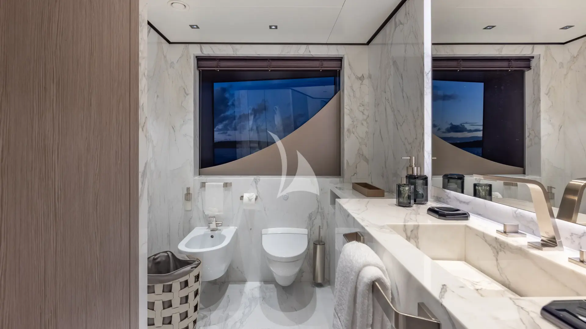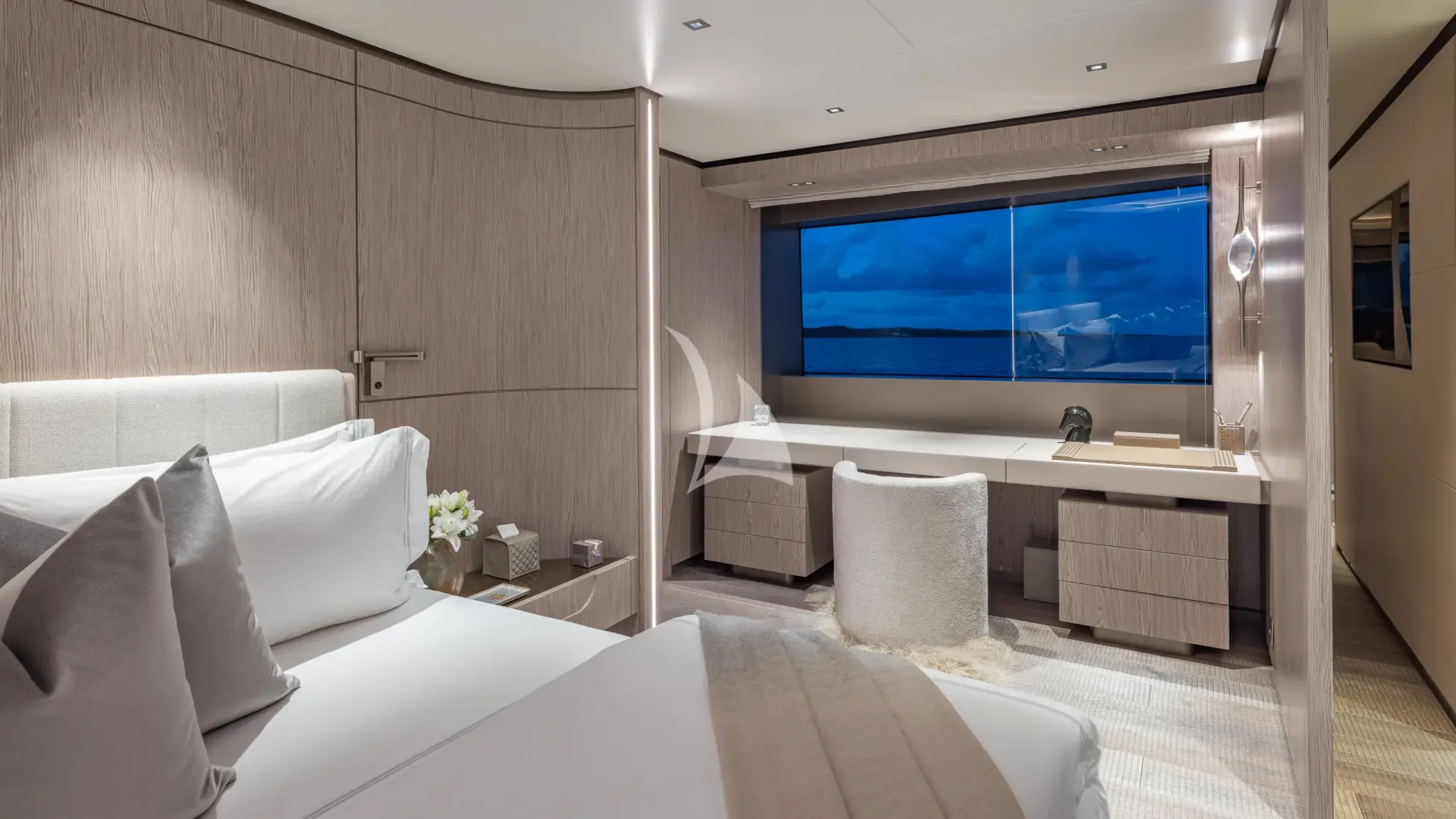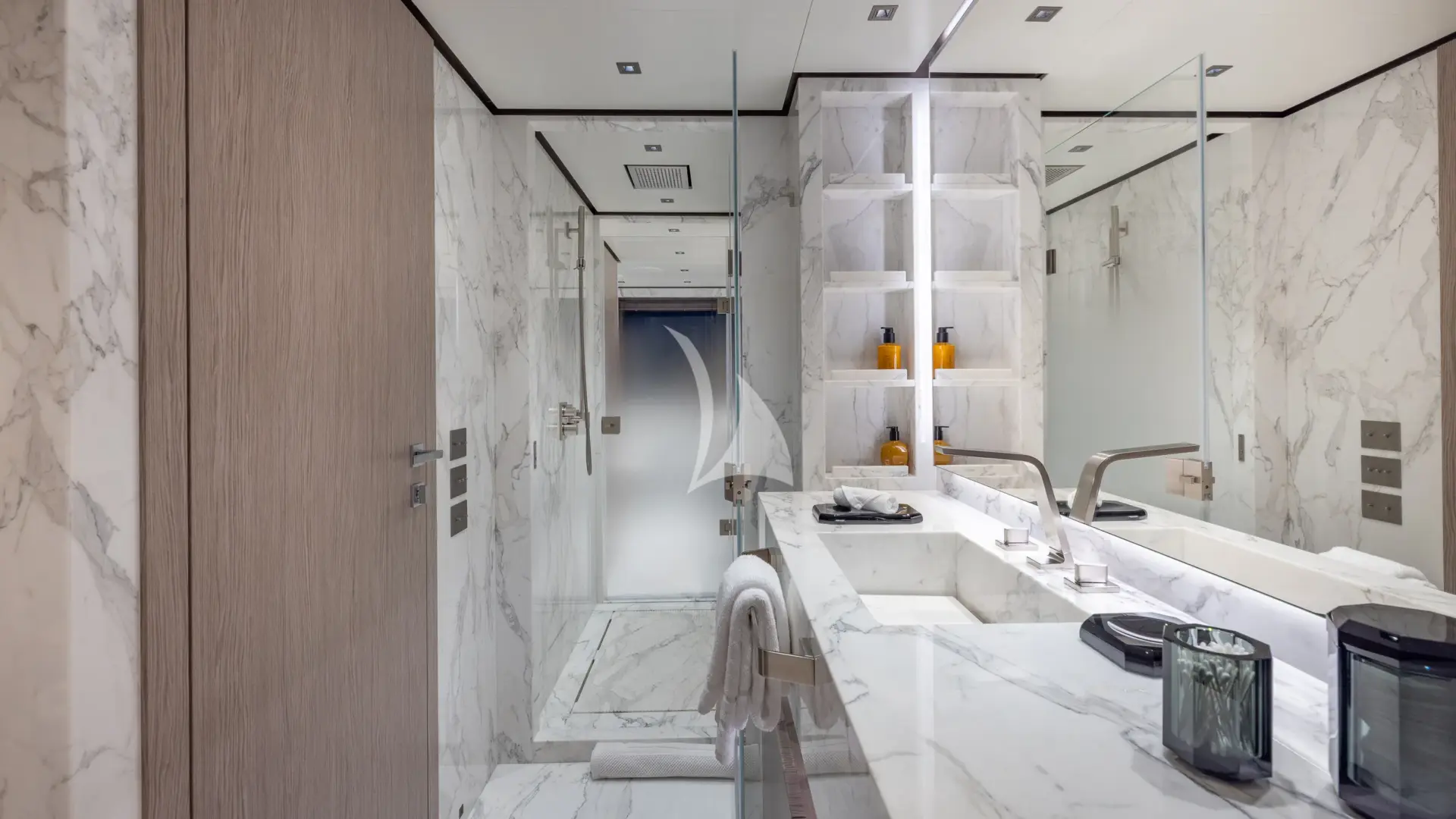 Accommodation for up to 12 guests is beautifully designed. The main deck master suite commands sweeping views from a central king bed, with its own lounge, dressing room, and a marble bathroom that feels like a spa retreat. Below, two double and two twin cabins with pullmans – each with en suite – ensure every guest feels equally indulged.