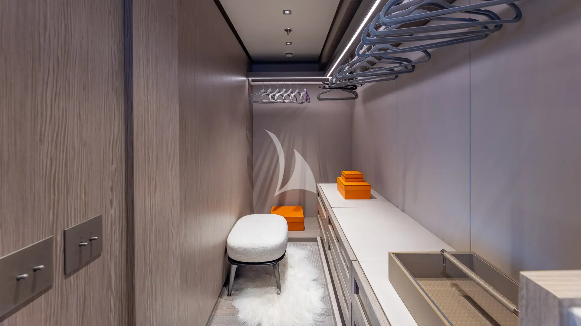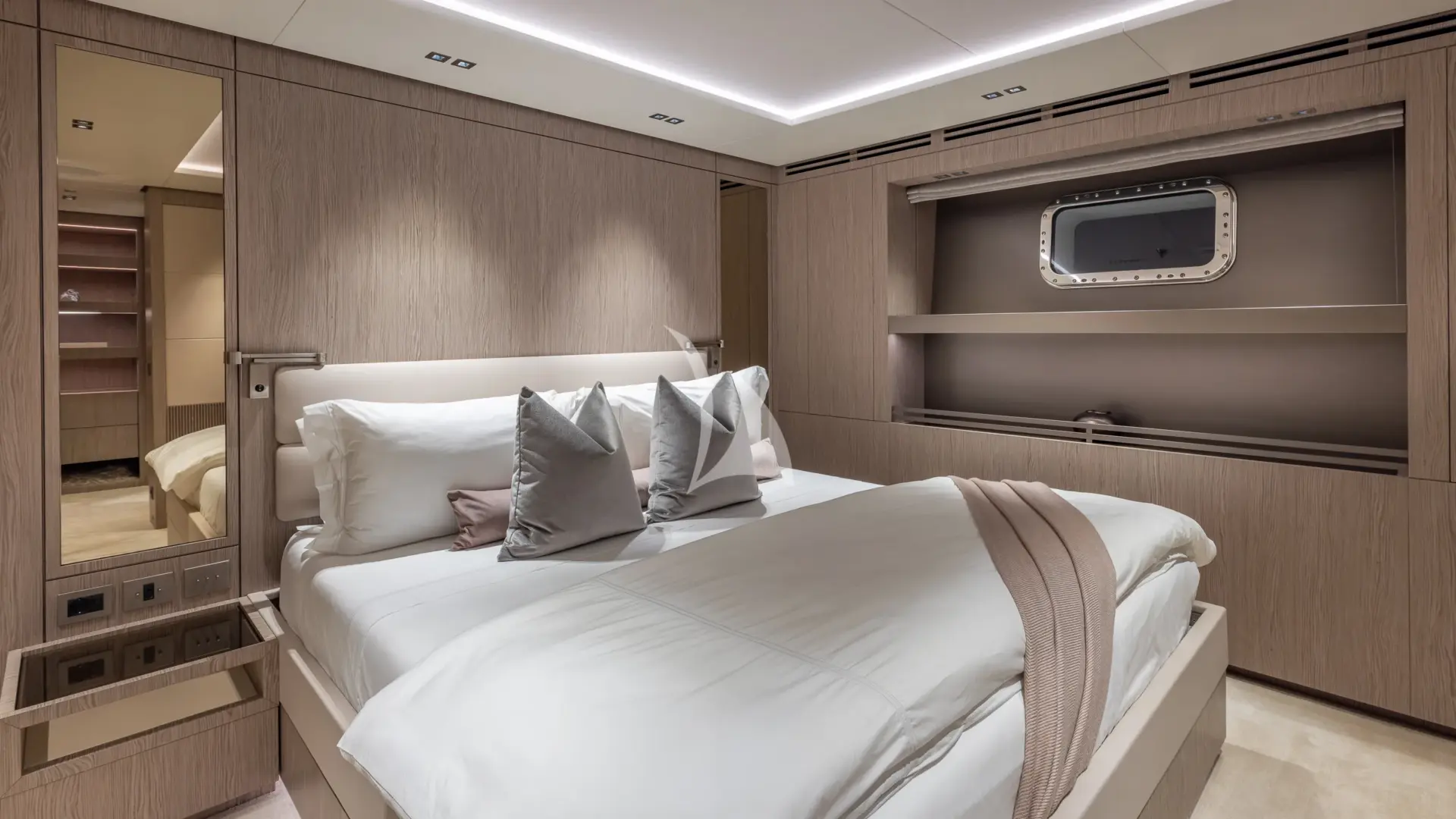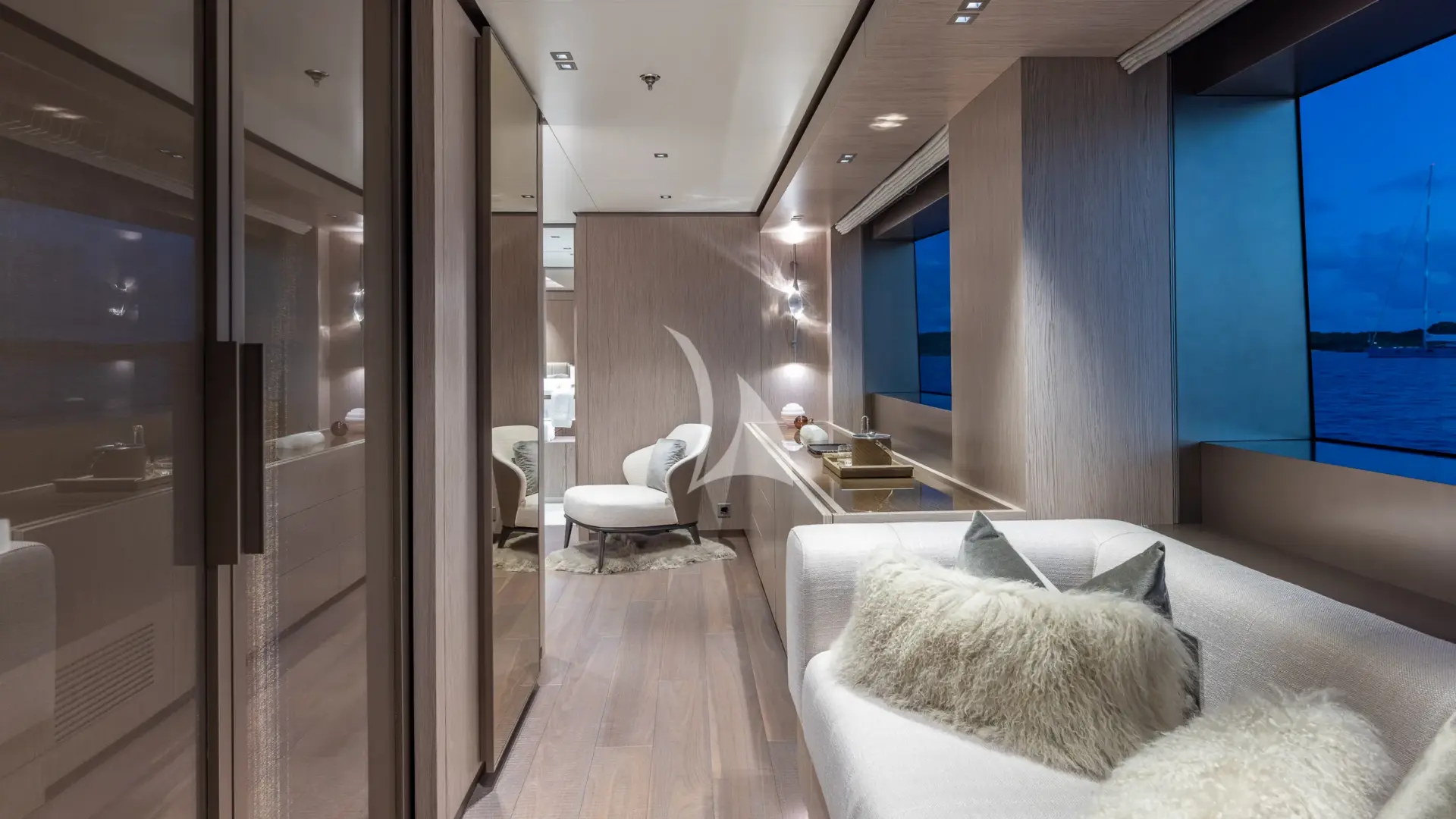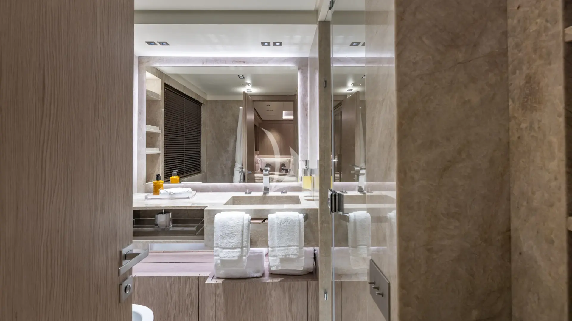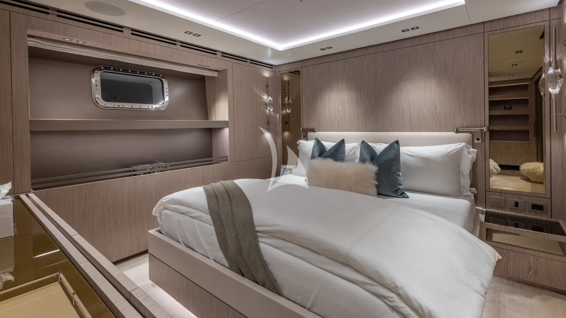 Accommodation for up to 12 guests is beautifully designed. The main deck master suite commands sweeping views from a central king bed, with its own lounge, dressing room, and a marble bathroom that feels like a spa retreat. Below, two double and two twin cabins with pullmans – each with en suite – ensure every guest feels equally indulged.