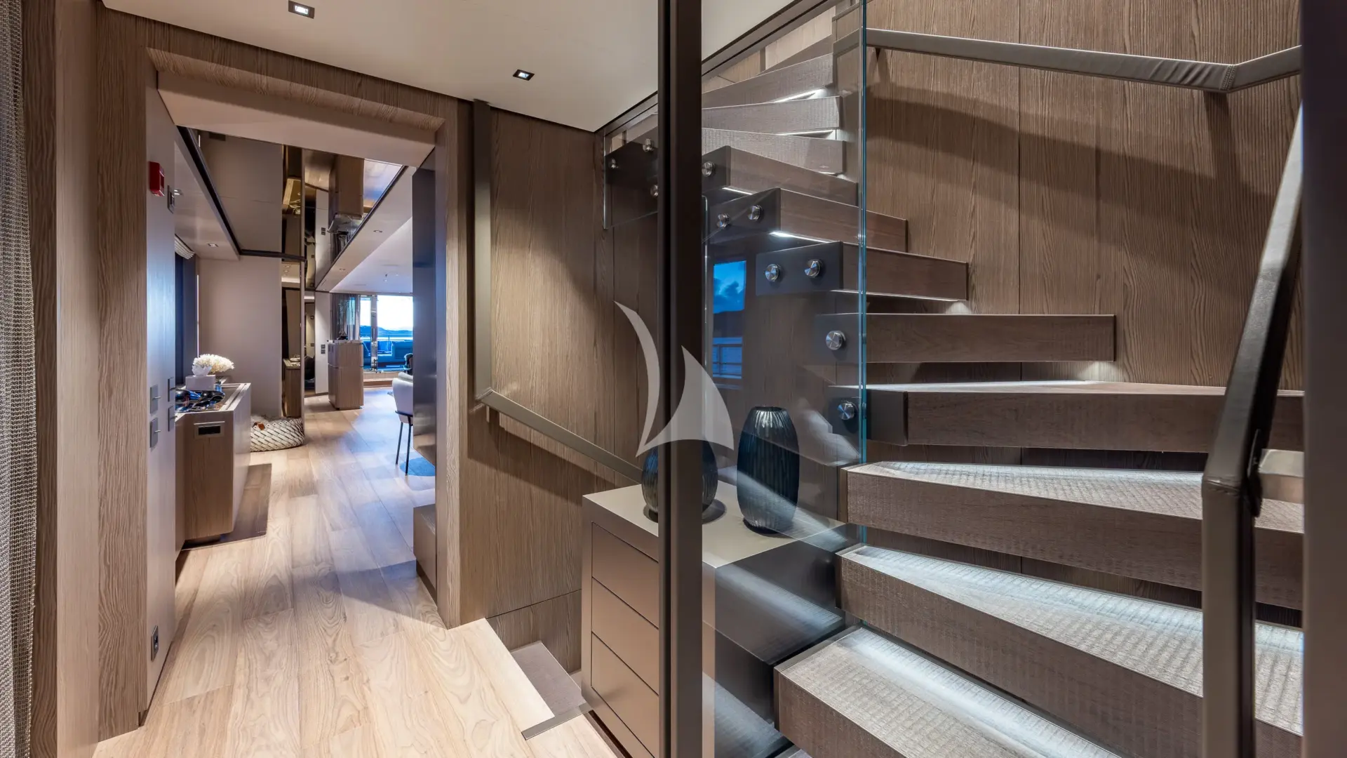 Inside, GIOIA’s interiors are warm and inviting. Light-filled and welcoming, they pair polished marbles and rich woods with a soft, contemporary touch. The main deck lounge invites sociable moments with its bar and seating areas, while the sky lounge one deck up is a snug but spacious living room with panoramic views and an easy flow out onto the upper aft deck.