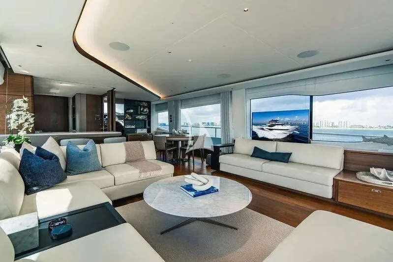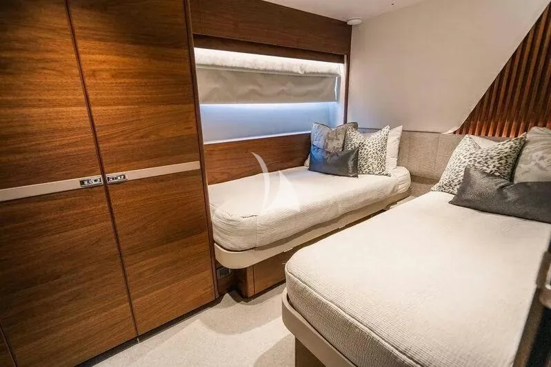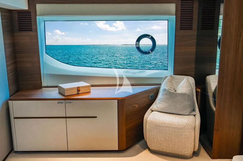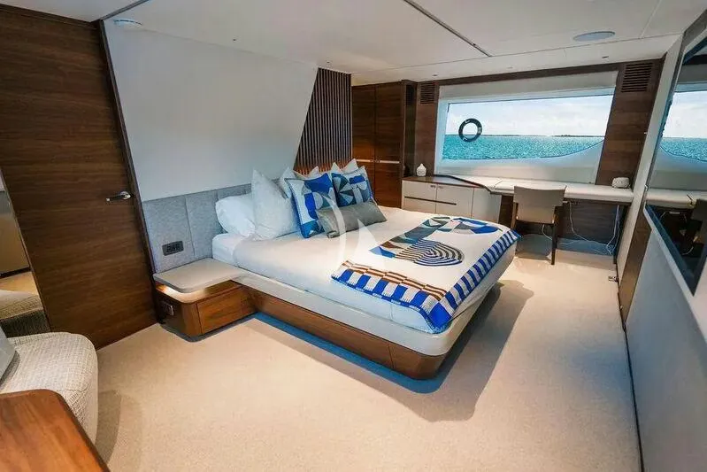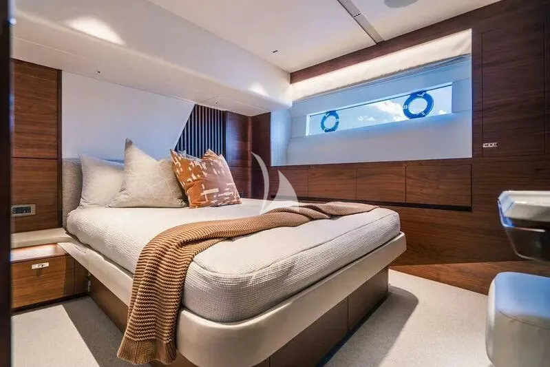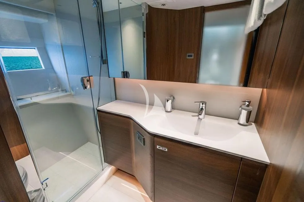 Below deck, the same design language continues throughout four beautifully appointed ensuite cabins sleeping 8 guests. The full-beam Master suite is particularly impressive, featuring expansive hull windows and a spacious bathroom finished with contemporary detailing and rainfall shower. The full-beam VIP offers similar volume and natural light, while the double cabin and convertible twin cabin provides flexible, elegant accommodation.