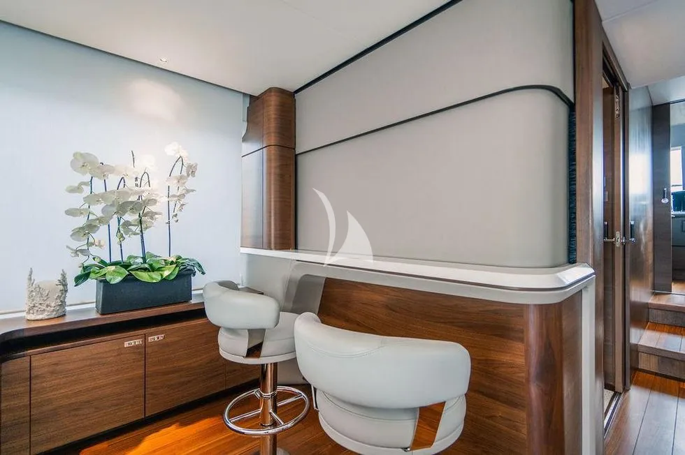 Inside, GYPZY presents a refined, contemporary interior defined by rich walnut finishes, soft neutral furnishings and expansive panoramic windows that flood the main salon with natural light. Full-height sliding glass doors in the main salon open completely to create a seamless connection between the interior and aft deck. The atmosphere is warm and architectural, with clean lines and subtle ambient lighting enhancing the sense of space. A generous L-shaped lounge and additional sofa create a relaxed social setting, centred around a retractable television, while the dining area comfortably accommodates up to eight guests against a backdrop of uninterrupted sea views. The open galley connects seamlessly to the salon via a stylish bar, which can be screened off for privacy when desired, allowing the space to shift effortlessly between informal living and more formal entertaining.