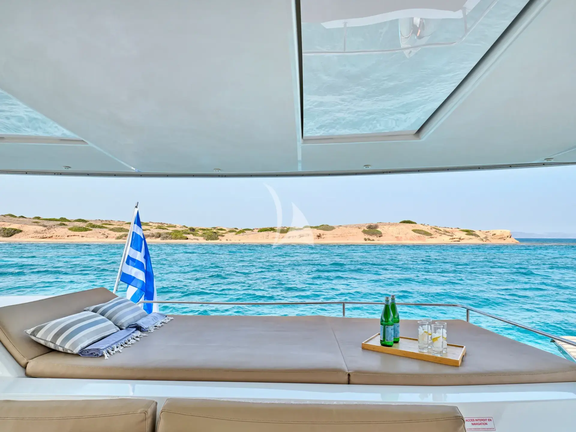 The elegant aft deck is where memories come to life. Gather around the dining table to savor Mediterranean-inspired meals, enjoy refreshing cocktails after a day in the sun, or simply relax with friends and family. Guests looking for excitement will love the wide array of water toys, including water skis, kayaks, paddleboard, wakeboard, tubes, and full snorkeling gear. The foredeck is a sun-lover’s paradise, offering plush sun mattresses, a trampoline for relaxing above the sea, and front-row views for spotting dolphins dancing alongside the bow. Meanwhile, the flybridge is the perfect elevated sanctuary—ideal for toasting the sunset with a glass of champagne and indulging in gourmet hors d’oeuvres as the sky turns gold.