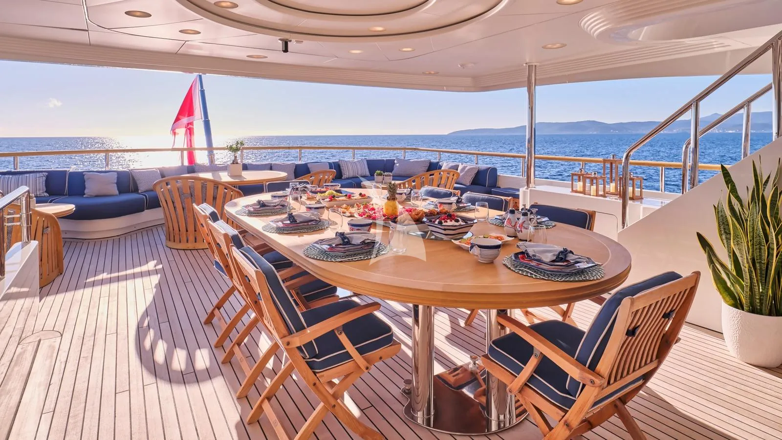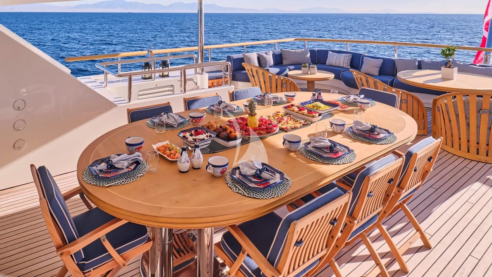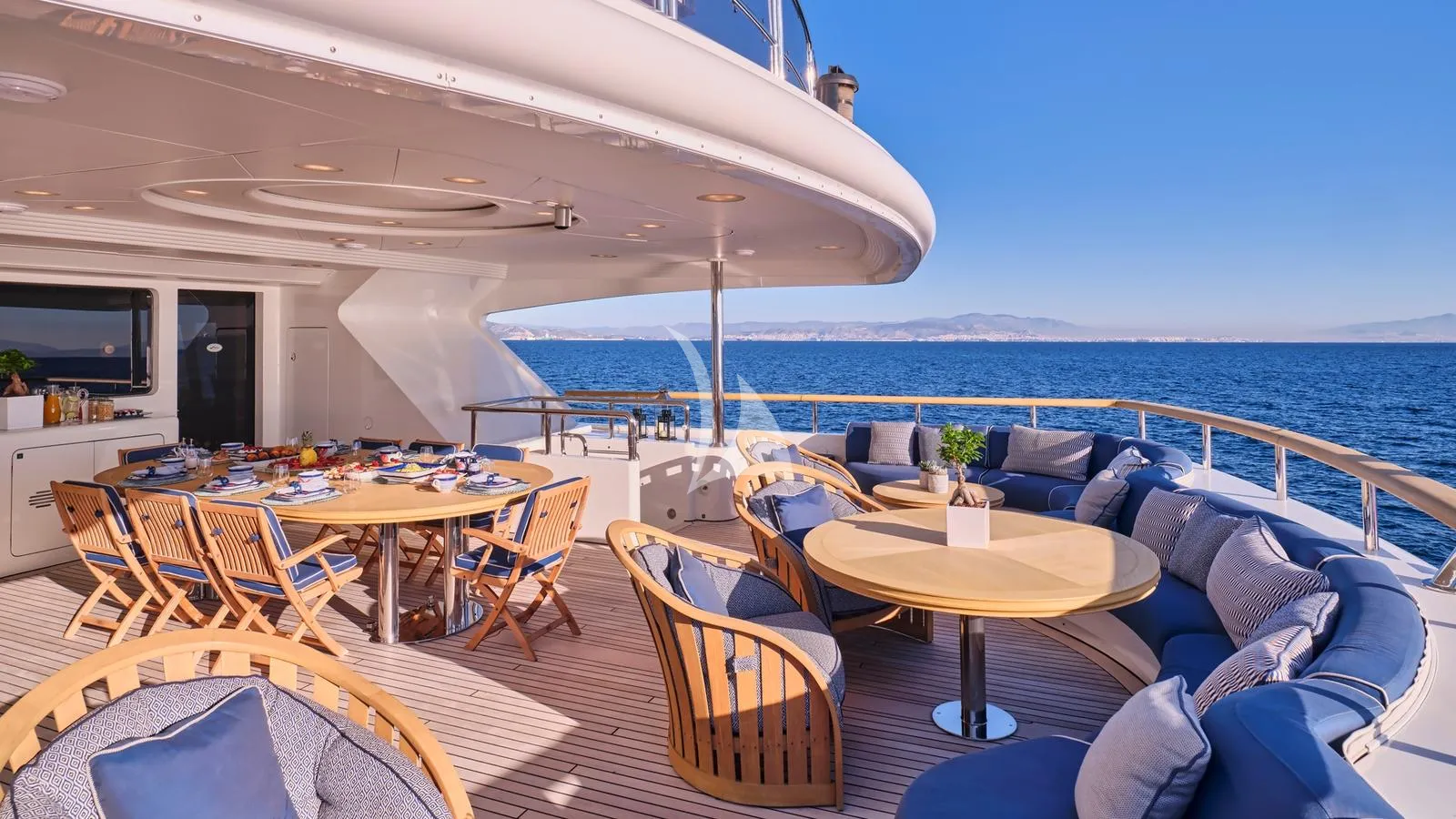 Across her three expansive decks, JO I provides an abundance of outdoor living spaces designed for refined relaxation and effortless entertaining. Guests can enjoy alfresco lounges, shaded dining areas, and sweeping views from every angle. The vast sundeck is a standout, boasting a chic bar, indulgent Jacuzzi, generous sunpads, and shaded lounging areas, perfect for everything from long sun-soaked afternoons to evening cocktails under the stars.