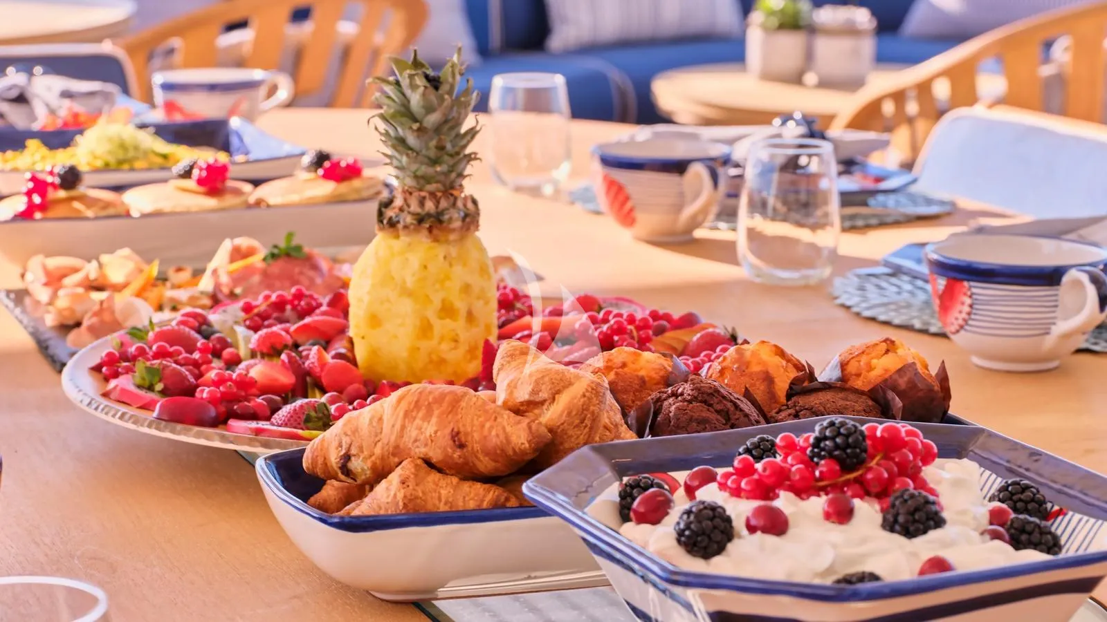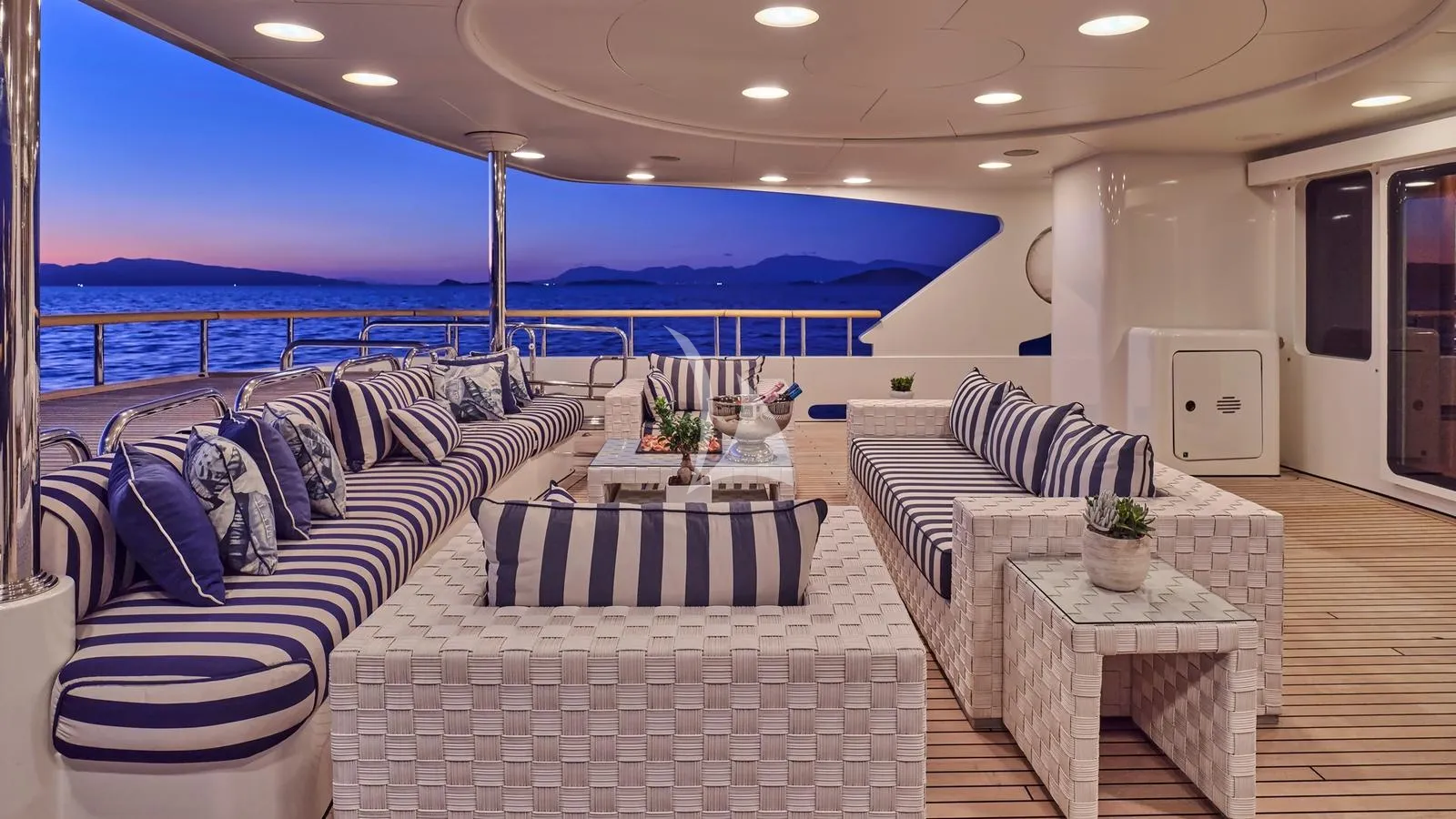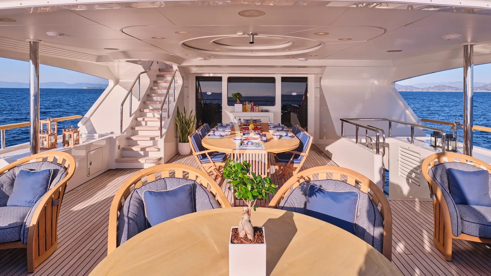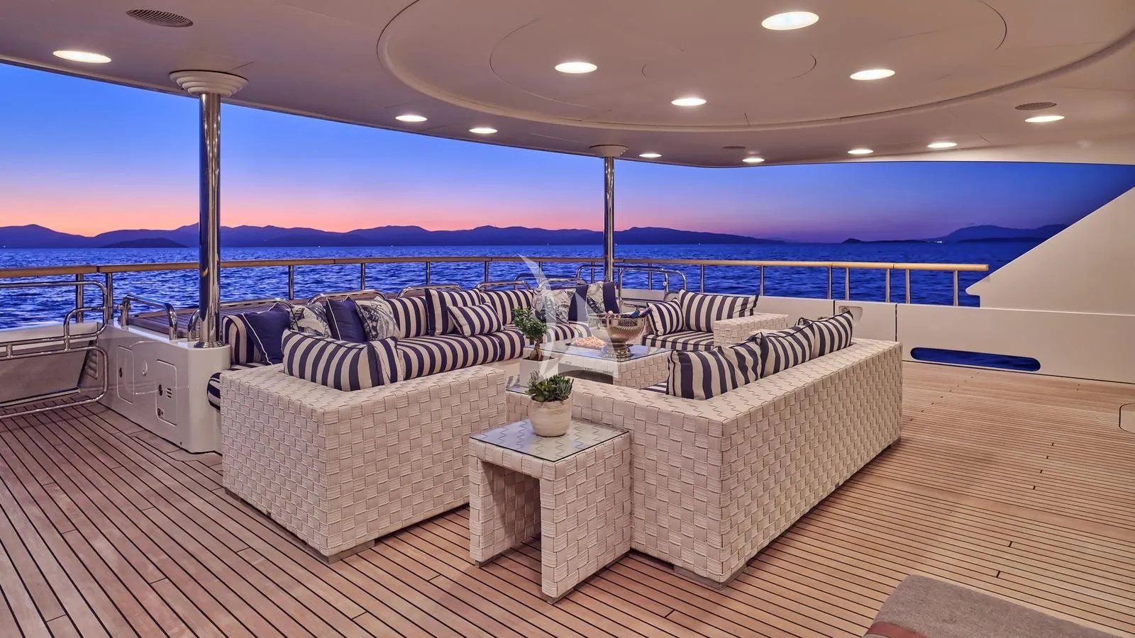 Across her three expansive decks, JO I provides an abundance of outdoor living spaces designed for refined relaxation and effortless entertaining. Guests can enjoy alfresco lounges, shaded dining areas, and sweeping views from every angle. The vast sundeck is a standout, boasting a chic bar, indulgent Jacuzzi, generous sunpads, and shaded lounging areas, perfect for everything from long sun-soaked afternoons to evening cocktails under the stars.