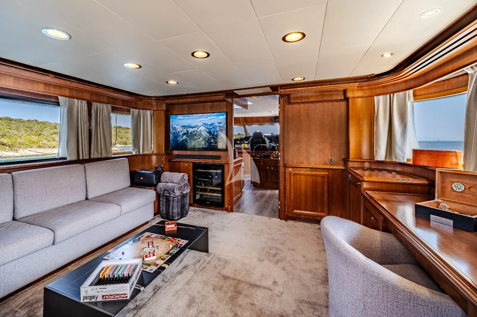 The main deck features long side windows that fill the bright interior with natural light and provide stunning sea views. The salon offers a comfortable space to relax with family and friends. An expandable dining table can fit 10 people comfortably.