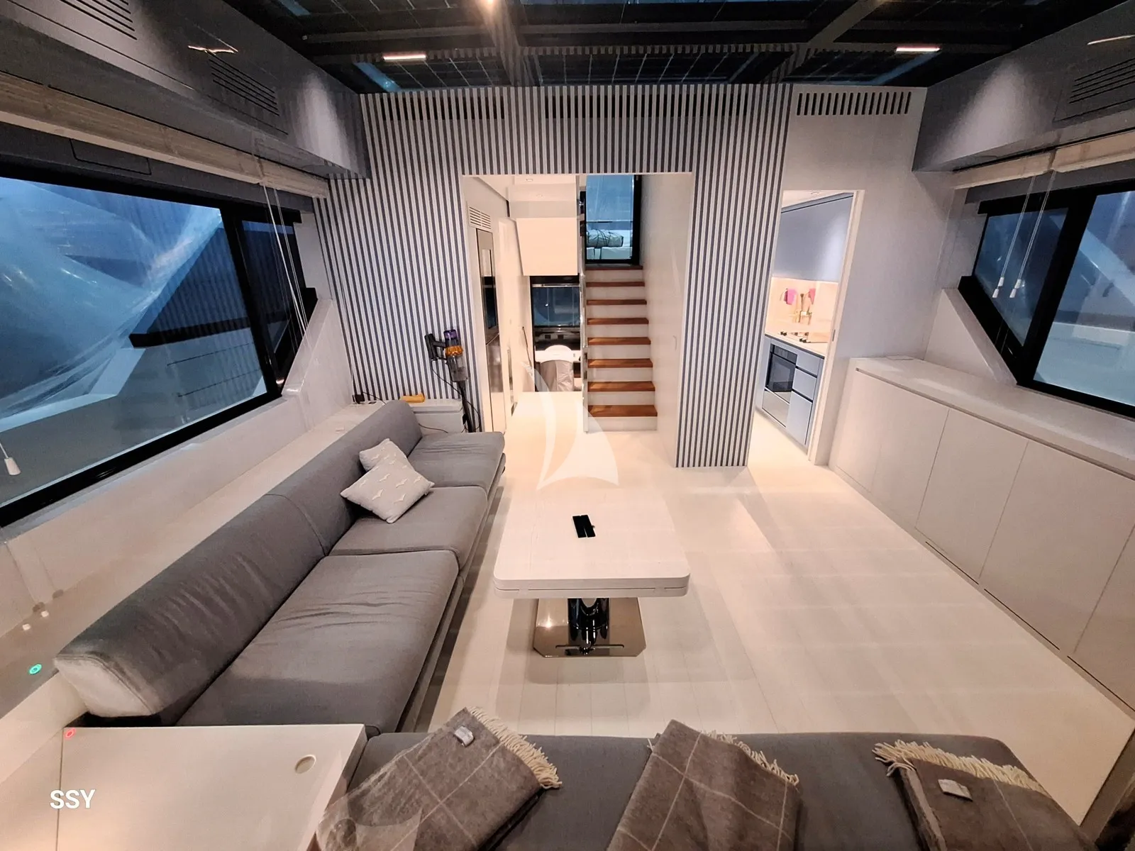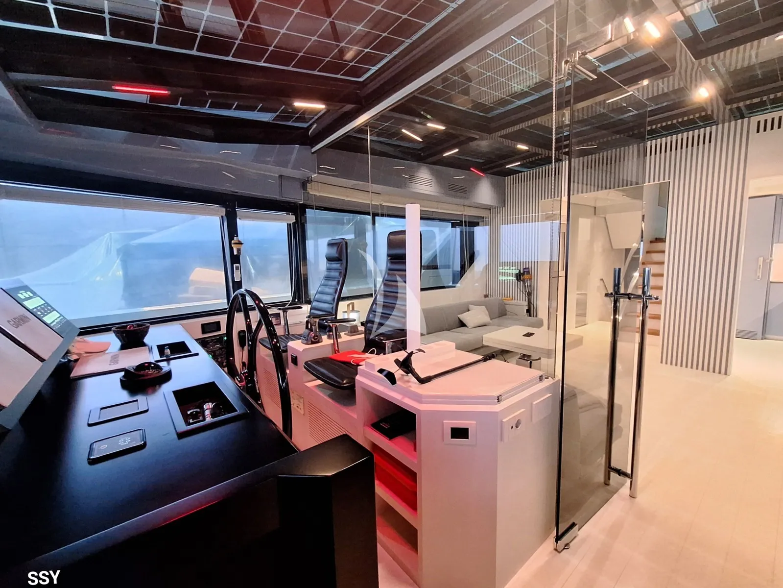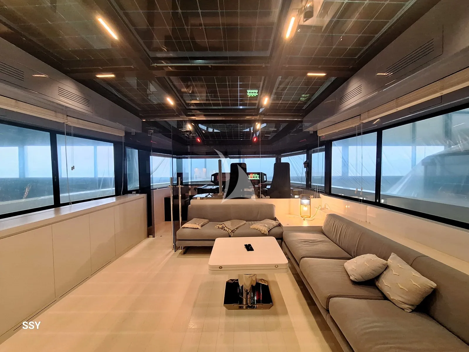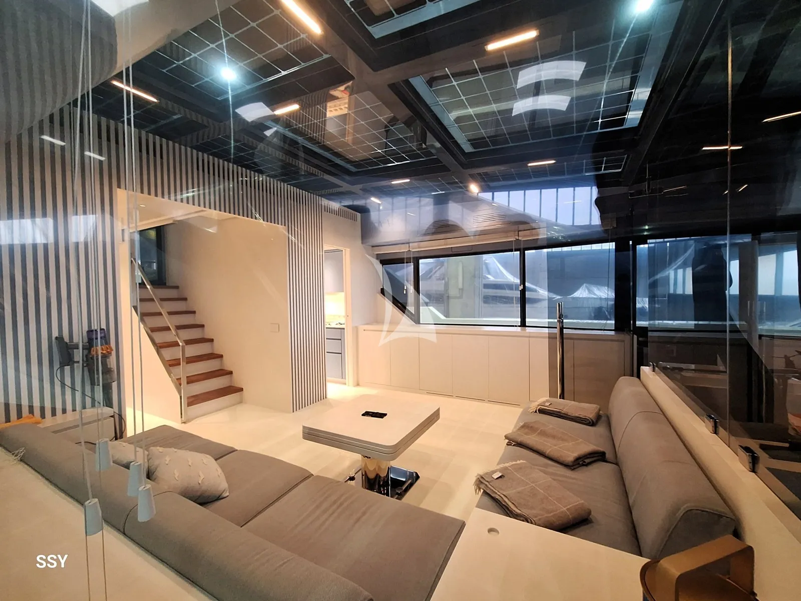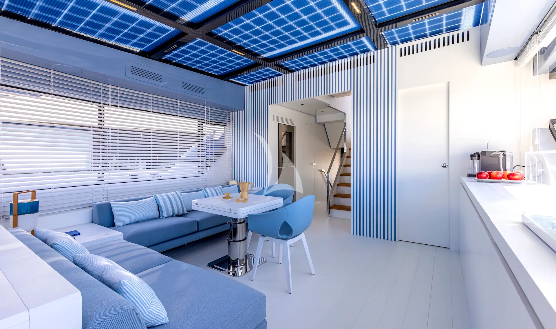 From a technical standpoint, the yacht is equipped with twin Volvo Penta IPS 1350 engines, delivering a top speed of approximately 23 knots and a cruising range of over 1,200 nautical miles at around 10 knots. Energy efficiency is an integral part of Arcadia’s DNA: the solar panels installed onboard generate up to 3 kW of clean energy, reducing fuel consumption and environmental impact.
