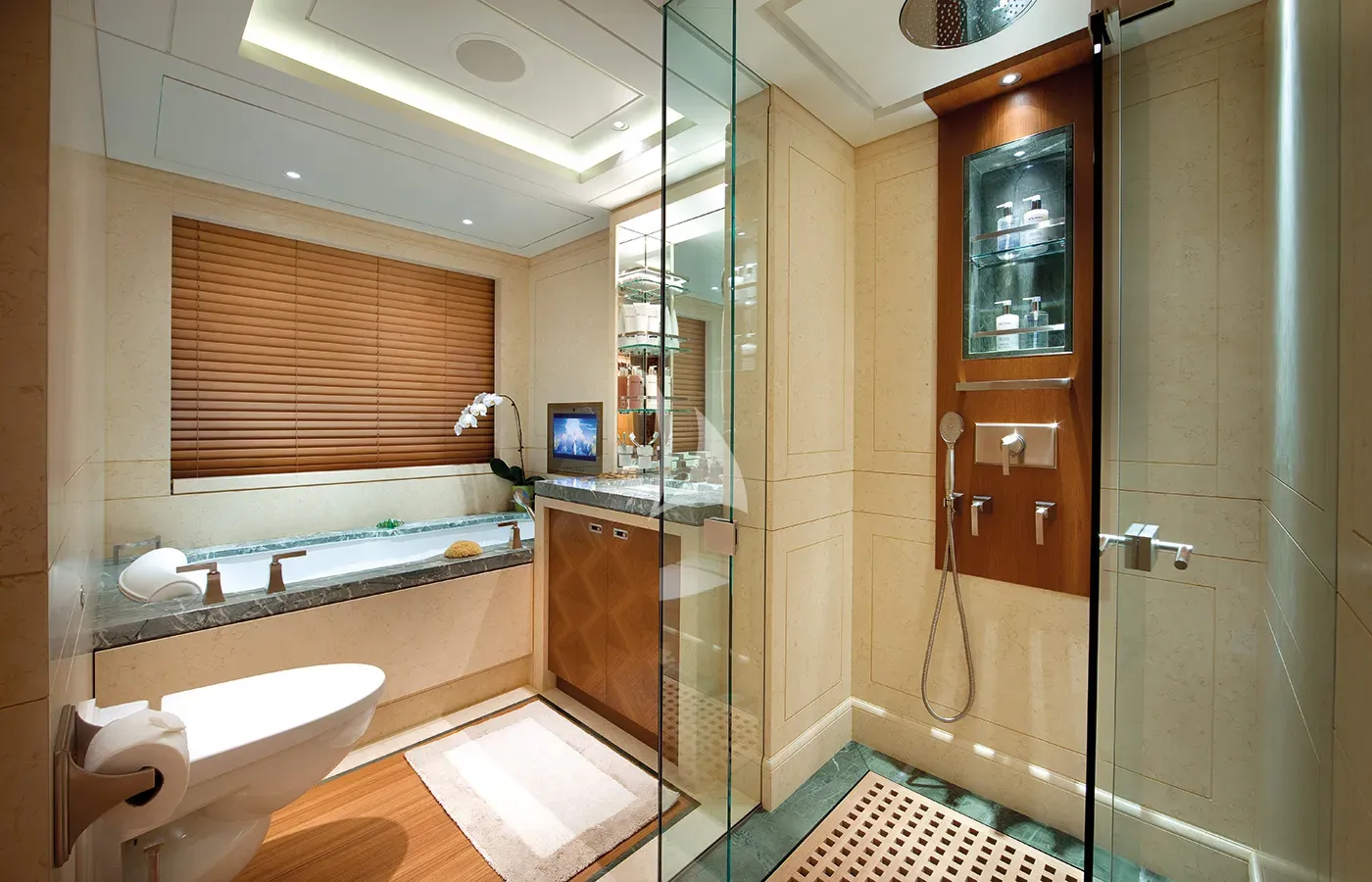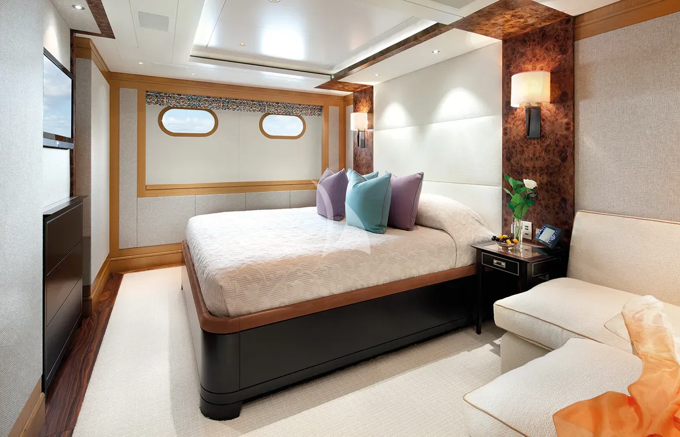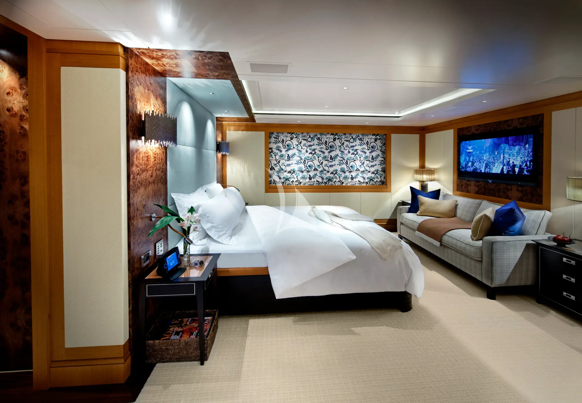 A main-deck master is complemented by six large lower-deck guest suites, two of which can transform into a full-width VIP suite as fine as the master.