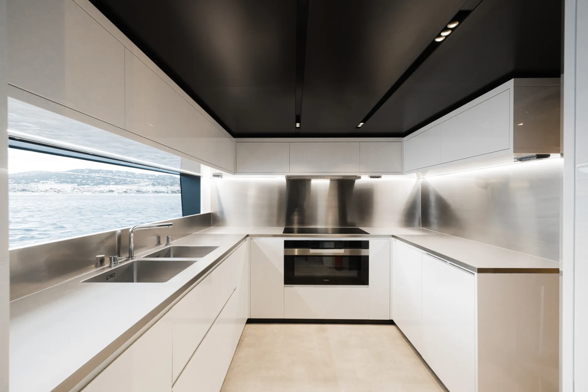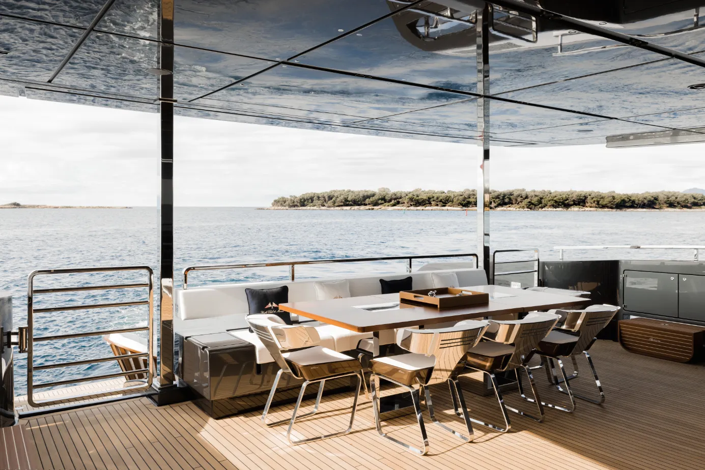 LADY FIRST stands apart with her beautifully proportioned decks, creating a seamless flow between indoor and outdoor living spaces. This design makes her ideal for both intimate gatherings and larger social events. The beach club offers direct water access, while the deck jacuzzi provides the perfect spot to relax and soak in breathtaking views. Equipped with underwater lights, Starlink Wi-Fi, and an extensive selection of water toys, including Jet Skis, Seabobs, and paddleboards, LADY FIRST offers the perfect blend of tranquility and adventure.