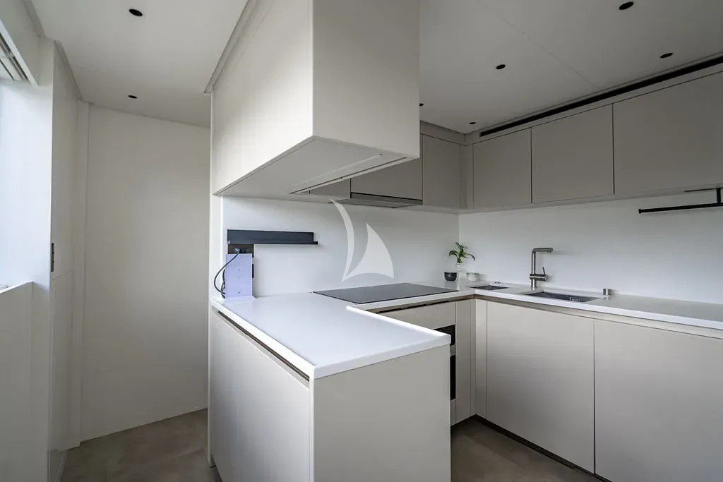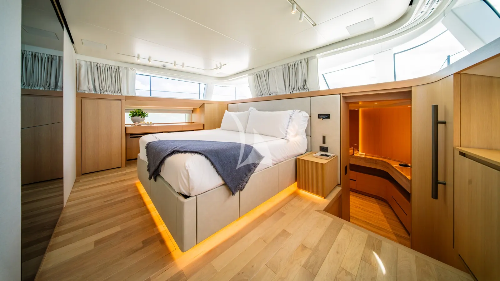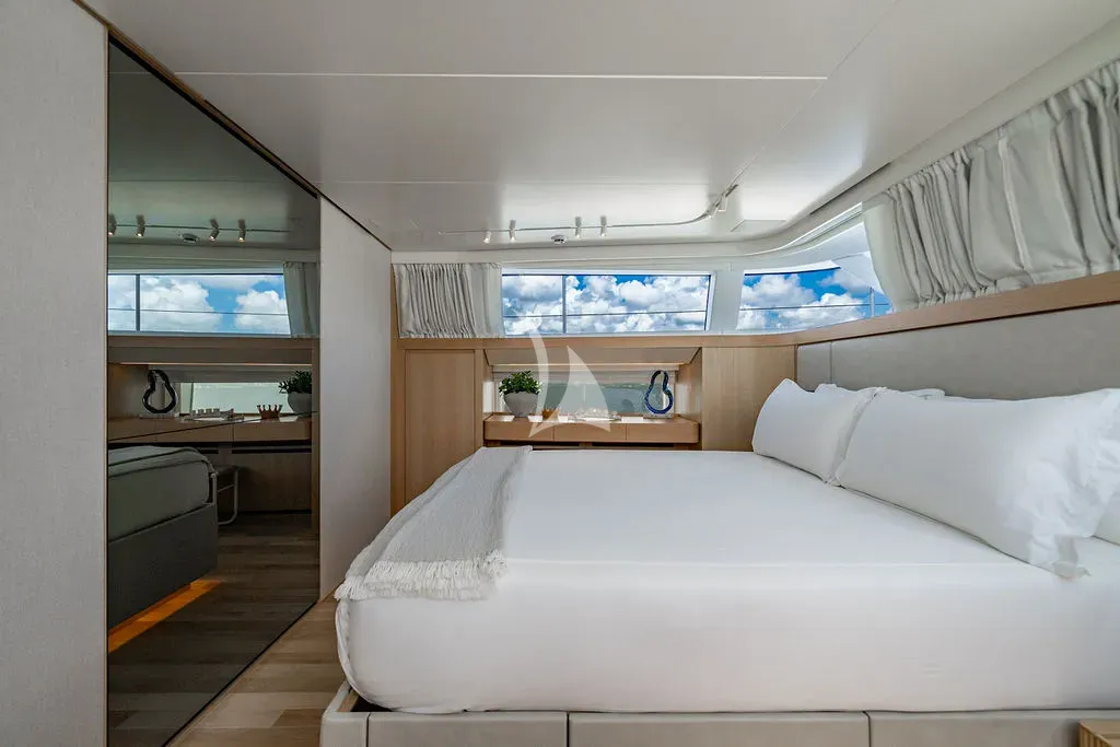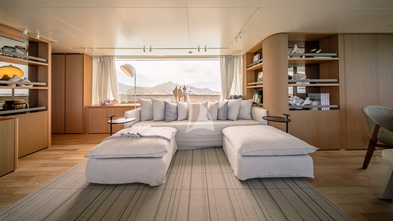 Aboard LAILA, every space invites connection. Expansive exterior decks transition seamlessly into sunlit salons, while full-height windows blur the line between sea and sky. The on-deck master suite and three additional guest cabins accommodate up to nine guests in serene comfort, complemented by a warm, minimalist interior palette and rich tactile finishes.