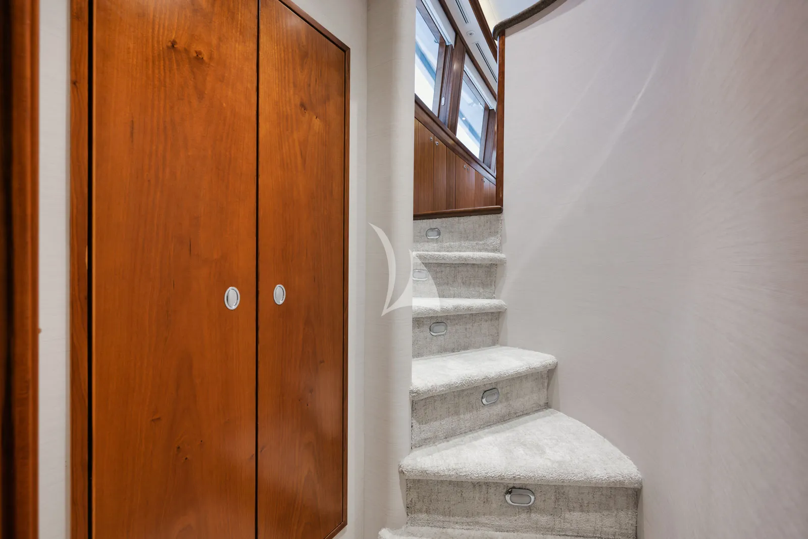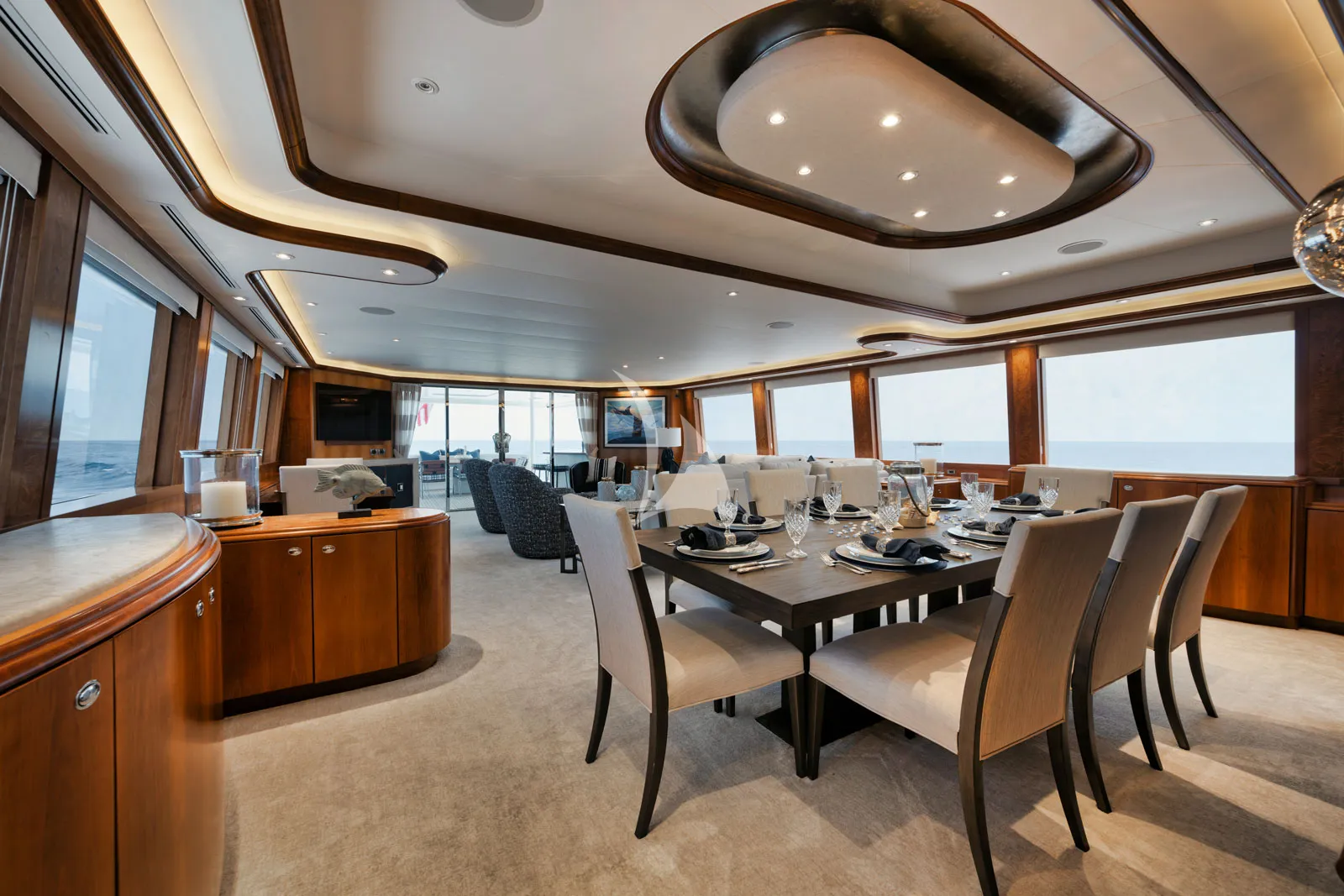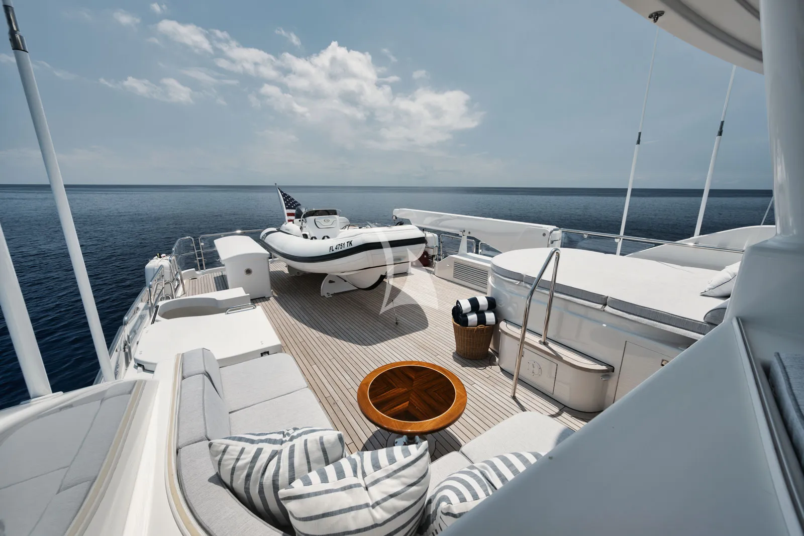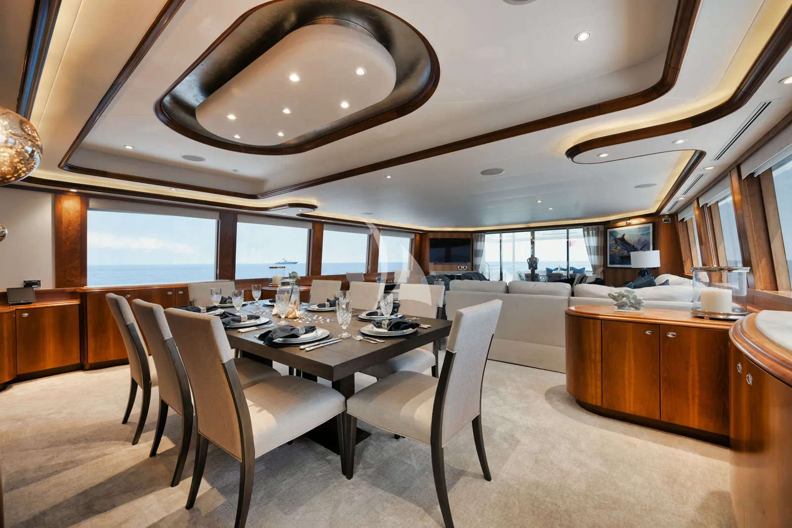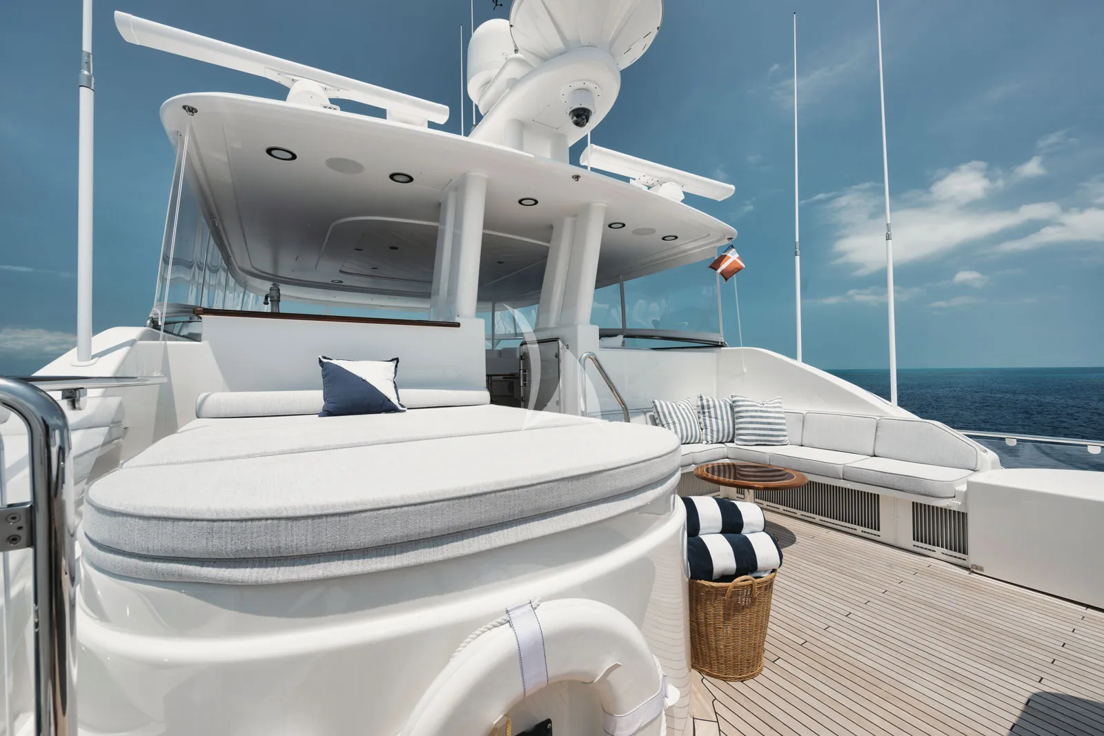 Her expansive deck spaces are ideal for both entertaining and unwinding. The main aft deck offers elegant al fresco dining, while the covered flybridge features wrap-around seating and convertible dining for eight under a hardtop. The sundeck Jacuzzi converts into a large raised sunpad, perfect for soaking in panoramic views. Forward, a circular seating area creates an intimate setting for sunset cocktails.