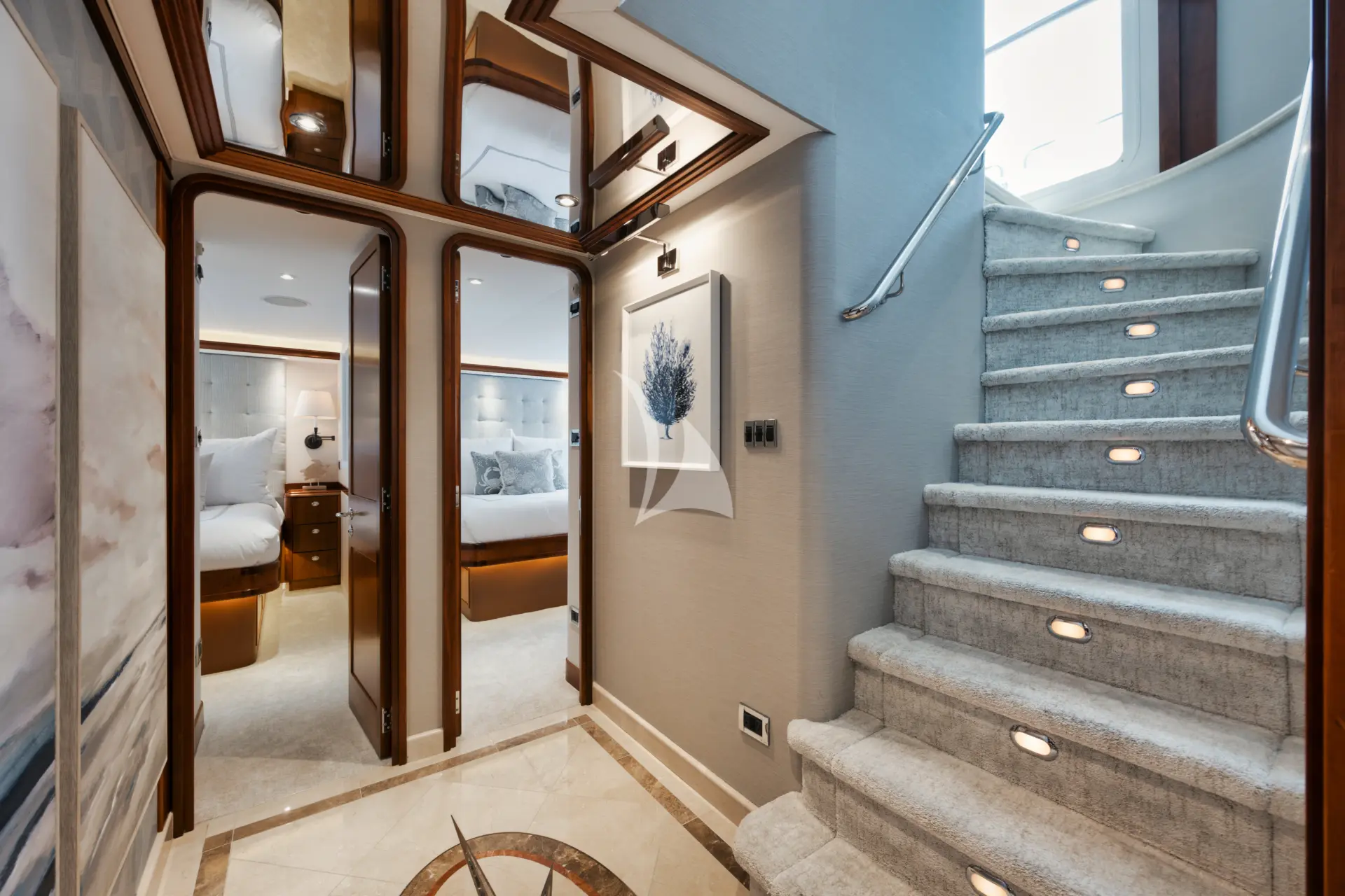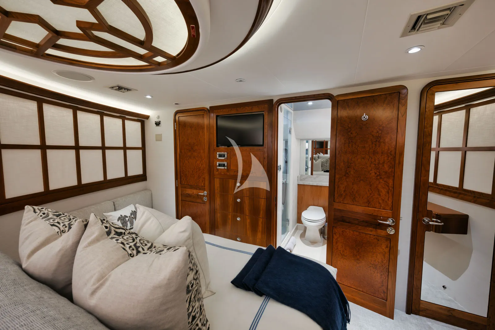 LEGACY accommodates up to 8 guests in 4 beautifully appointed en suite staterooms, including a full-beam Master suite with a King bed and his-and-hers bath, a forward VIP Queen, and two additional Queen guest staterooms. Each cabin is equipped with entertainment systems and thoughtfully designed storage, ensuring privacy and relaxation for every guest.