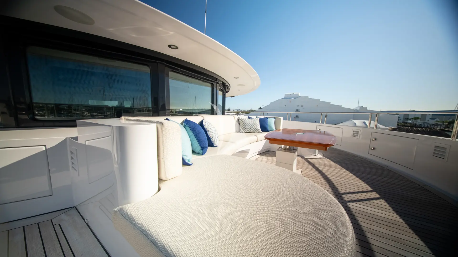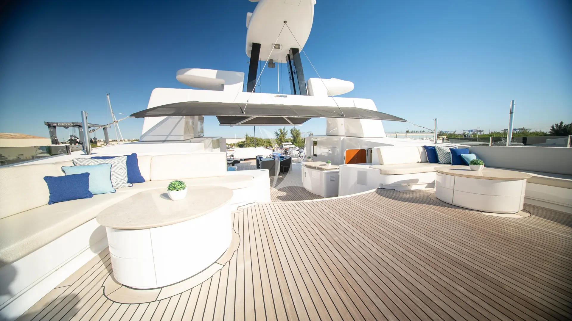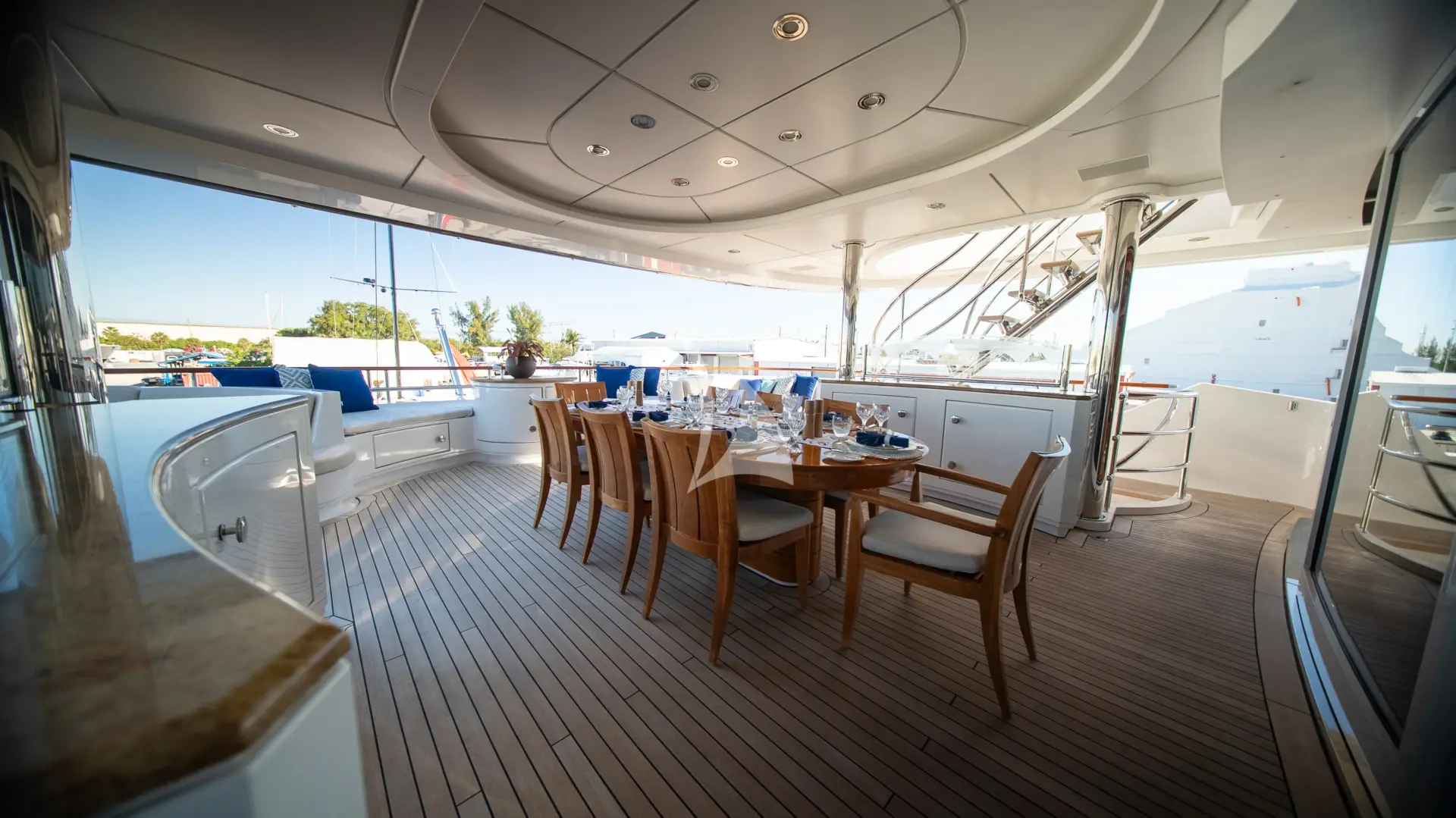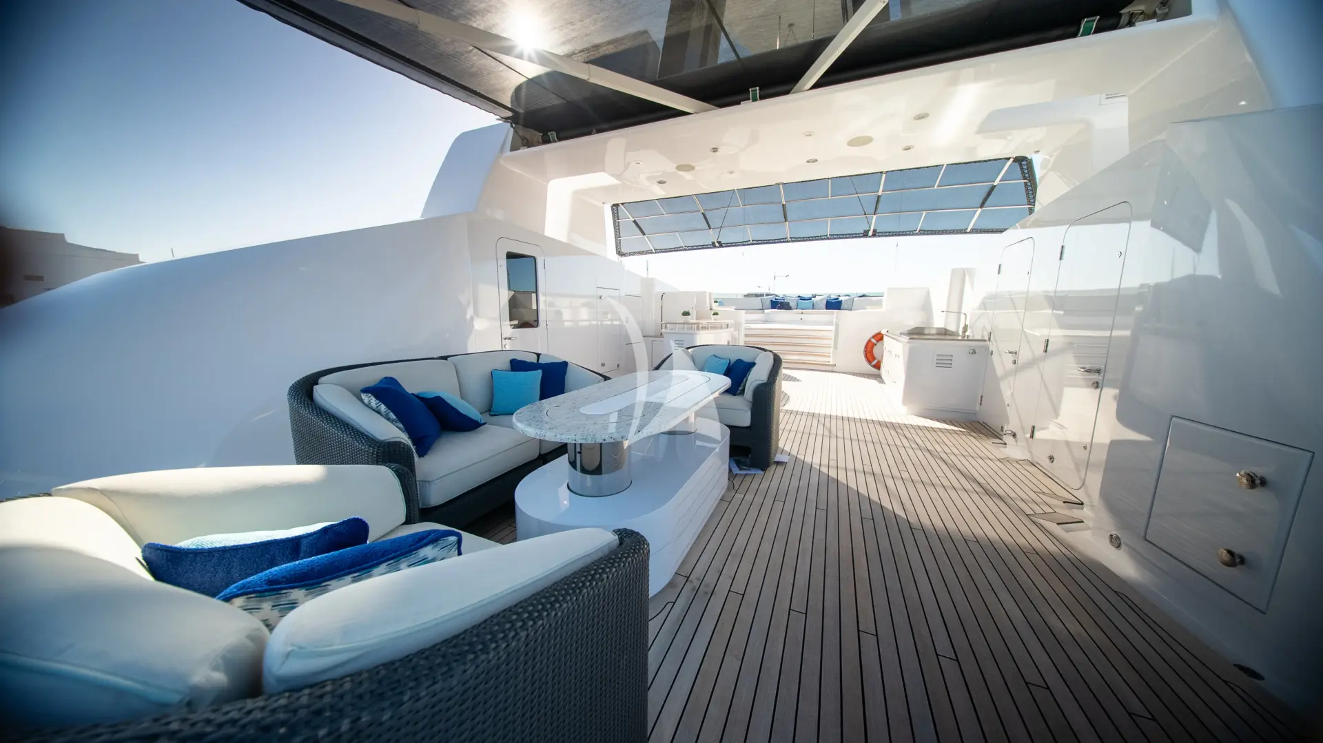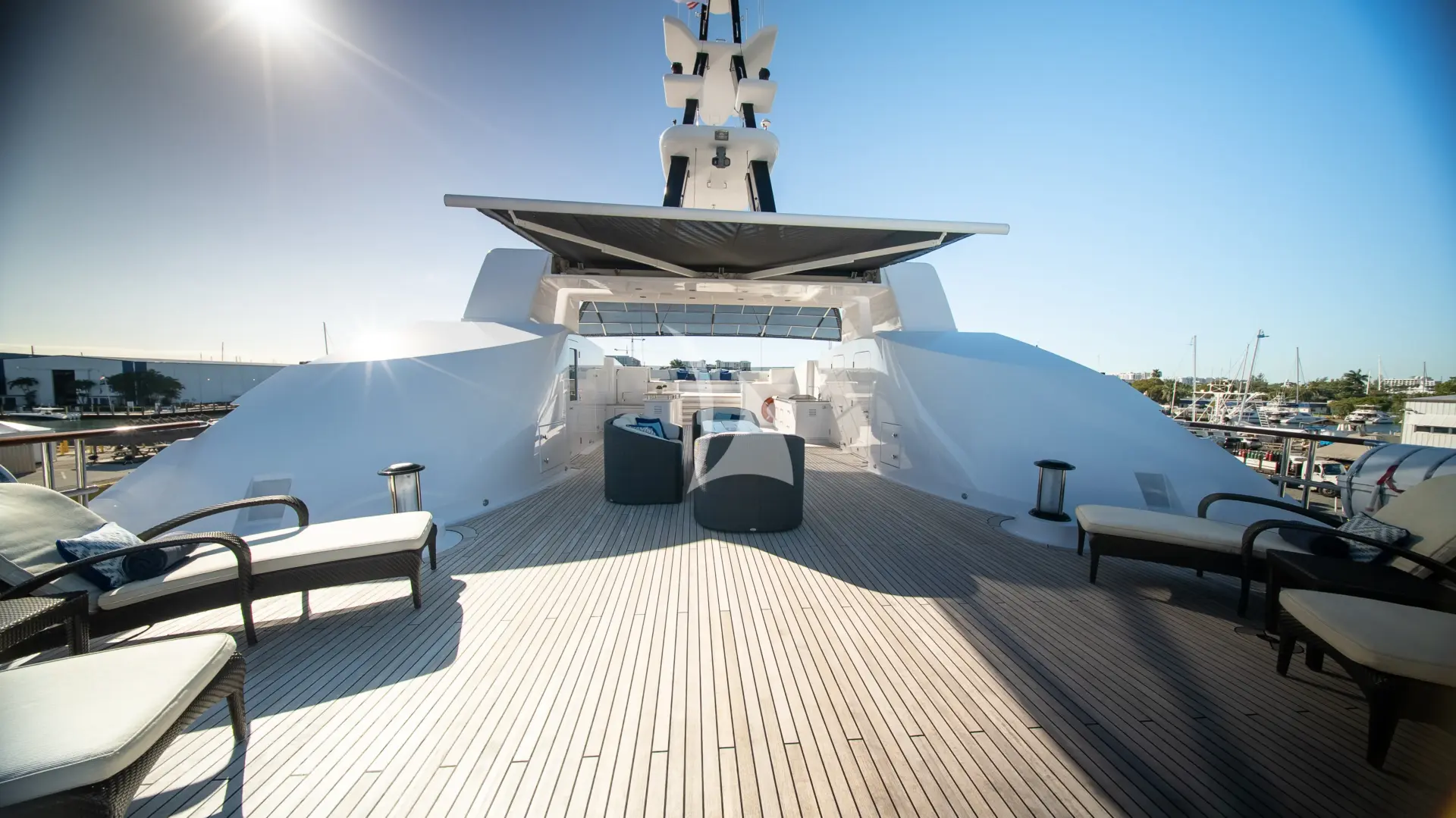 Outdoor living is central to life aboard LUDZIE, and her decks are designed to keep guests outside as much as possible. The main deck aft is expansive yet intimate, with oversized teak chairs arranged in a semi-circle beneath sun shades, and a forward settee flanked by sunpads, ideal for early mornings before the yacht fully comes to life. For alfresco dining, guests can head to the bridge deck aft to enjoy a meal with a view. Above, the already impressive sundeck is set for a major transformation, with a large Jacuzzi being added during spring 2026, complete with bar seating. Combined with lounge chairs, a bar, a day head, and multiple seating areas, this deck becomes the social heart of the yacht.