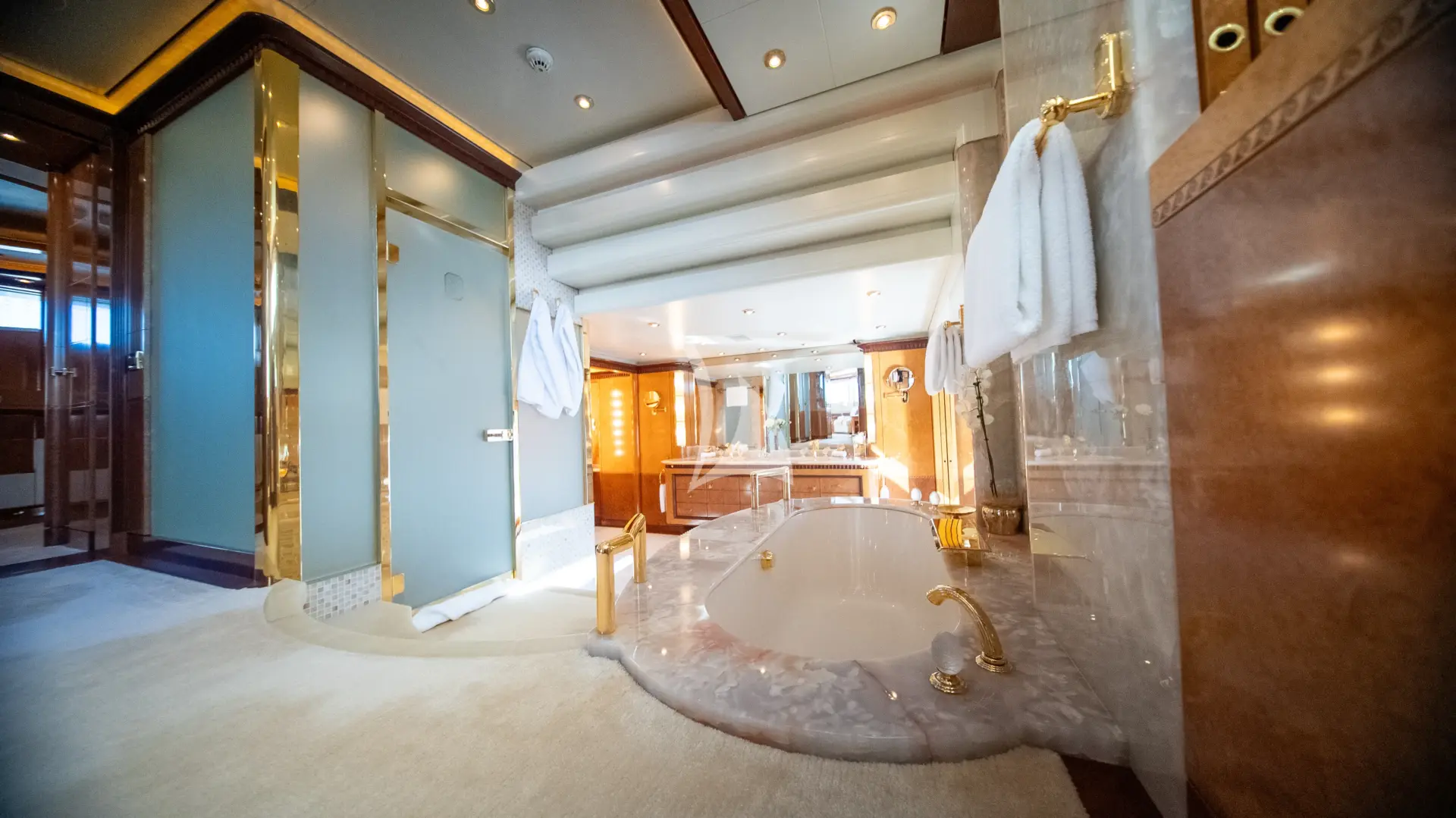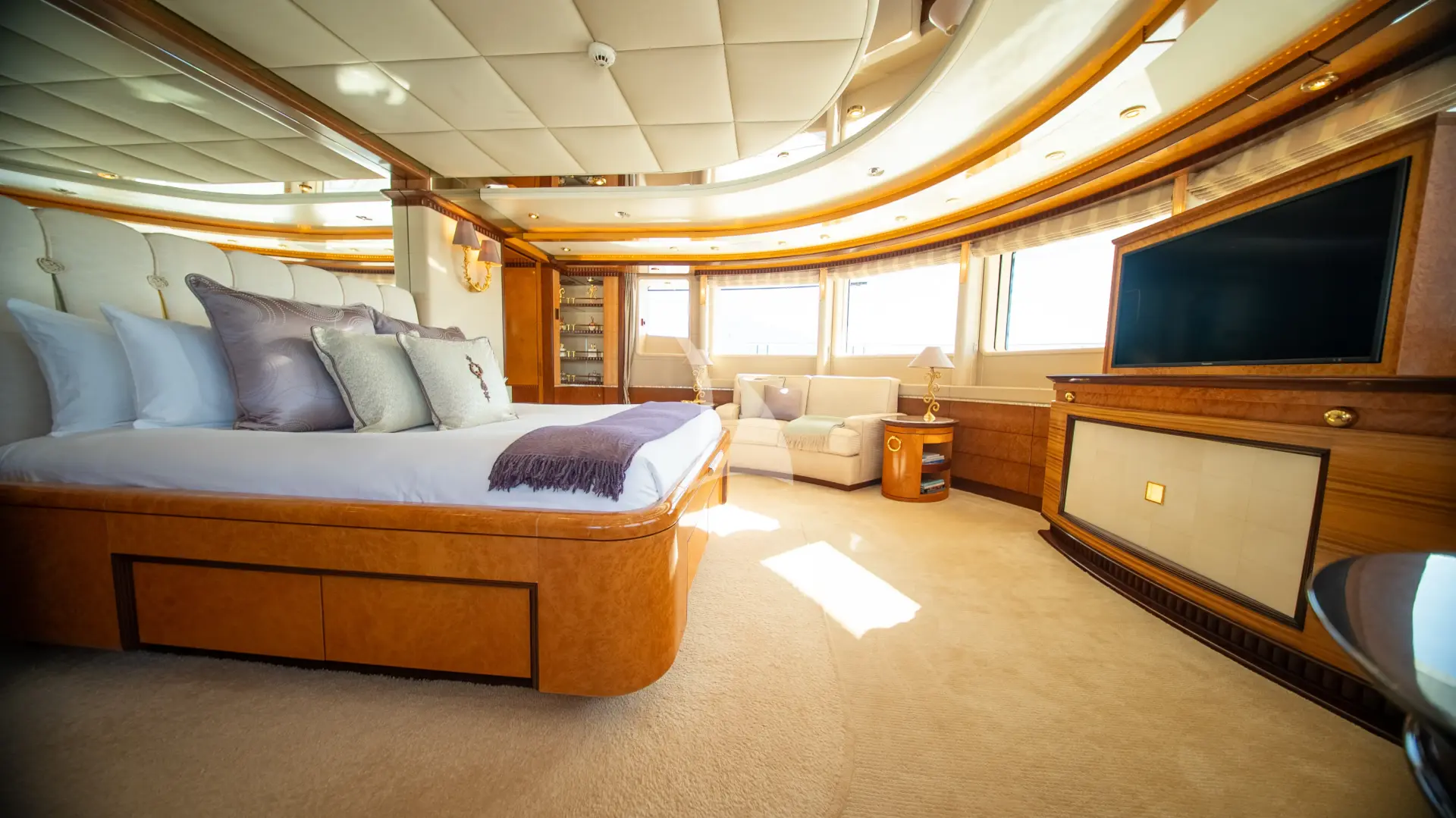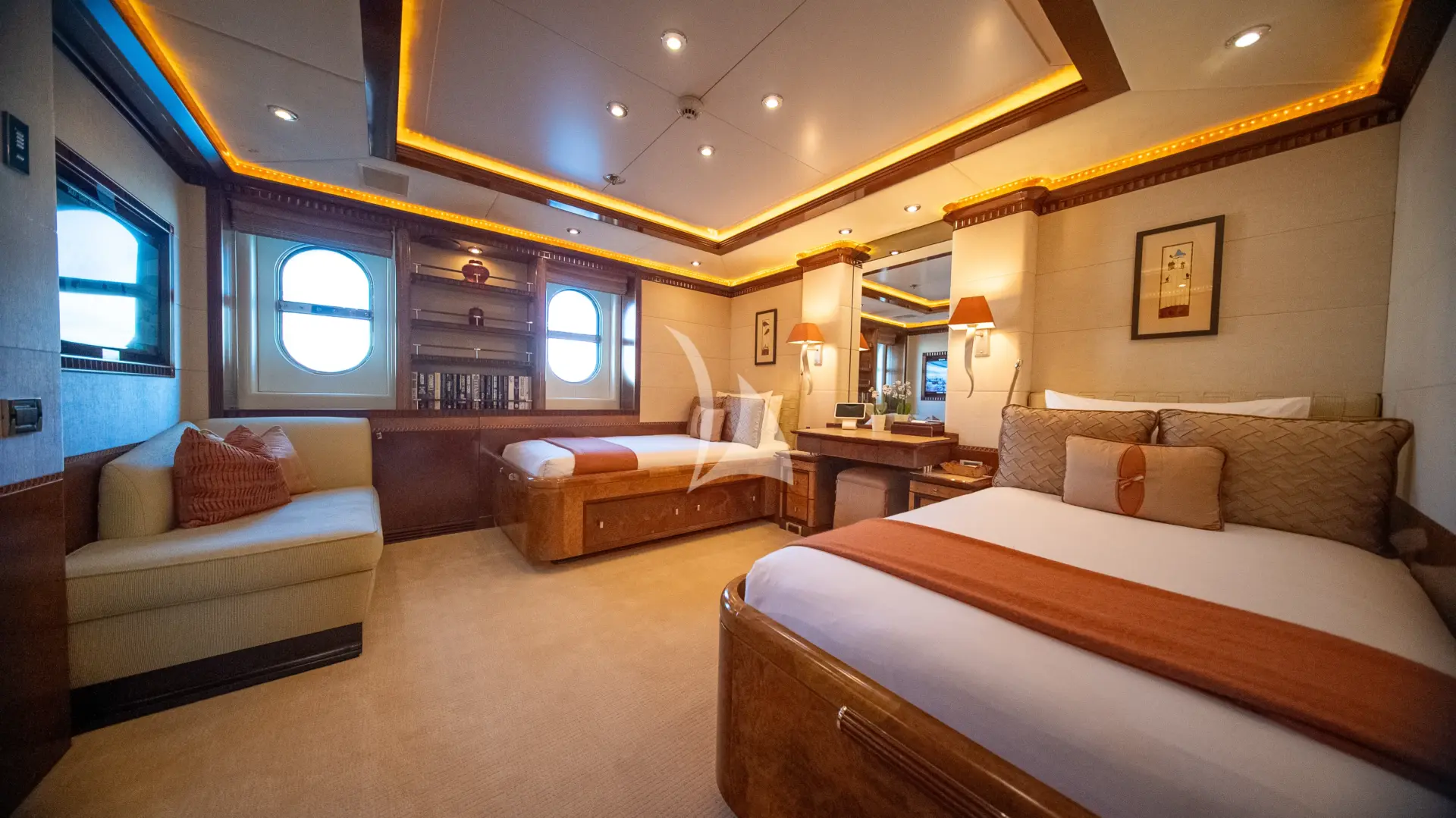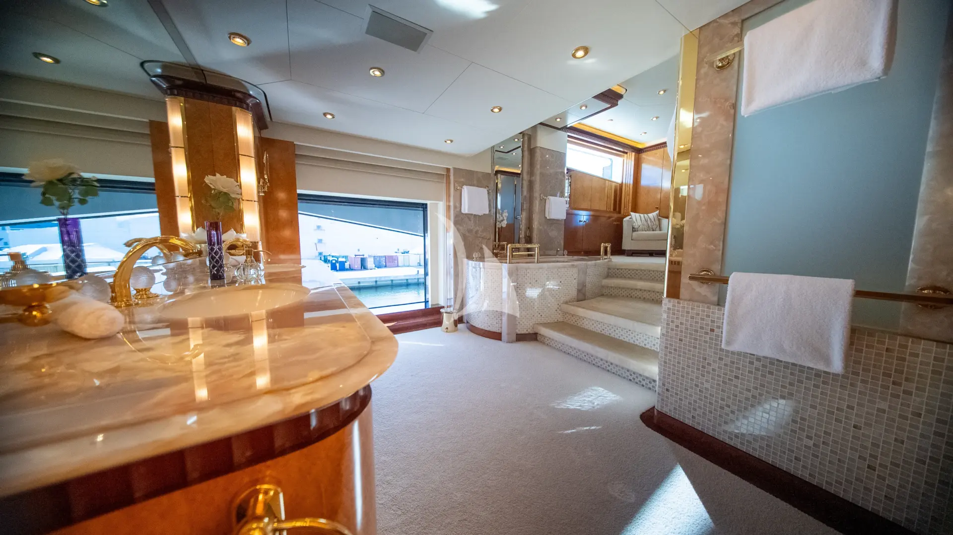 The yacht’s accommodations begin with the primary suite located on the upper deck. Entered through an oversized walk-in dressing room, the suite unfolds into a private sanctuary with a striking split-level en-suite. Here, a marble-clad soaking tub and shower, paired with his-and-her sinks and a large vanity, are framed by a floor-to-ceiling window offering expansive views. The bedroom enjoys sweeping 180-degree views, with a king bed facing forward, a private seating area, and generous lounge space.