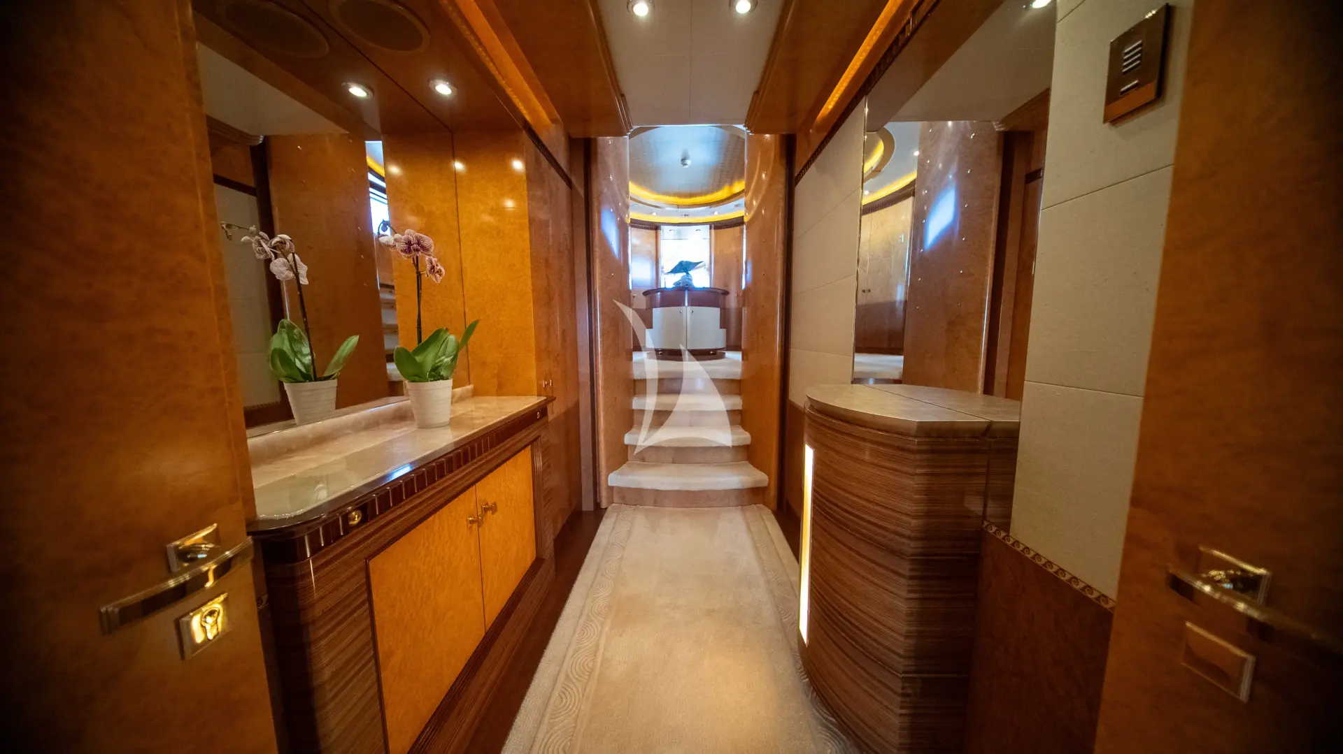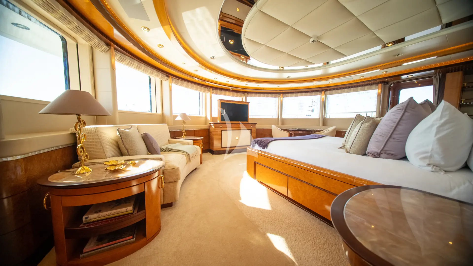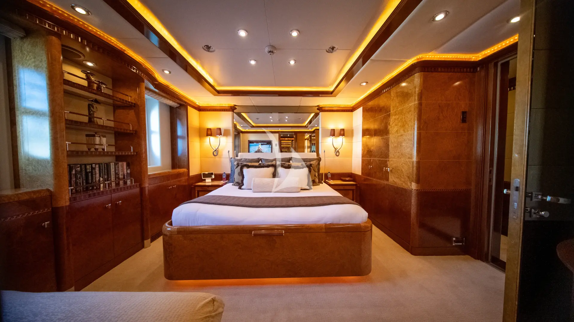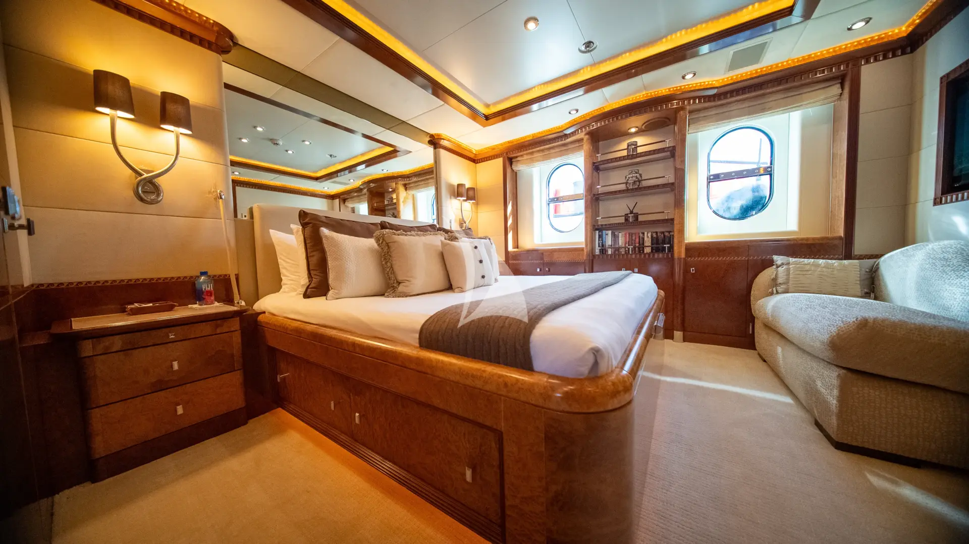 The yacht’s accommodations begin with the primary suite located on the upper deck. Entered through an oversized walk-in dressing room, the suite unfolds into a private sanctuary with a striking split-level en-suite. Here, a marble-clad soaking tub and shower, paired with his-and-her sinks and a large vanity, are framed by a floor-to-ceiling window offering expansive views. The bedroom enjoys sweeping 180-degree views, with a king bed facing forward, a private seating area, and generous lounge space.