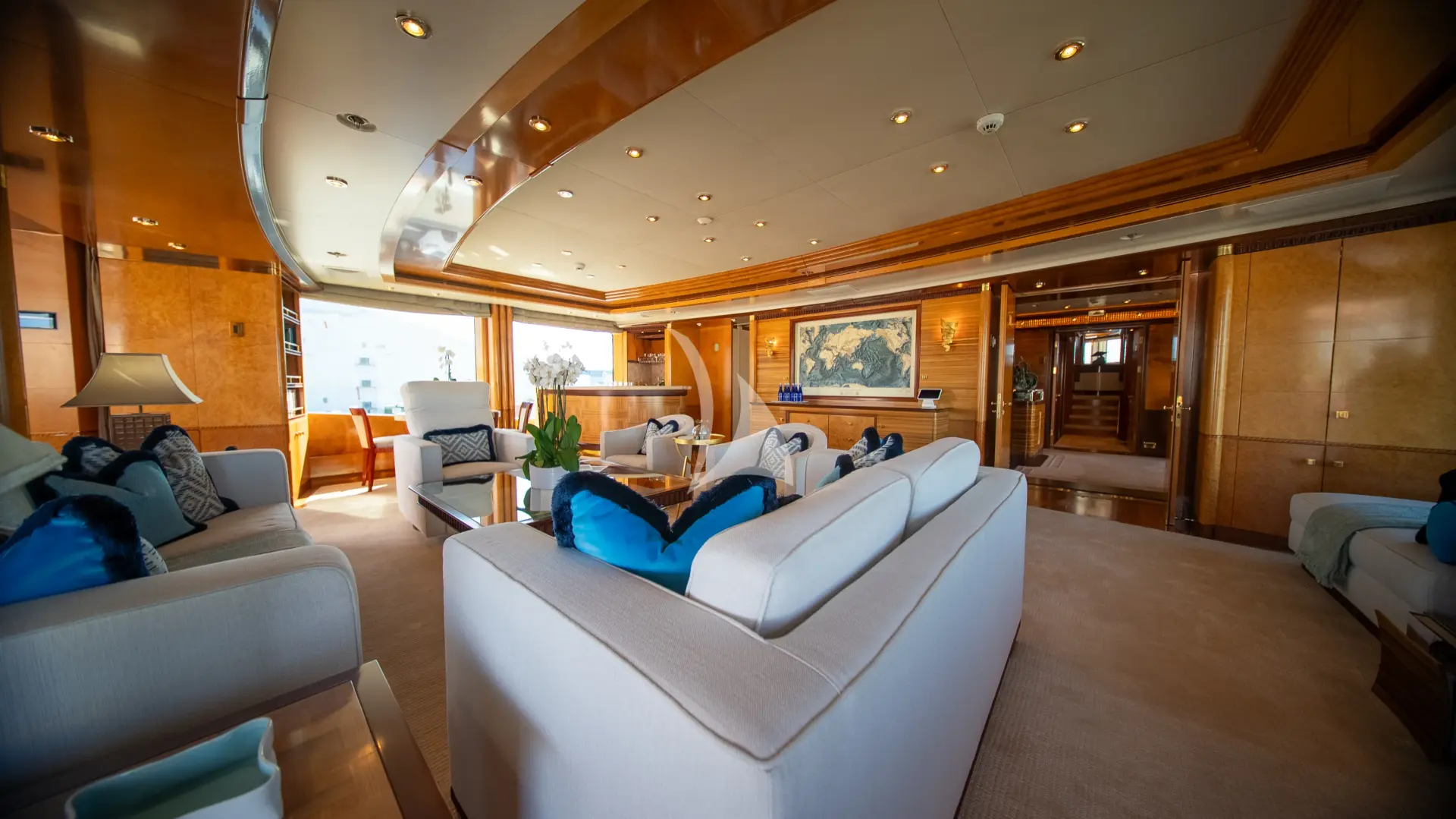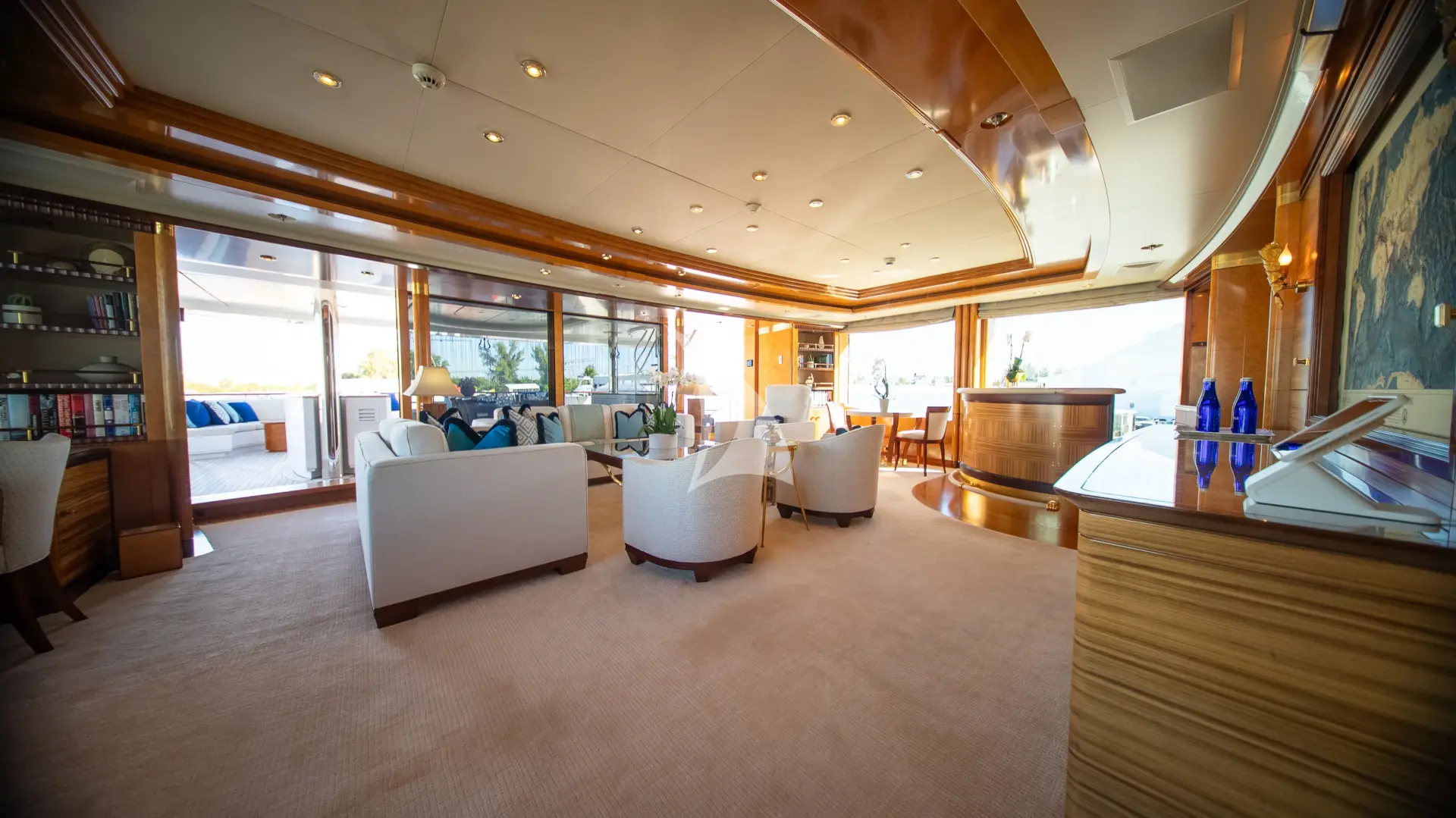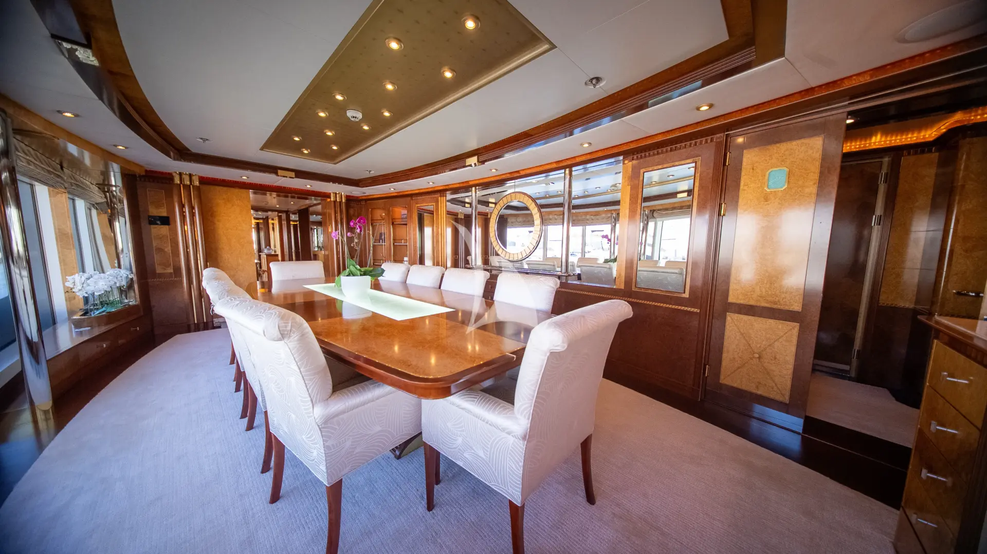Inside, LUDZIE offers spaces designed for gathering and lingering. The main salon is entered through large sliding doors, opening to a thoughtfully layered interior that balances comfort with refinement. A bar to port, desk area to starboard, and a relaxed seating arrangement anchored by a sofa, chairs, and a games table create a space that easily shifts from daytime conversation to evening cocktails. Forward, the enclosed formal dining room on the main deck feels light and spacious thanks to floor-to-ceiling windows, mirrored detailing, and a large wooden table seating 10, offering an elegant setting that still feels inviting and unforced.