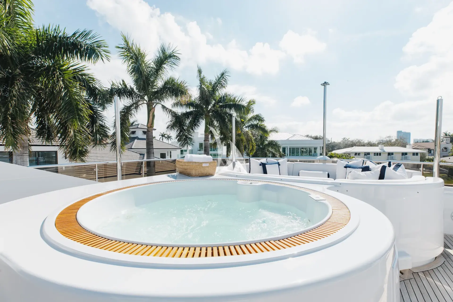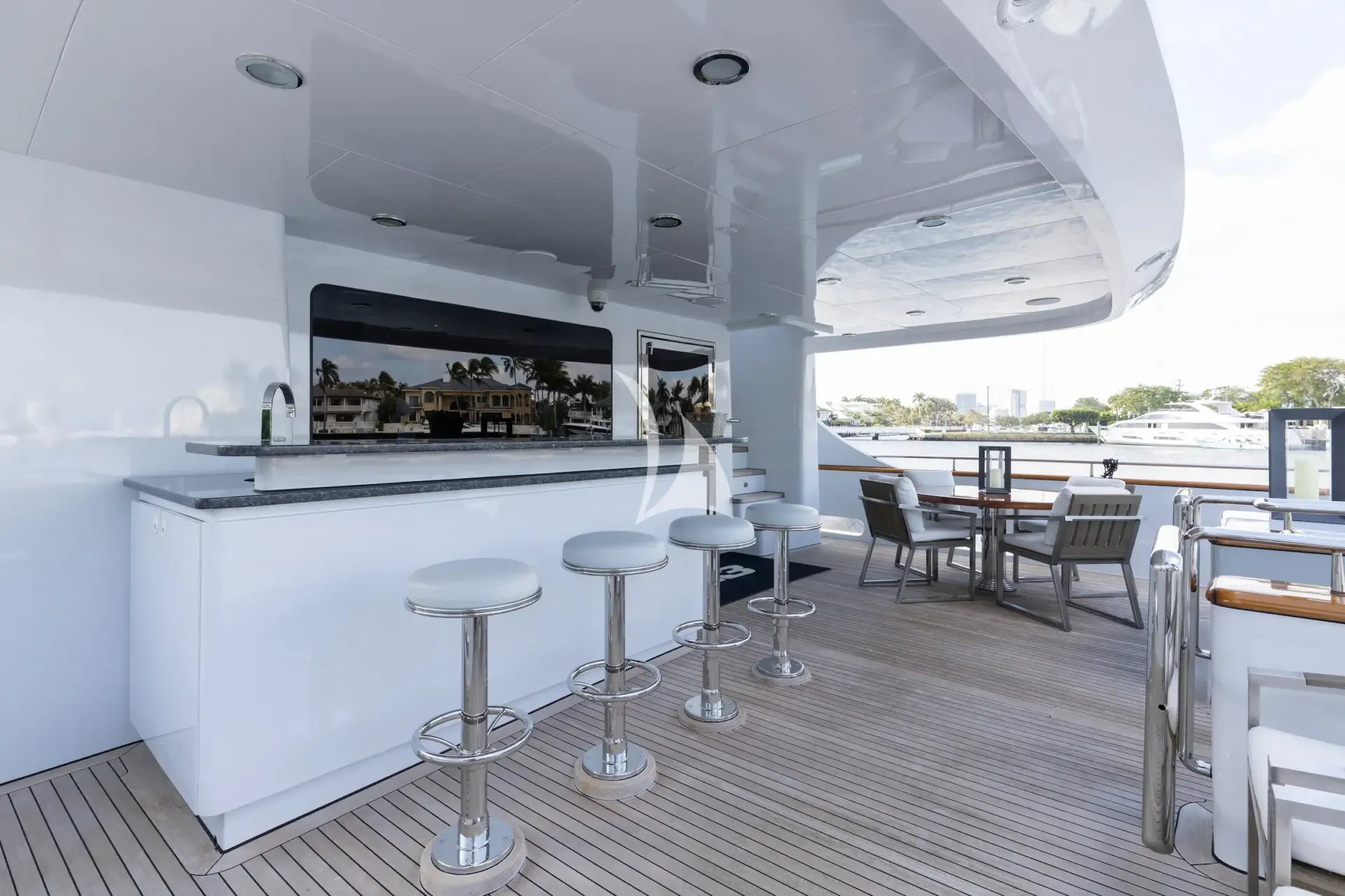 Moving up to the sundeck, you'll find a custom design and layout not found on any other yacht on the charter market! Along all new teak decks laid in 2018, M3 has a thoughtfully and recently redesigned the space with a variety of sunning options and seating, a central dining table, seated bar and Jacuzzi. Guests who may want more shade than sun which can easily be accommodated by the multiple sail shades above.
