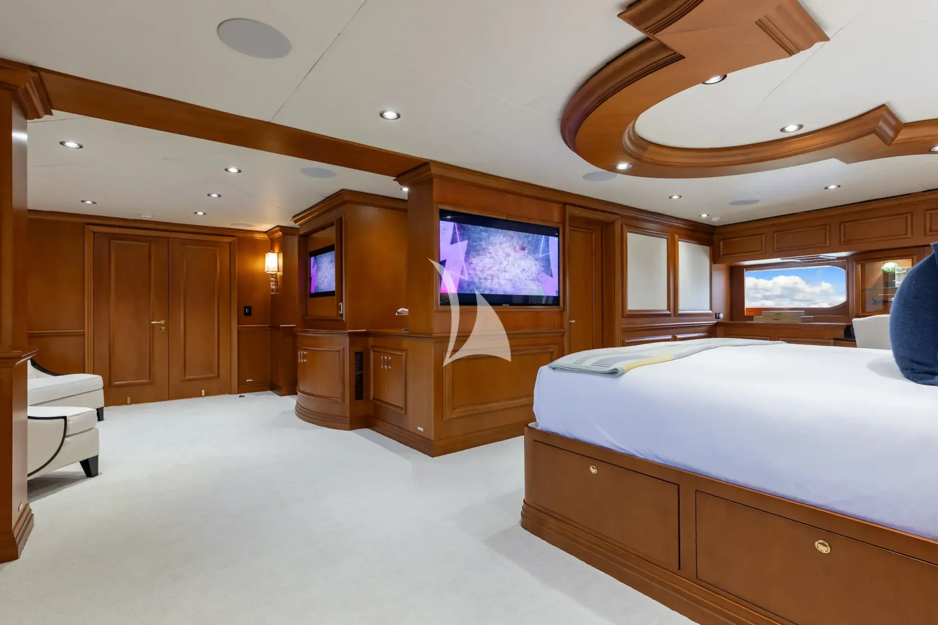The private master stateroom located on the main deck features a luxurious king size bed, large 3D flatscreen TV along with an adjacent private sitting room with sofa, chairs and TV. The large, his and her bath features marble and granite, a massive central shower and Jacuzzi tub.