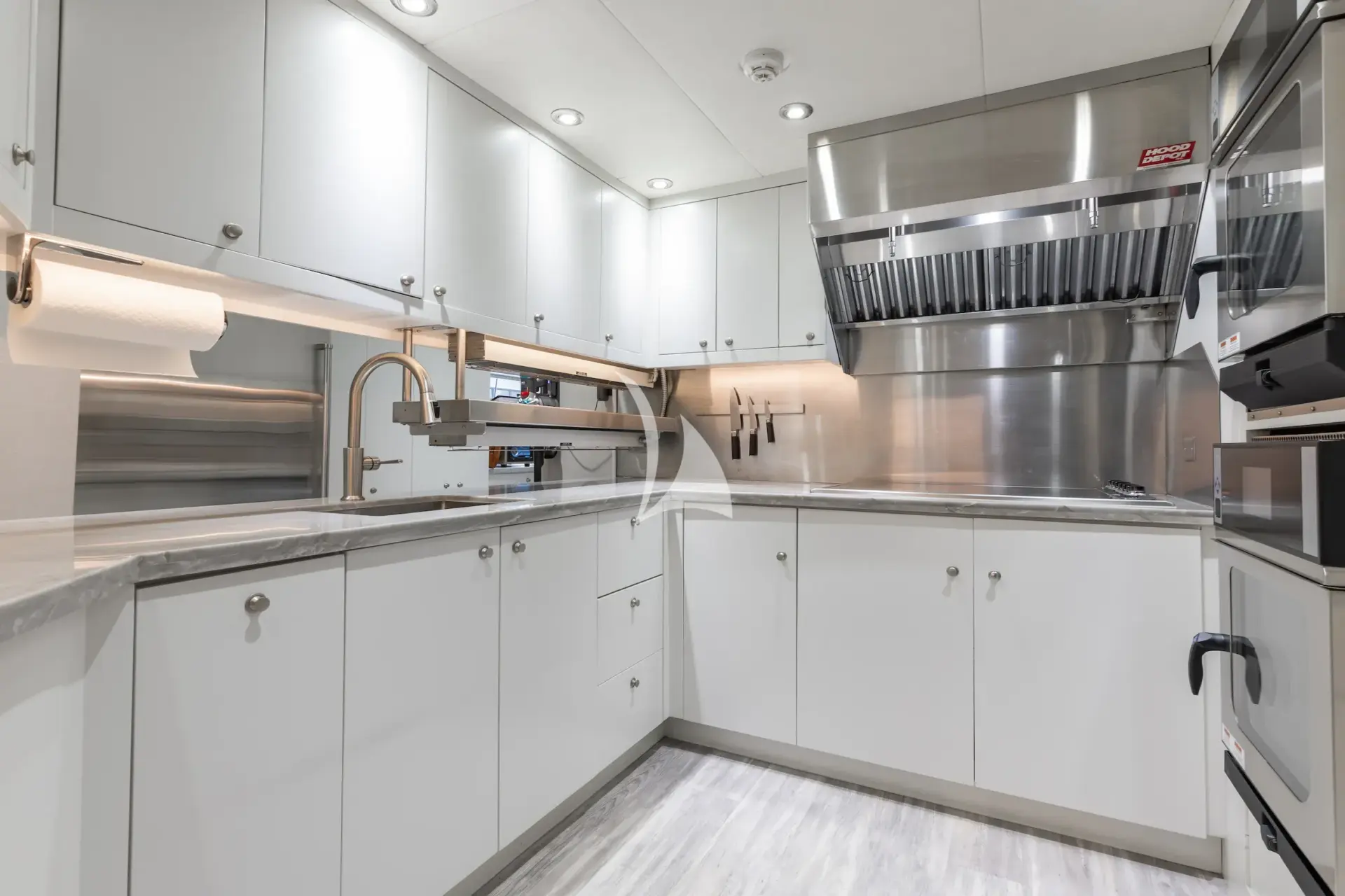 The four guest staterooms below include a large VIP stateroom with king size bed, two queen staterooms, and a twin stateroom. Each guest stateroom features ample space and private baths finished in marble, custom wall coverings, his and her sinks and custom fixtures.